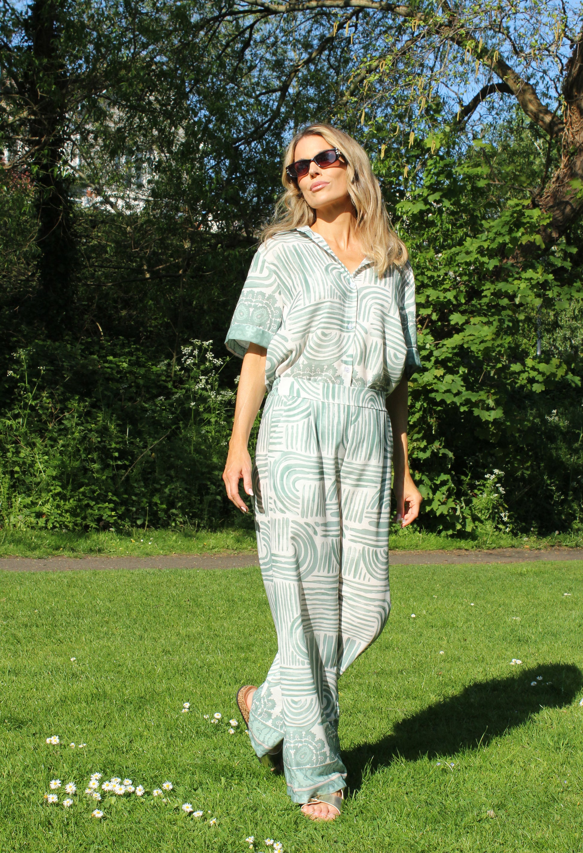 Lifestyle Image- Light Khaki: Trousers, Sandals, Sunglasses