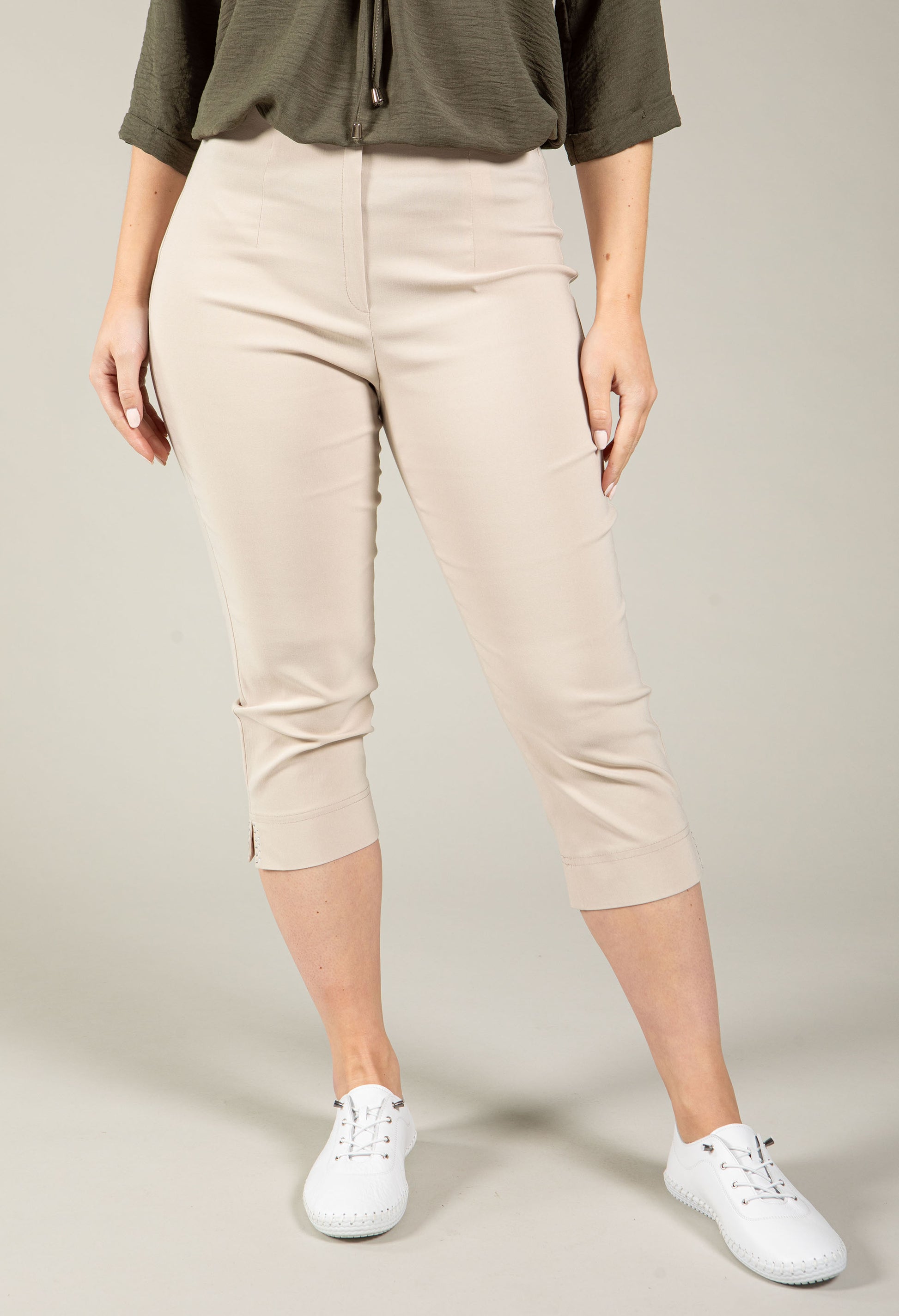 Elevate your casual wardrobe with these flattering capri trousers featuring a high-rise cut that elongates the silhouette. The knee-length design pairs effortlessly with sandals, while subtle diamante accents add a touch of sparkle. Crafted from stretch fabric for all-day comfort, the convenient pull-on style means no fussing with zips or buttons. Perfect for warm weather styling with minimal effort.