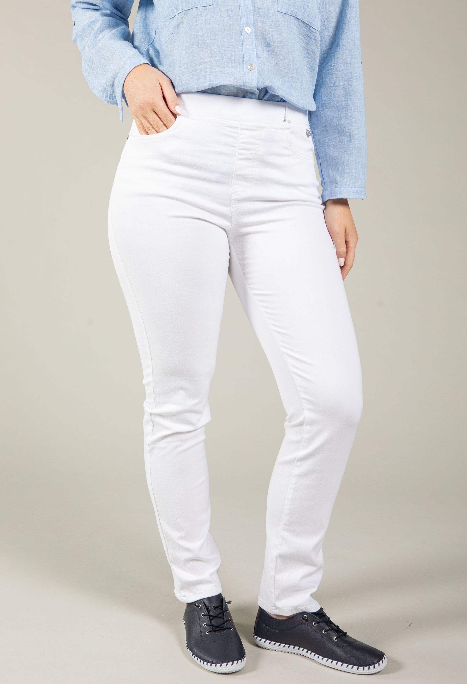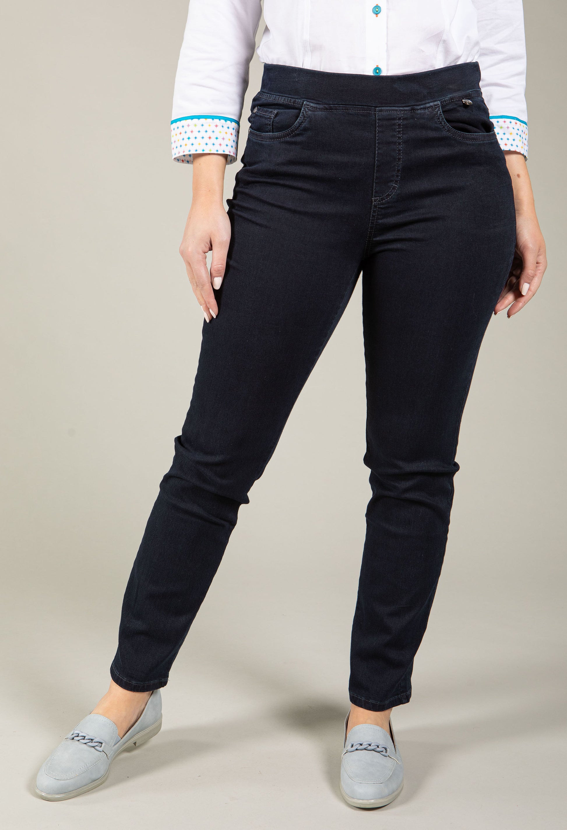 Experience everyday comfort in these slim fit jeans crafted with a stretch fabric that moves with you. The elasticated waistband and pull-on style make getting dressed effortless, while the classic five-pocket design keeps your essentials close. Perfect for a relaxed look.