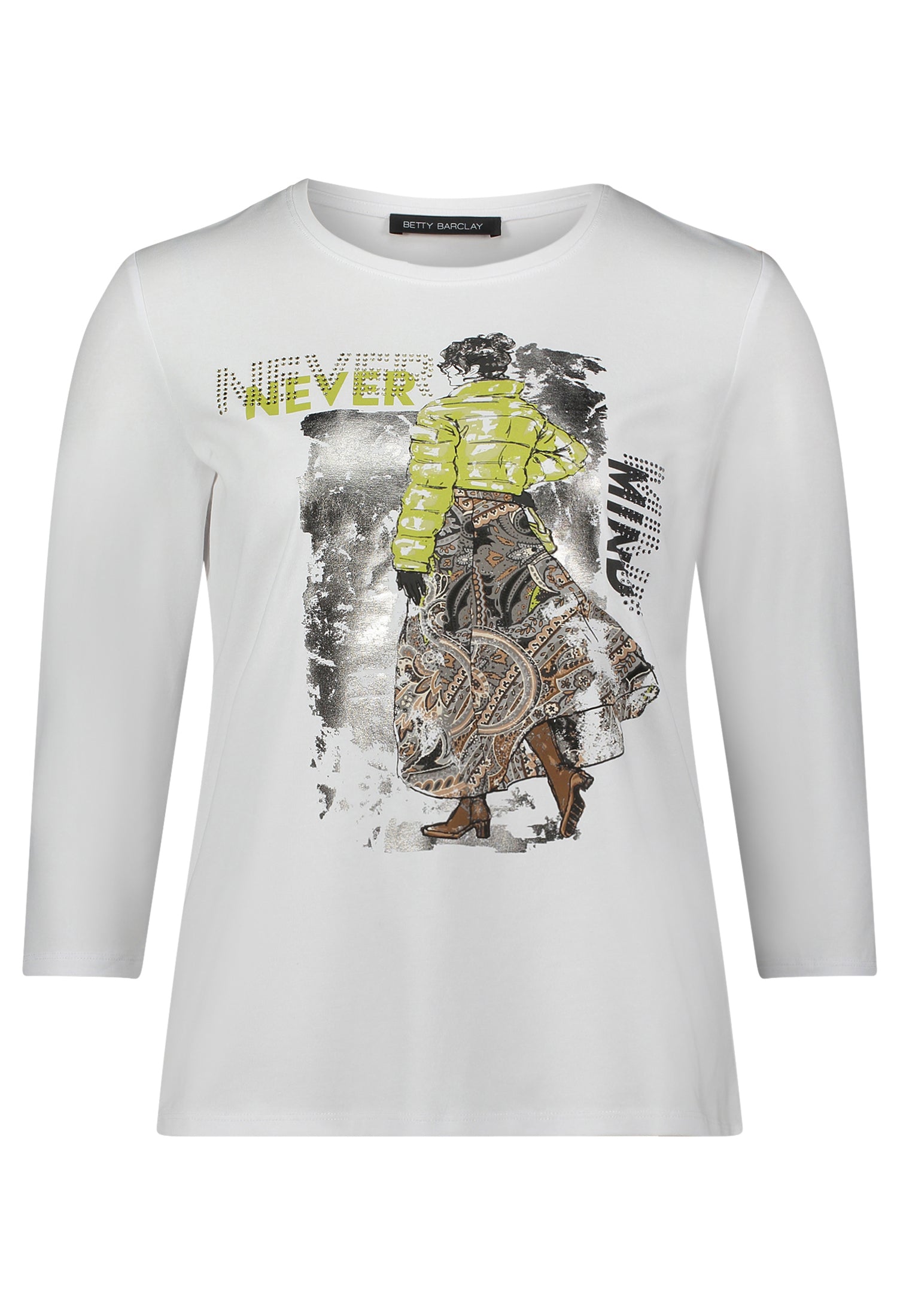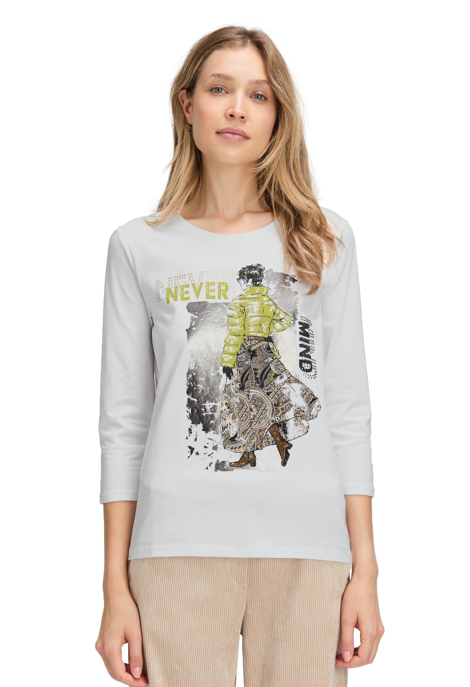 This fitted top measures 64 cm in length and features 3/4-length sleeves for versatile wear. Made from comfortable jersey fabric, it boasts a classic round neckline and a carefully positioned graphic design for a modern, stylish touch.
