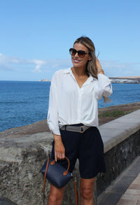 Lifestyle Image- Navy: Blouse, Sunglasses, Bag