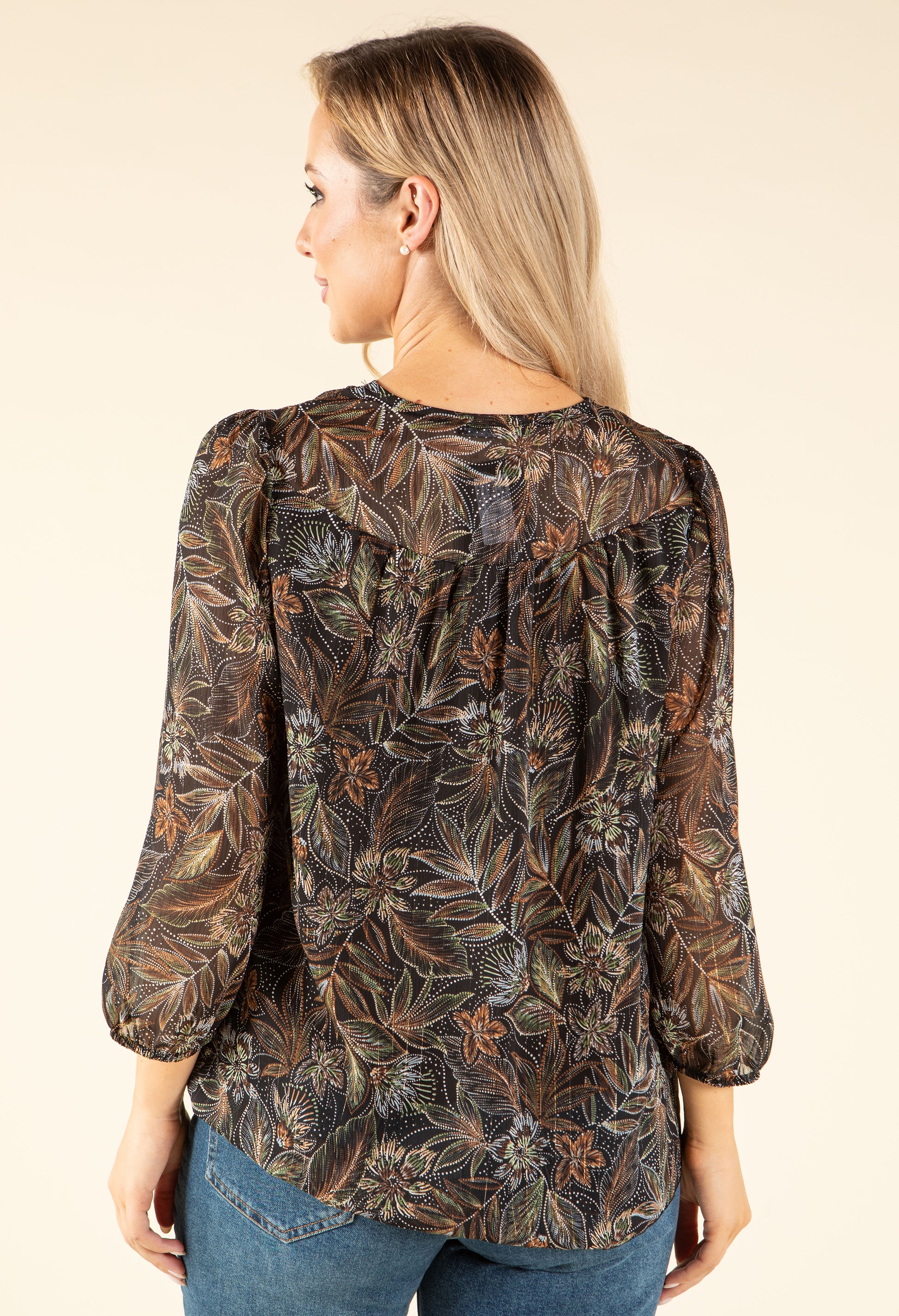 This elegant top features a flattering V neckline, sheer sleeves with elasticated cuffs, and a beautiful botanical print. Fully lined for comfort.