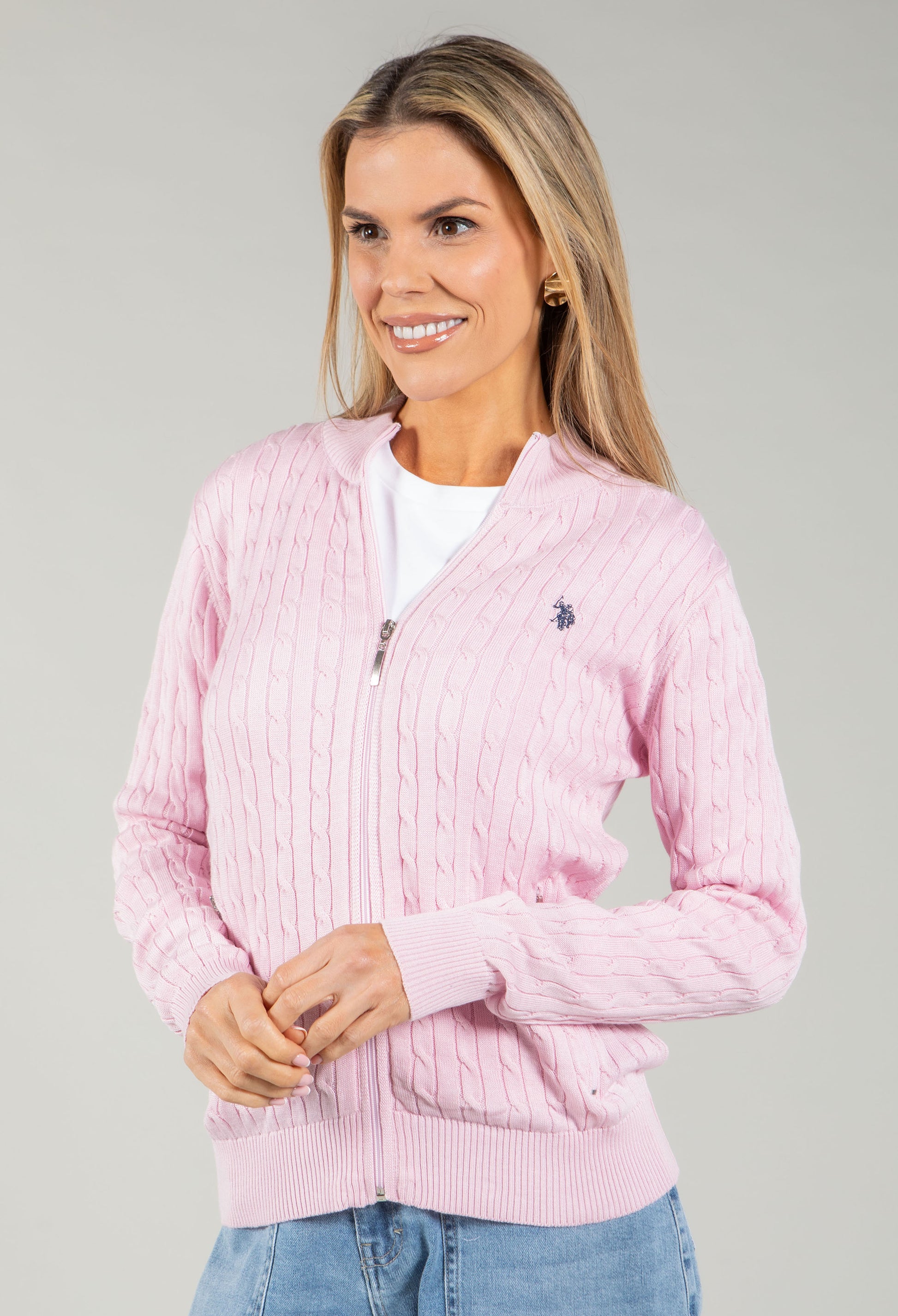 Crafted from a comfortable cotton blend, this zip-up cardigan features a striking cable knit texture with an embroidered logo detail. The high neckline and long sleeves provide warmth, while practical side pockets keep your essentials close. Ribbed finishes at the cuffs, hem, and neckline ensure a polished fit that moves with you throughout the day.