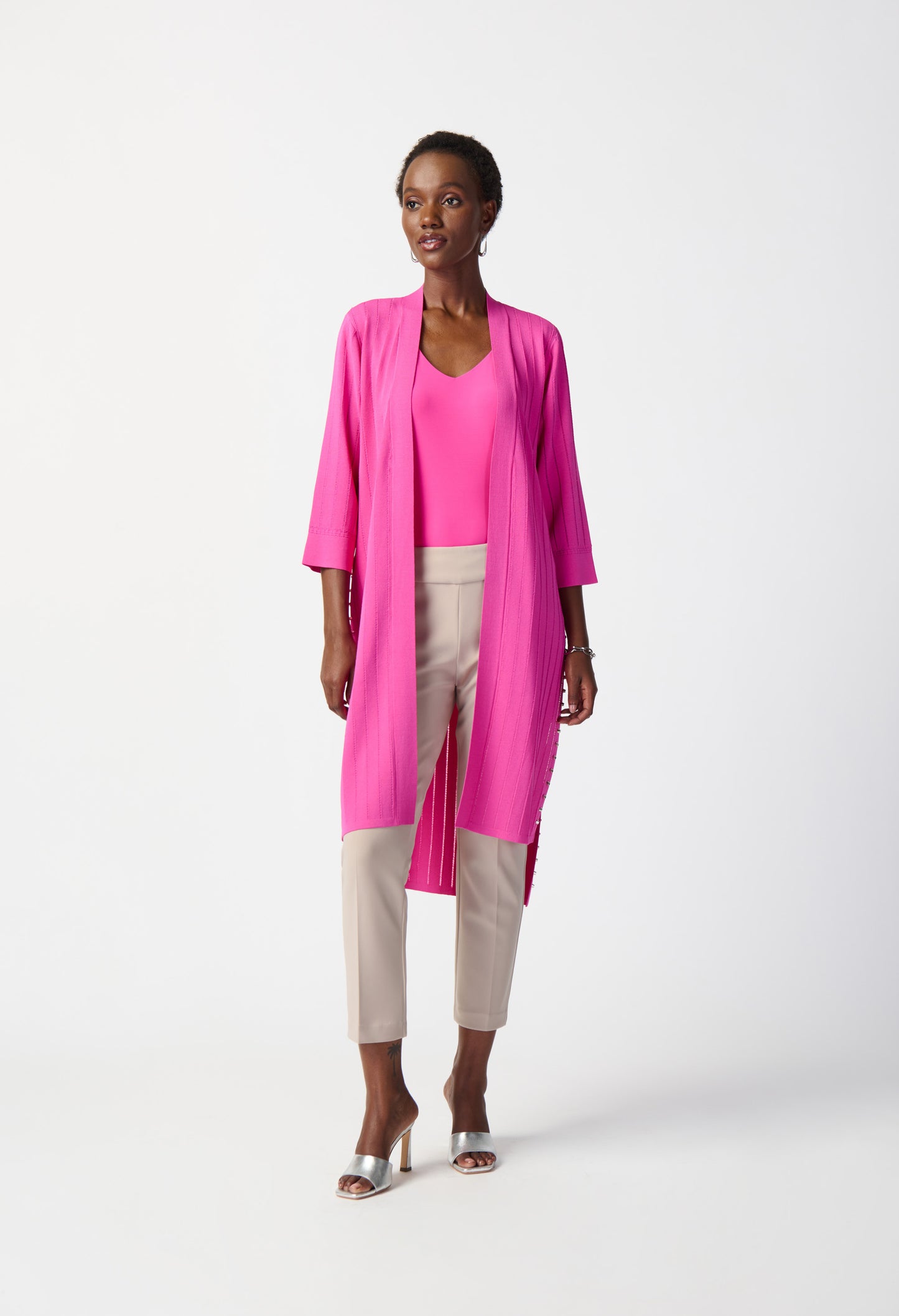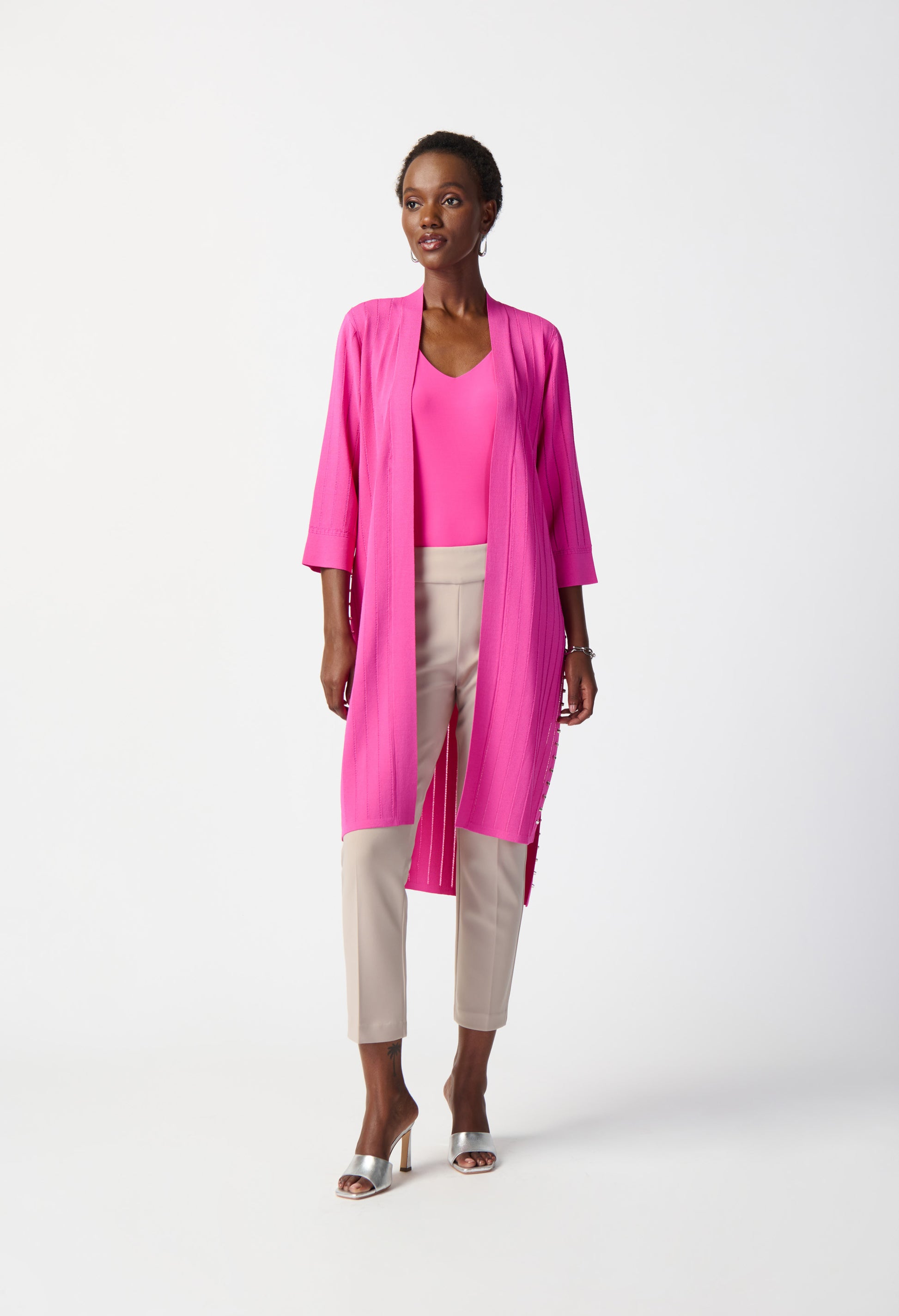 Discover the ultimate blend of comfort and style with the Joseph Ribkoff pullover. This fitted, hip-length piece features a flattering v-neck and sleeveless design, perfect for casual summer occasions. The plain pattern adds a chic touch to any outfit, making it a versatile addition to your wardrobe. Ideal for those seeking a sleek, casual look with a touch of sophistication.