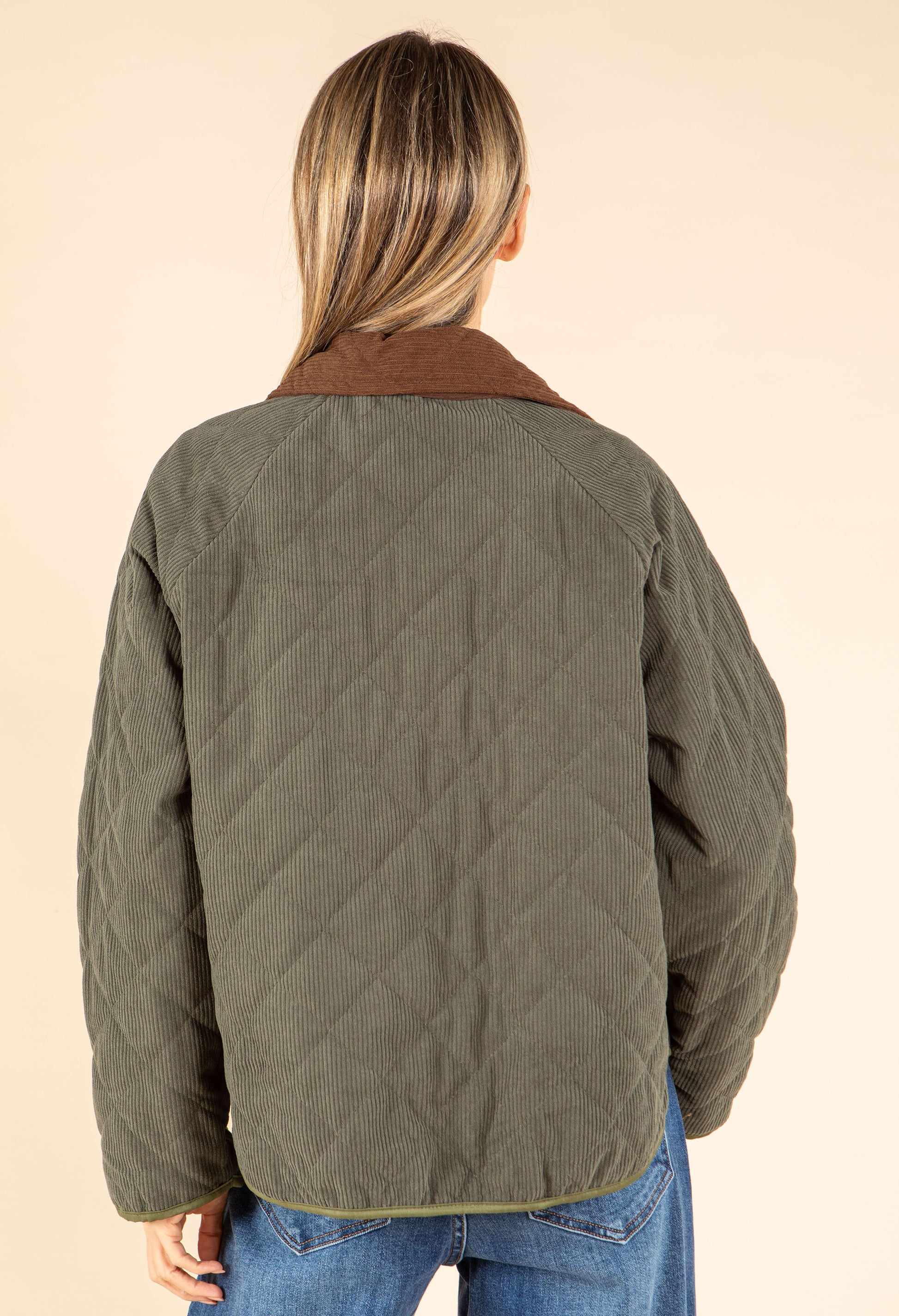 Stay warm and stylish in this Corduroy Quilted Jacket, featuring a soft textured finish and a chic contrast collar. Designed with button closure and front pockets, it’s the perfect blend of comfort and everyday sophistication.