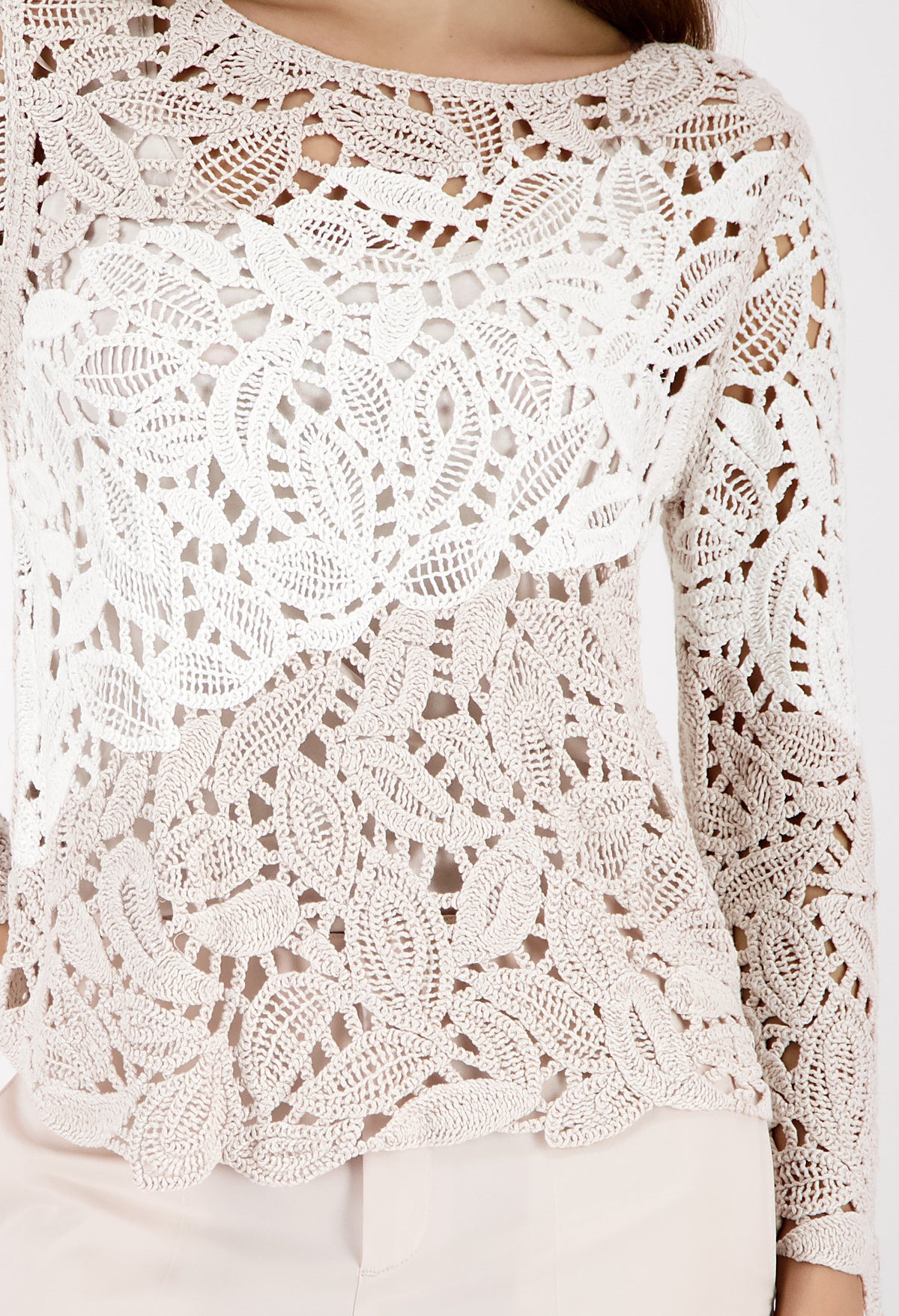 A stylish sweater made of 100% viscose with an elegant cornelli texture, round neckline, and ⅞ sleeves for modern look
