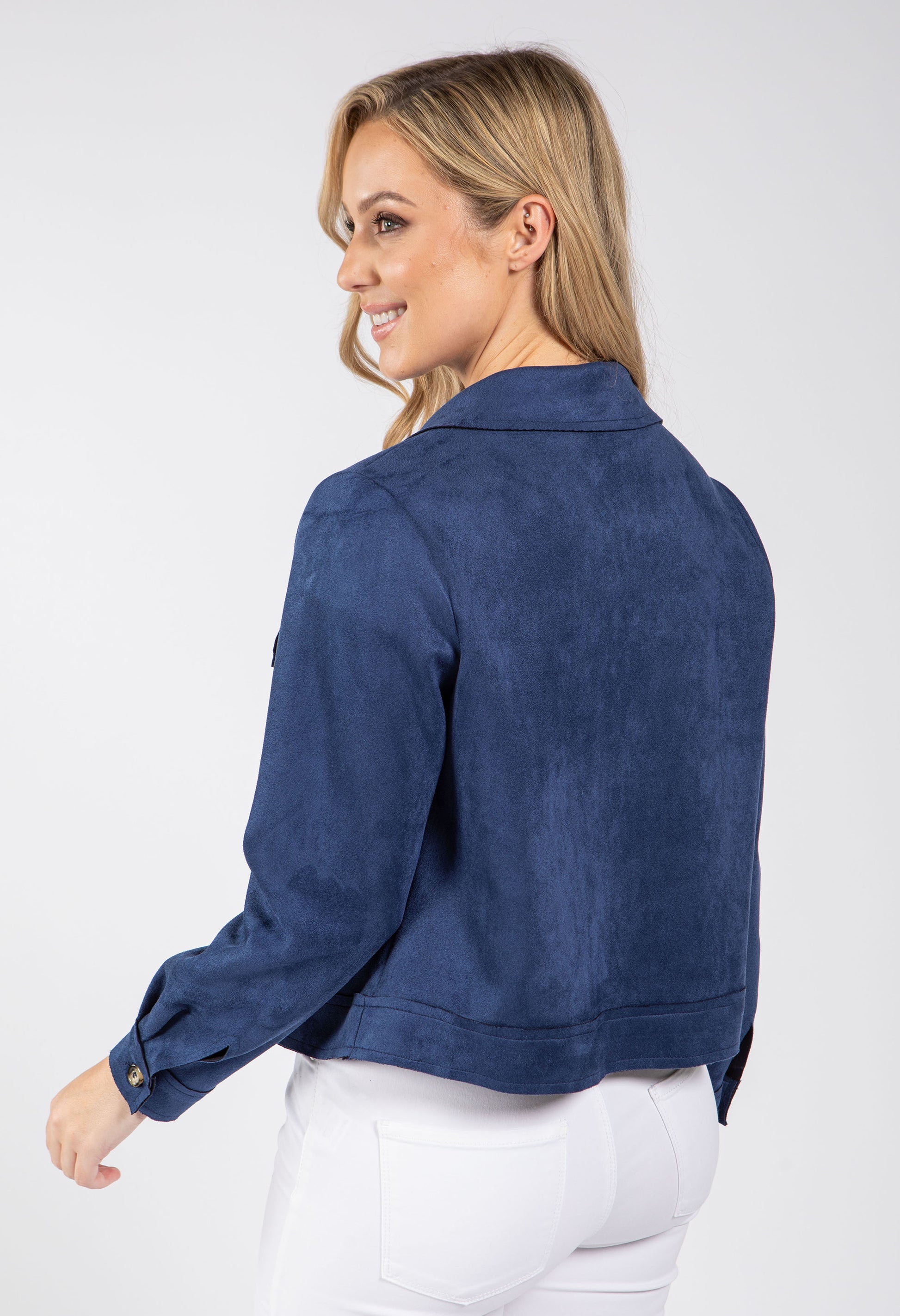Crafted from luxuriously soft faux suede, this cropped jacket combines timeless style with everyday comfort. Featuring a classic collar, long sleeves with buttoned cuffs, and a convenient button closure, it's designed for effortless layering. Practical front patch pockets add functionality to this wardrobe essential.