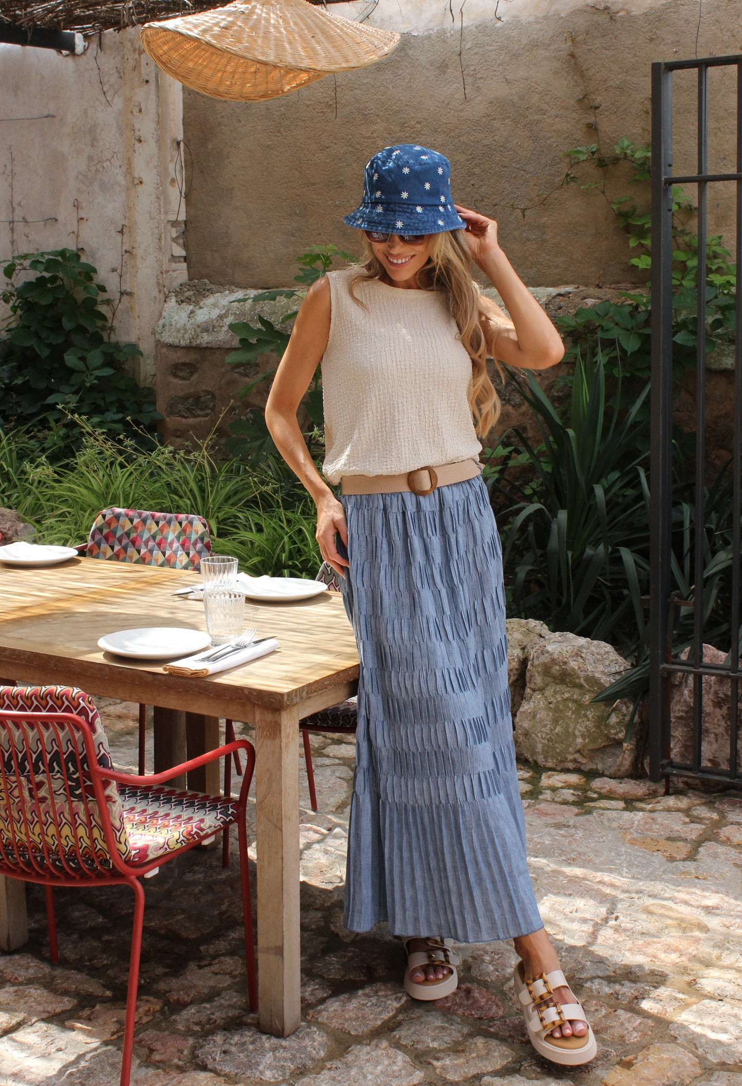 Lifestyle Image- Blue: Top, Sandals, Hat