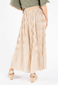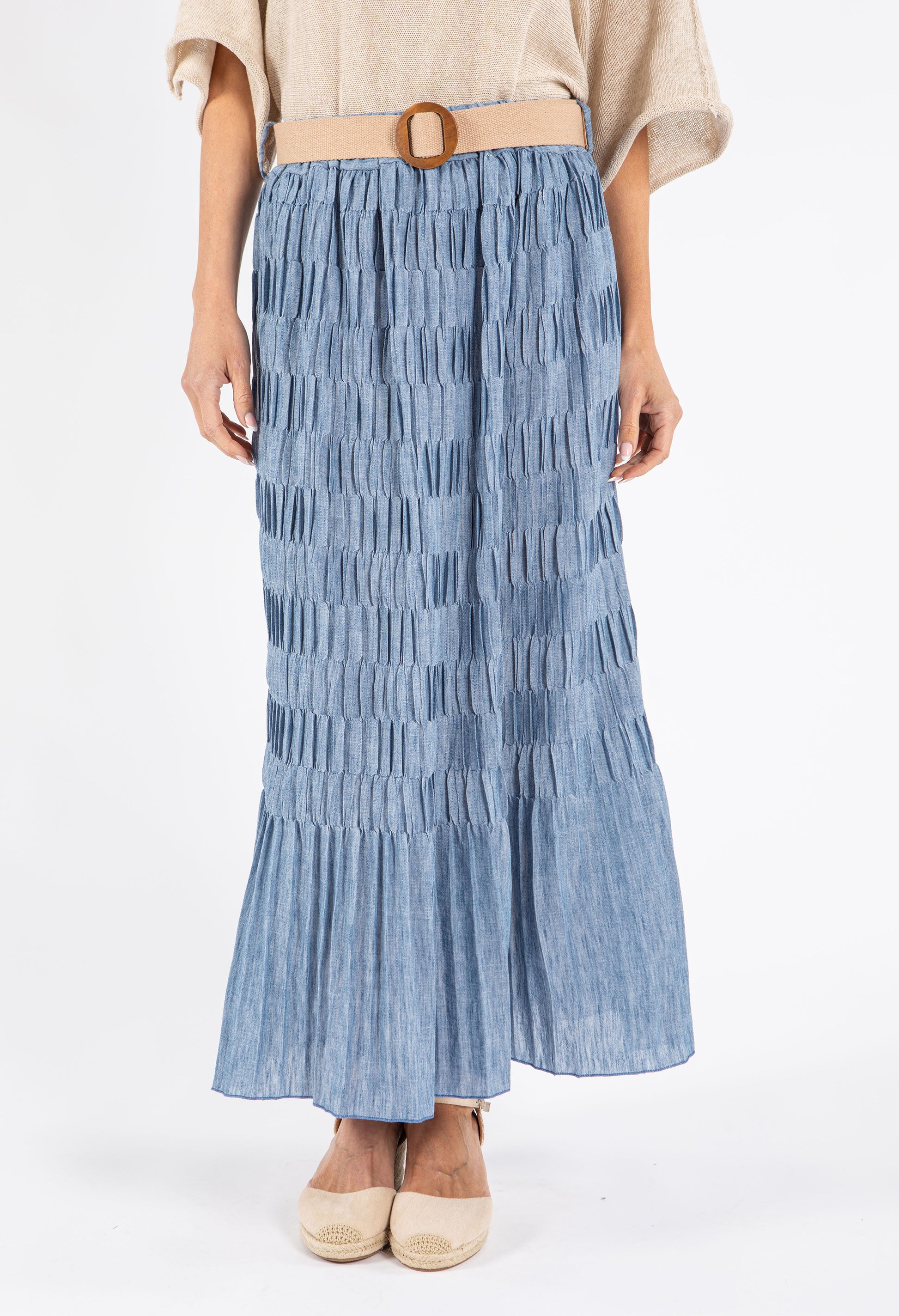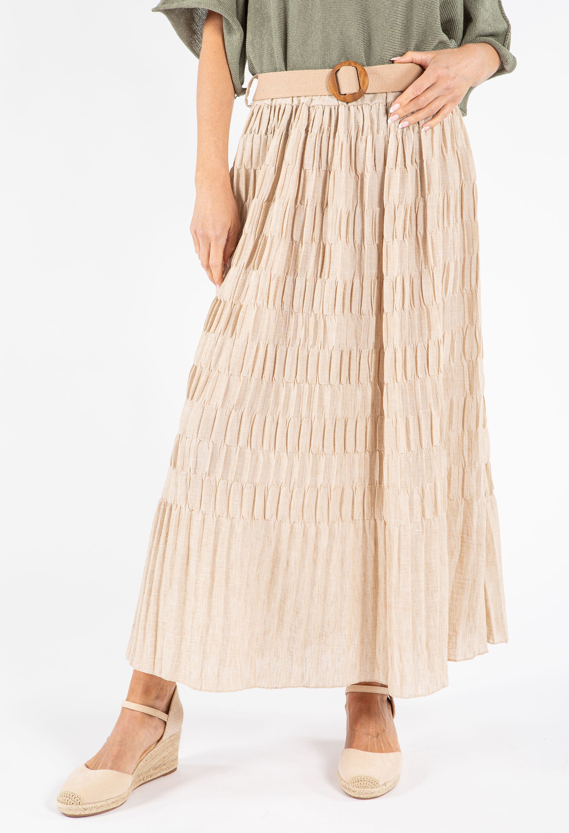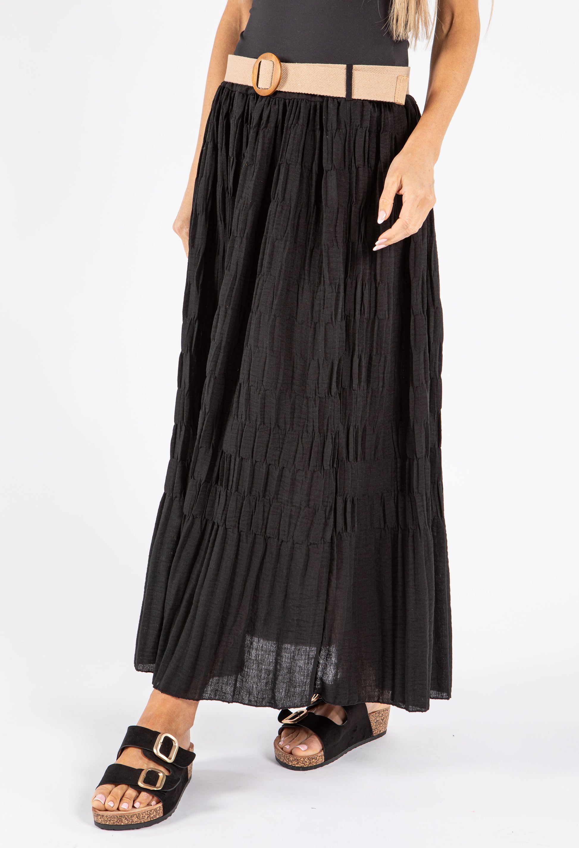 This elegant maxi skirt features a distinctive crinkle texture and comes with a stylish belt to define your waistline. The convenient pull-on design ensures effortless dressing, while the breathable fabric keeps you comfortable all day long. With its versatile free size that accommodates UK sizes 10-14, this skirt offers both fashion and functionality for various occasions.