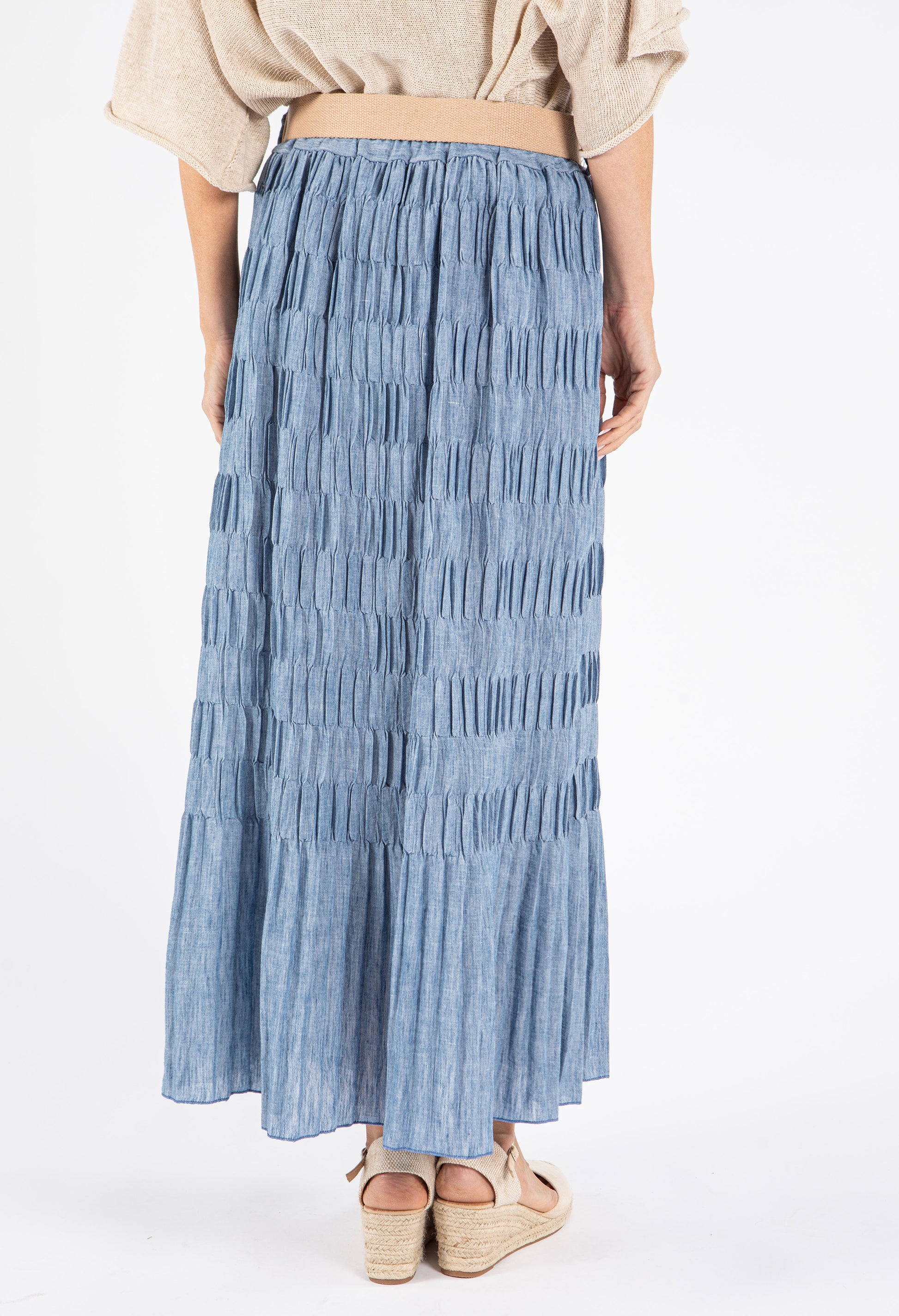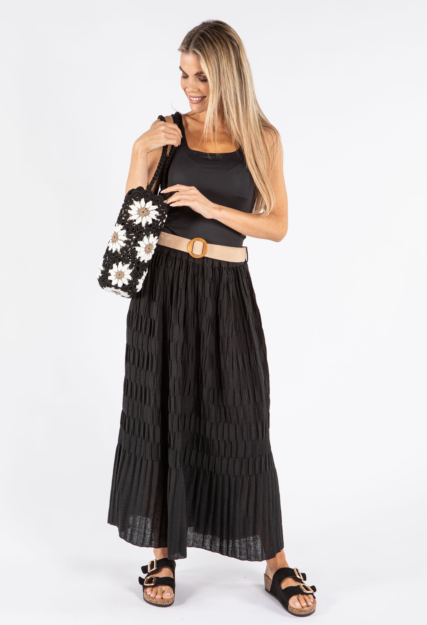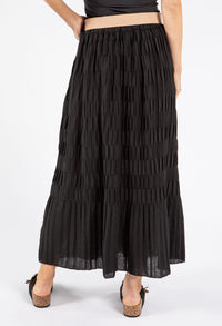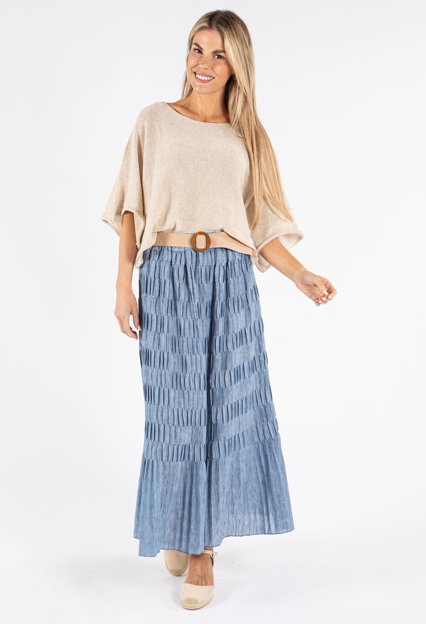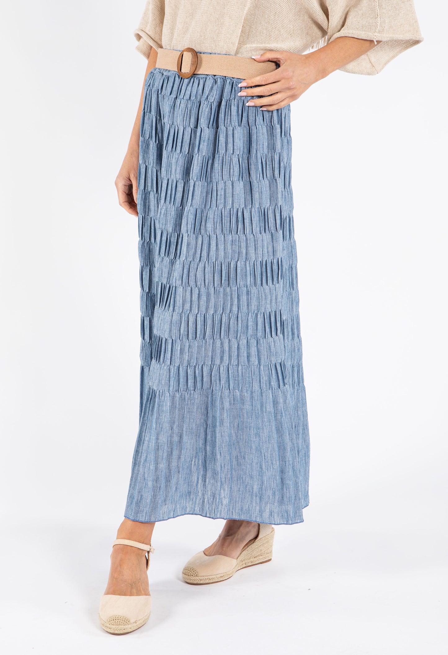 This elegant maxi skirt features a distinctive crinkle texture and comes with a stylish belt to define your waistline. The convenient pull-on design ensures effortless dressing, while the breathable fabric keeps you comfortable all day long. With its versatile free size that accommodates UK sizes 10-14, this skirt offers both fashion and functionality for various occasions.