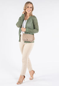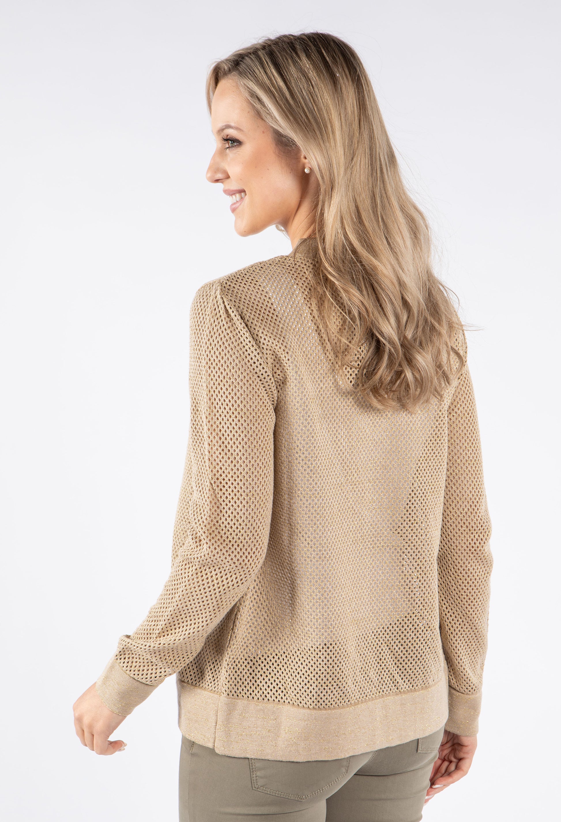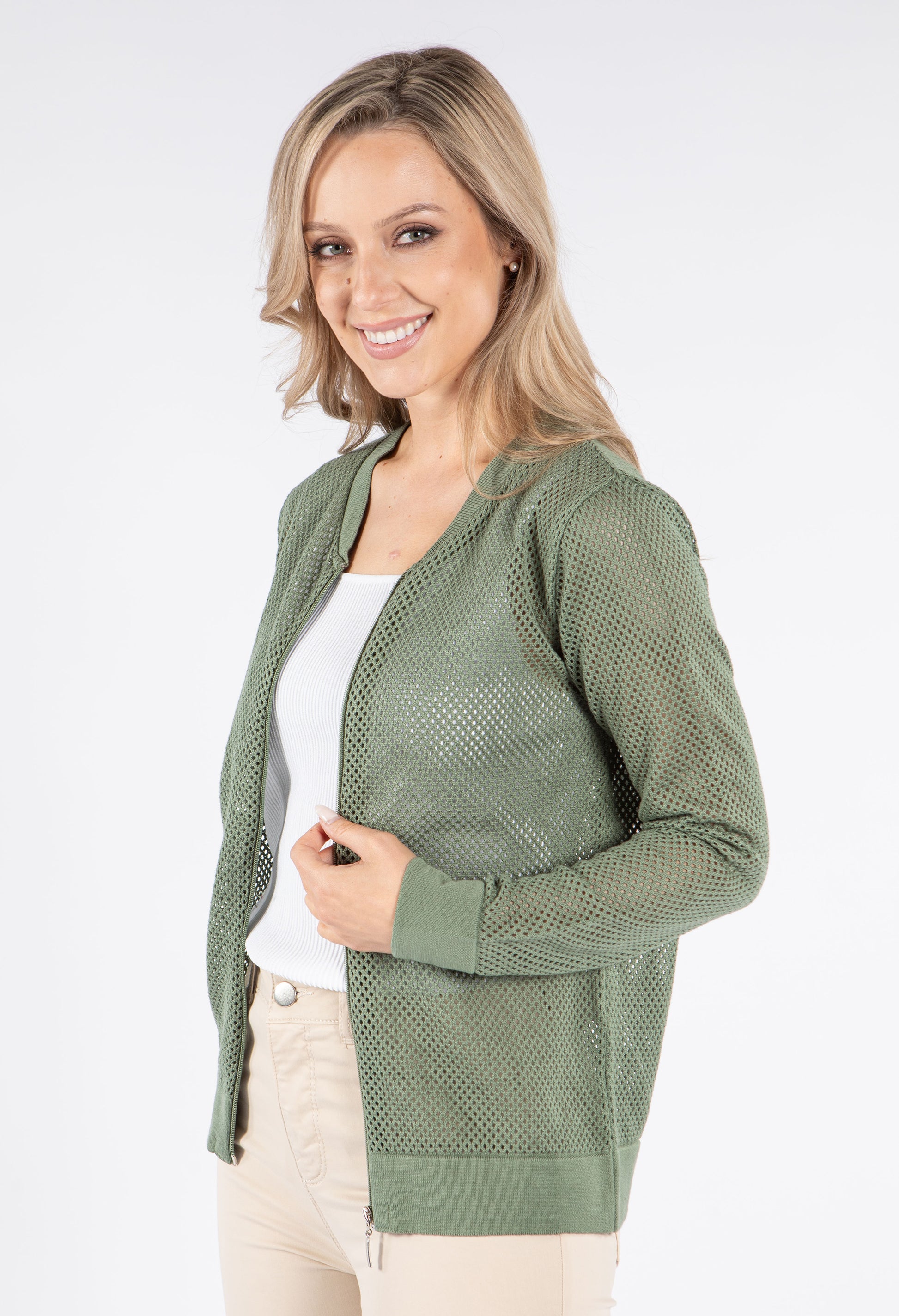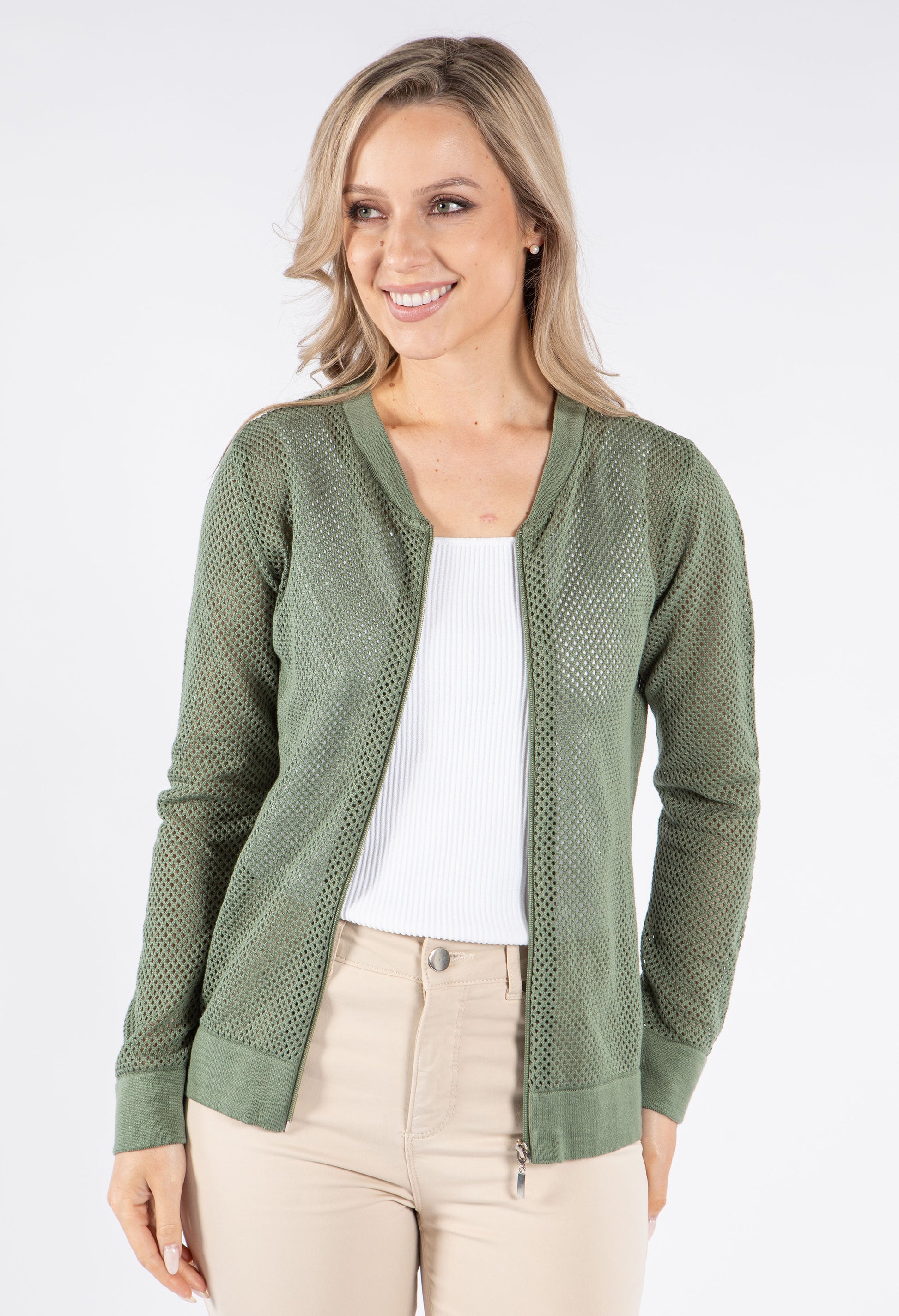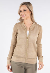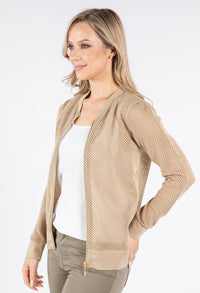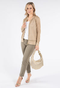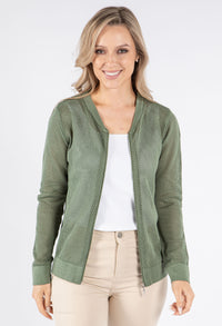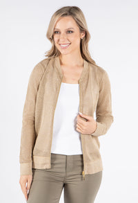 This stylish bomber jacket showcases beautiful crochet knit detailing for a unique textural element in your wardrobe. The convenient front zip closure allows for easy wearing, while the comfortable cuffed sleeves and elasticated waistband create a flattering silhouette. Designed with a relaxed fit that's perfect for layering, this versatile jacket adds both warmth and fashion-forward appeal to any outfit.