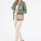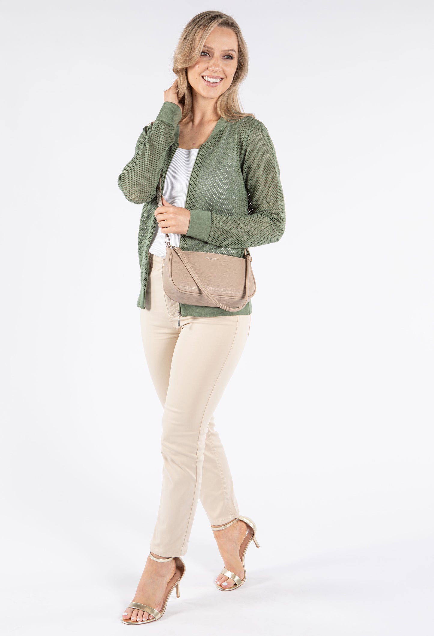 Lifestyle Image- Beige: Jeans, Top, Sandals.