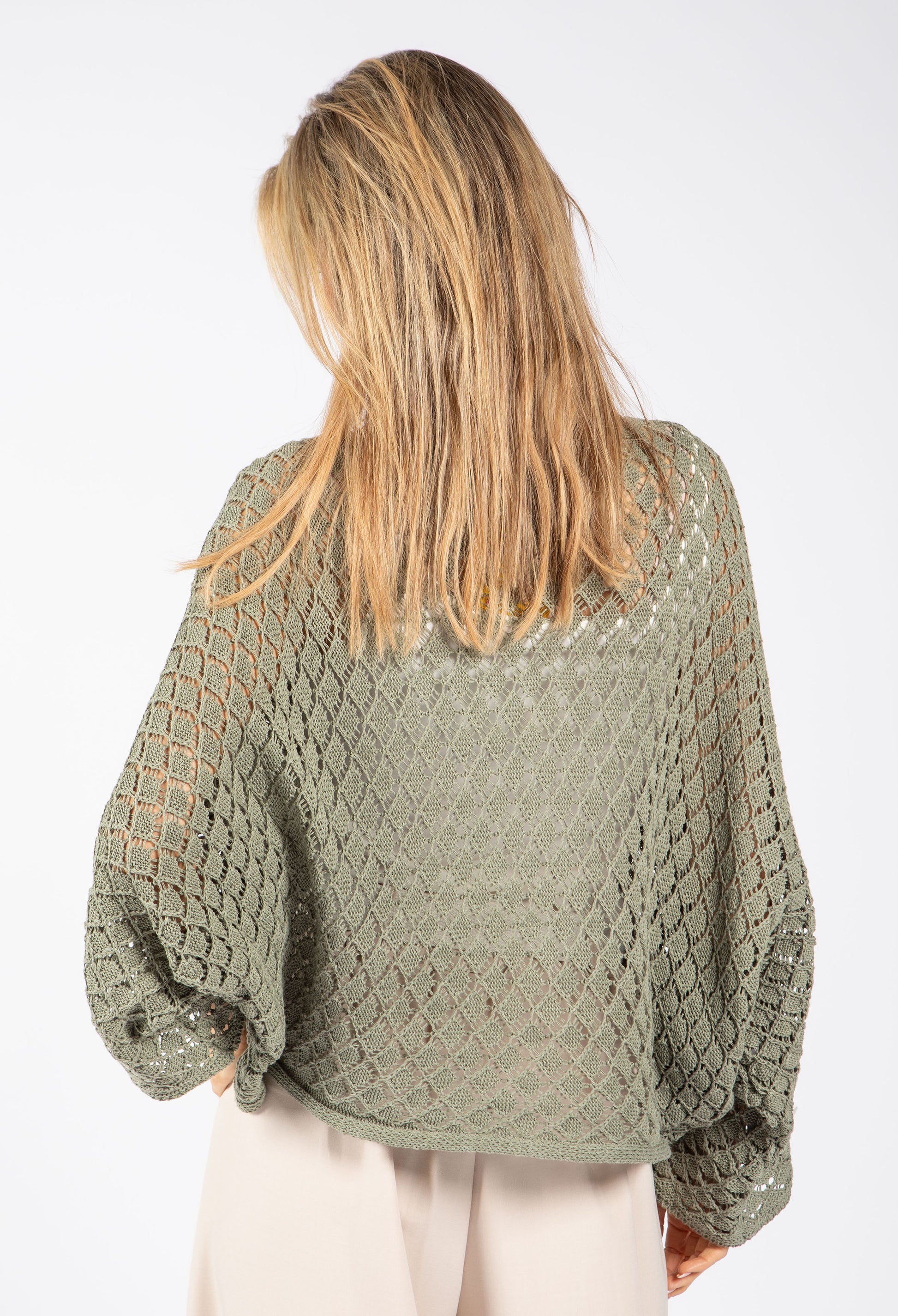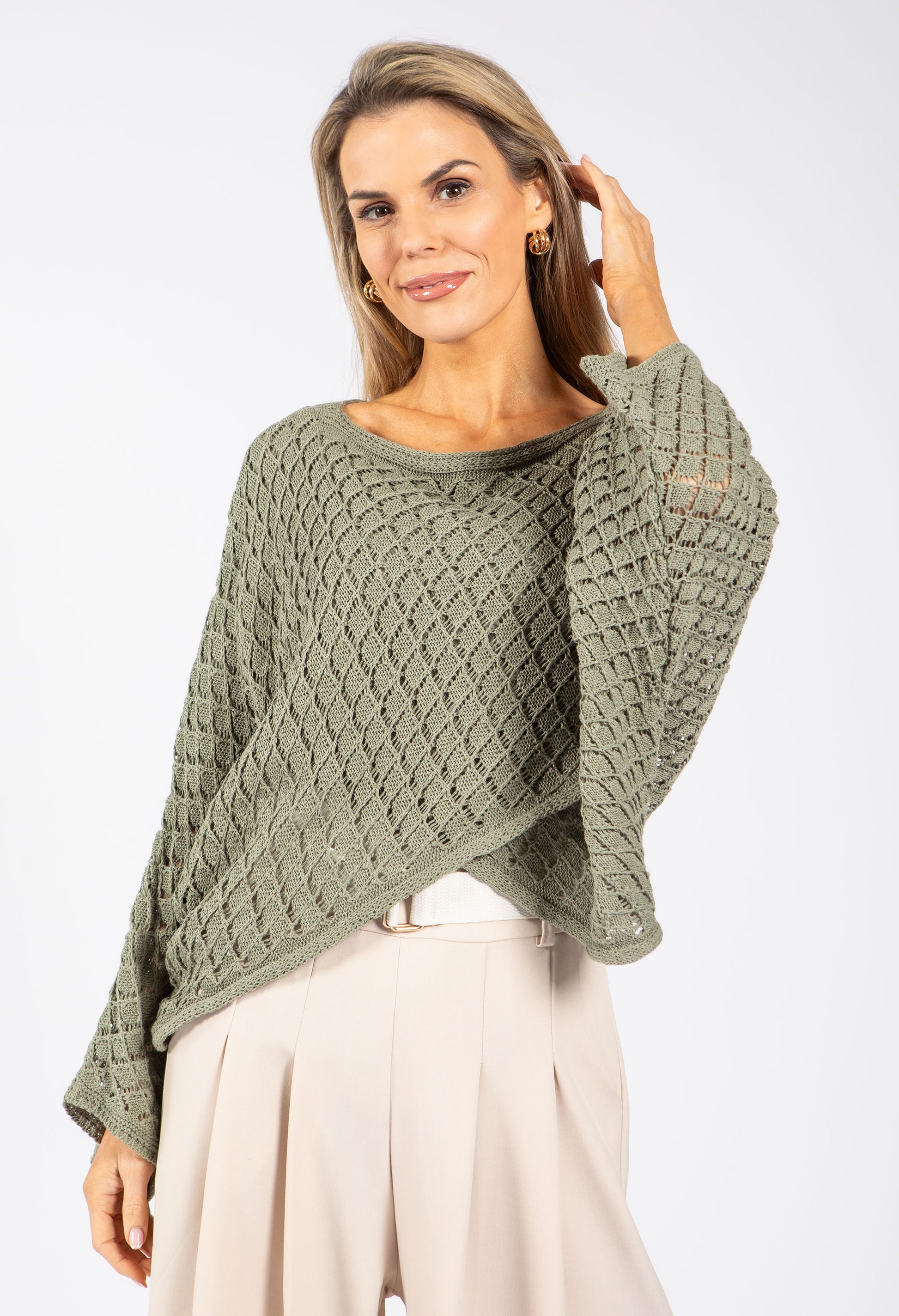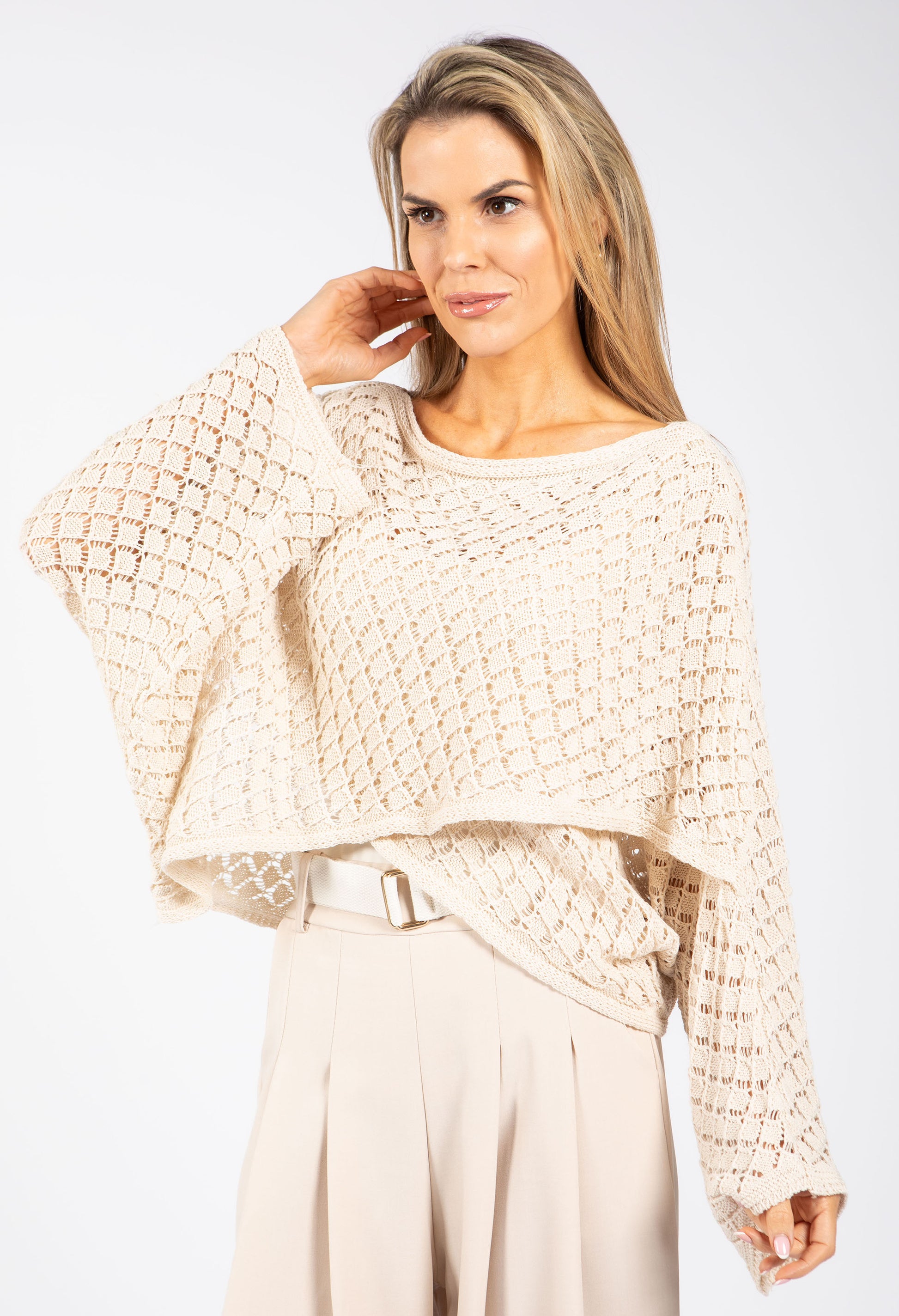 This charming crochet knit jumper combines effortless style with a flattering crossover silhouette. The relaxed batwing sleeves and cropped length create a modern, on-trend look, while the elegant bateaux neckline frames your face beautifully. Perfect for layering , it's a versatile piece that brings texture and warmth to any outfit.