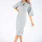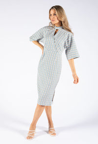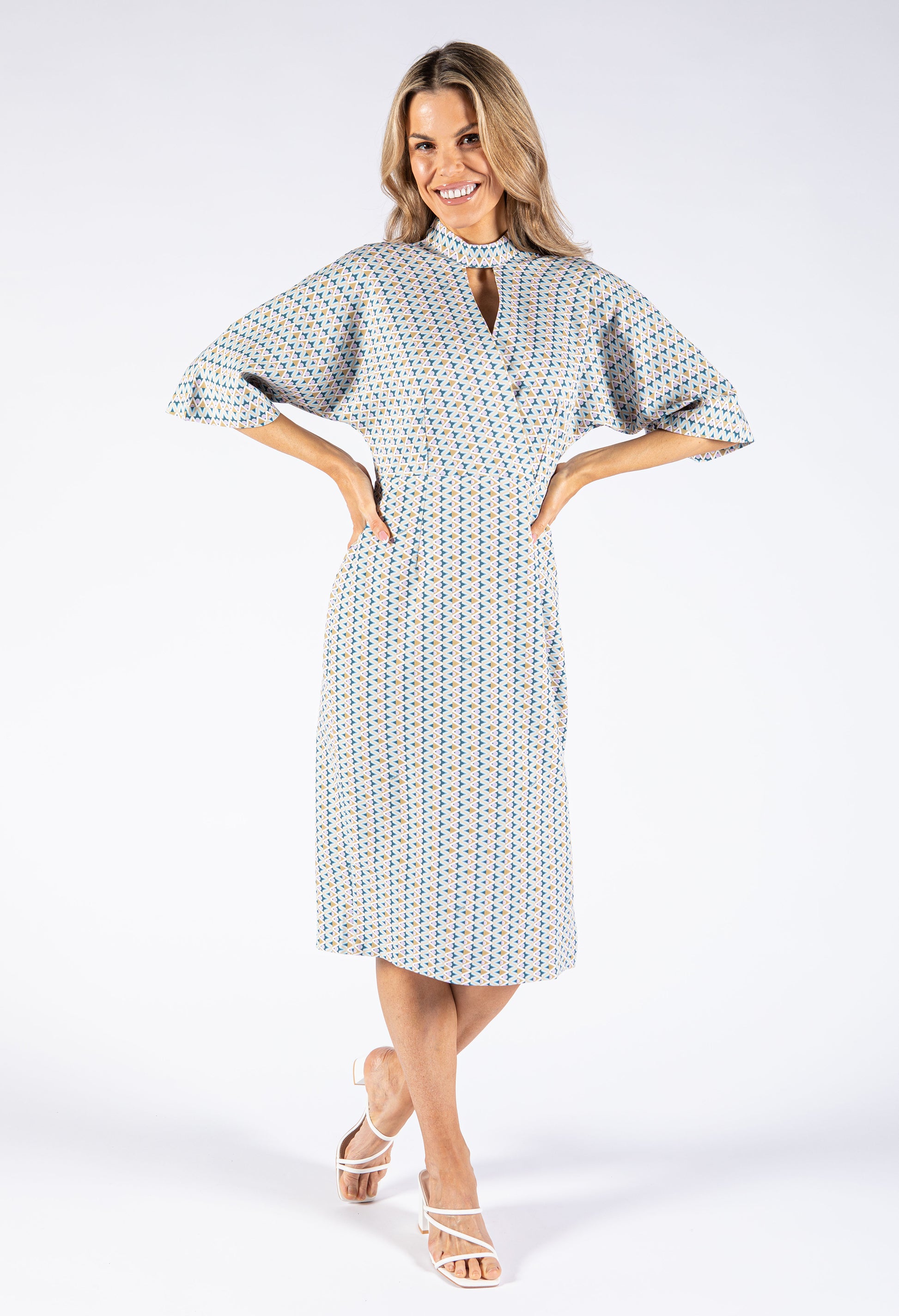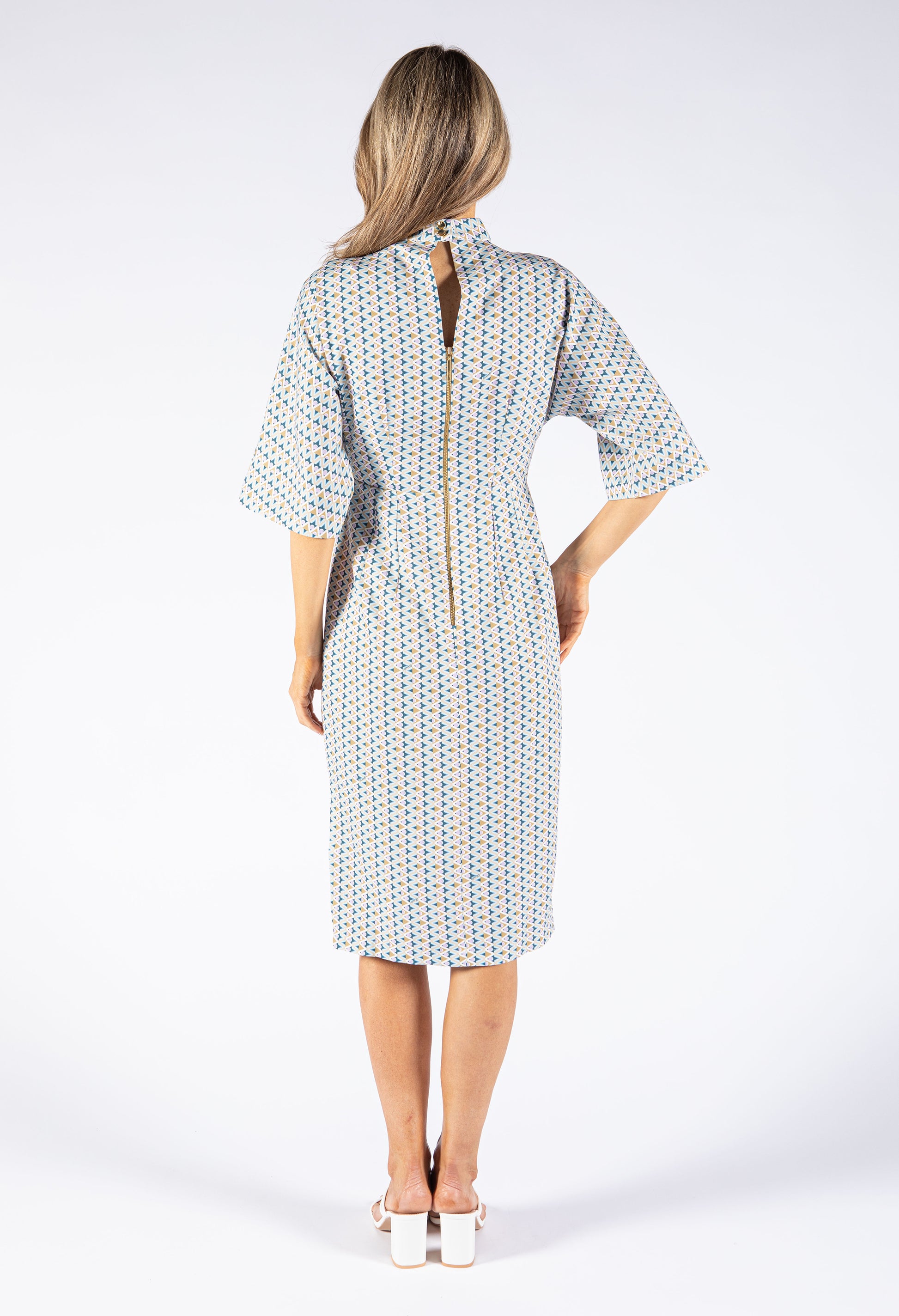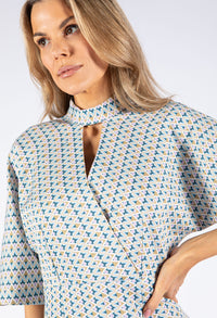 A Kimono Wrap Dress cut in a subtle geometric print in blues, beige and lilac. It has a mandarin collar, keyhole opening and a below the knee pencil skirt with a side split.
