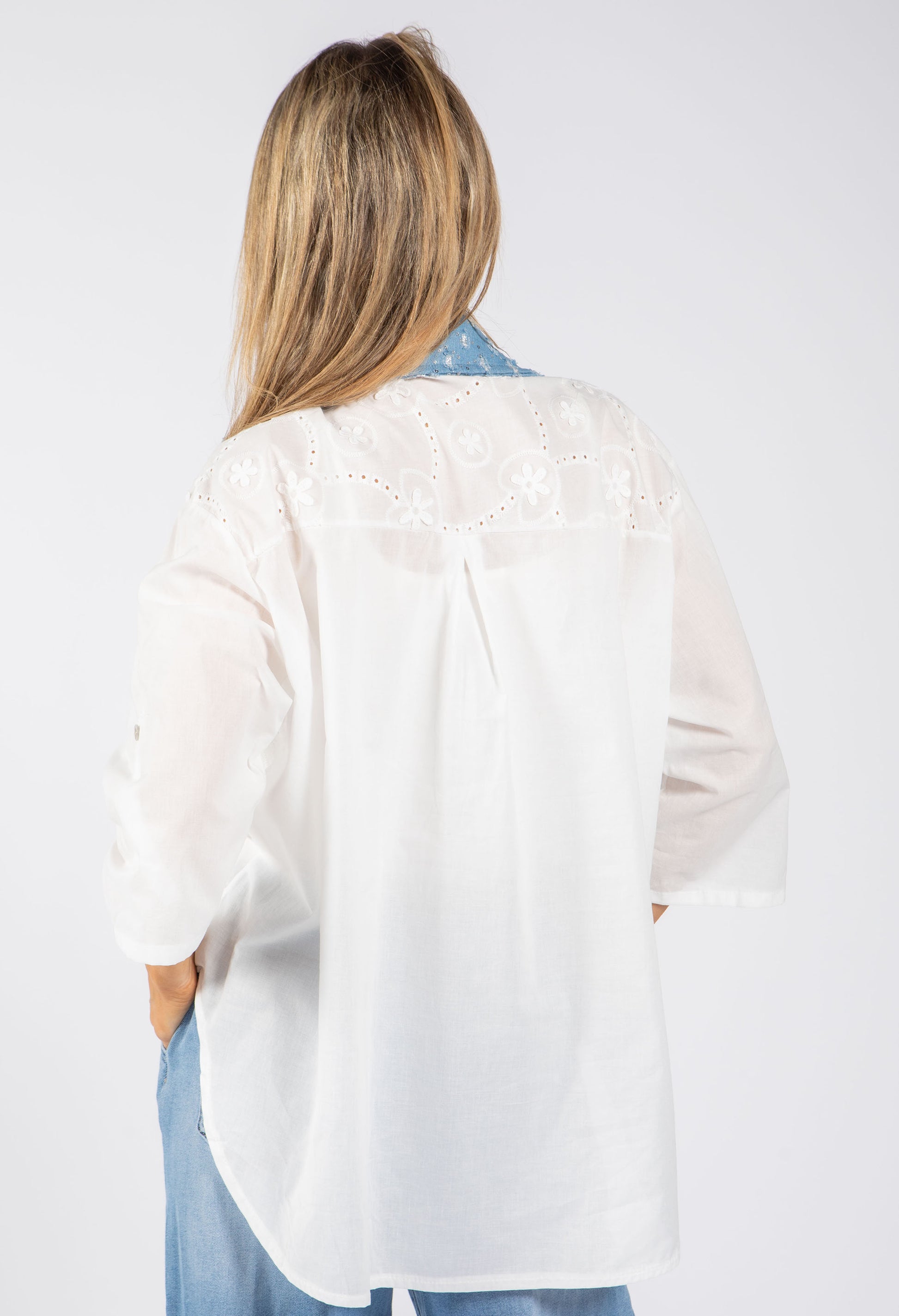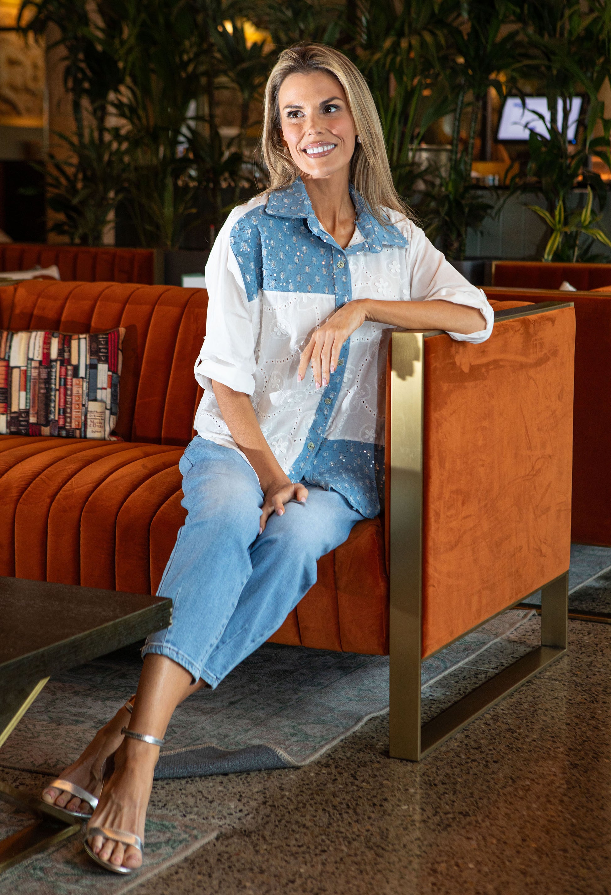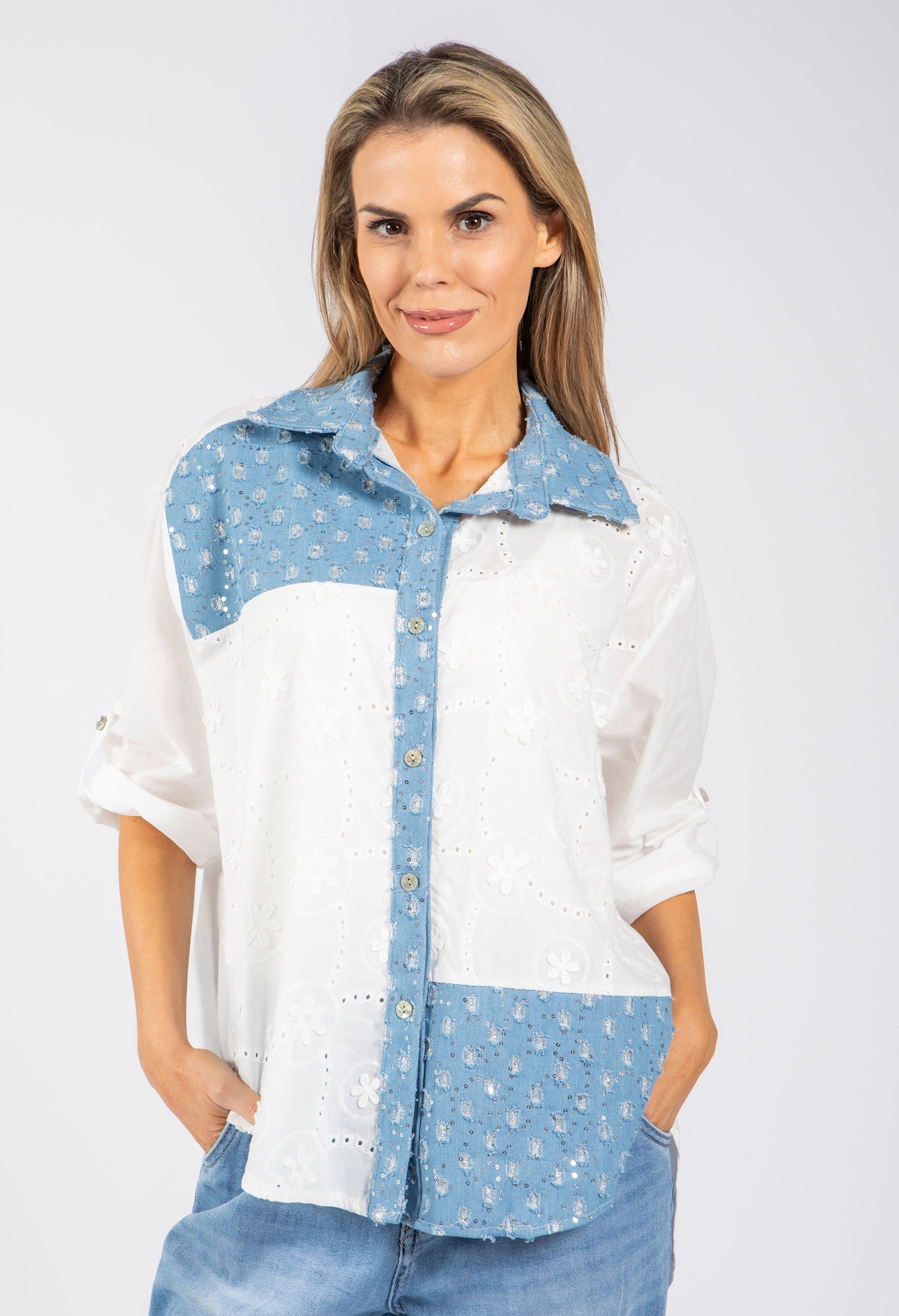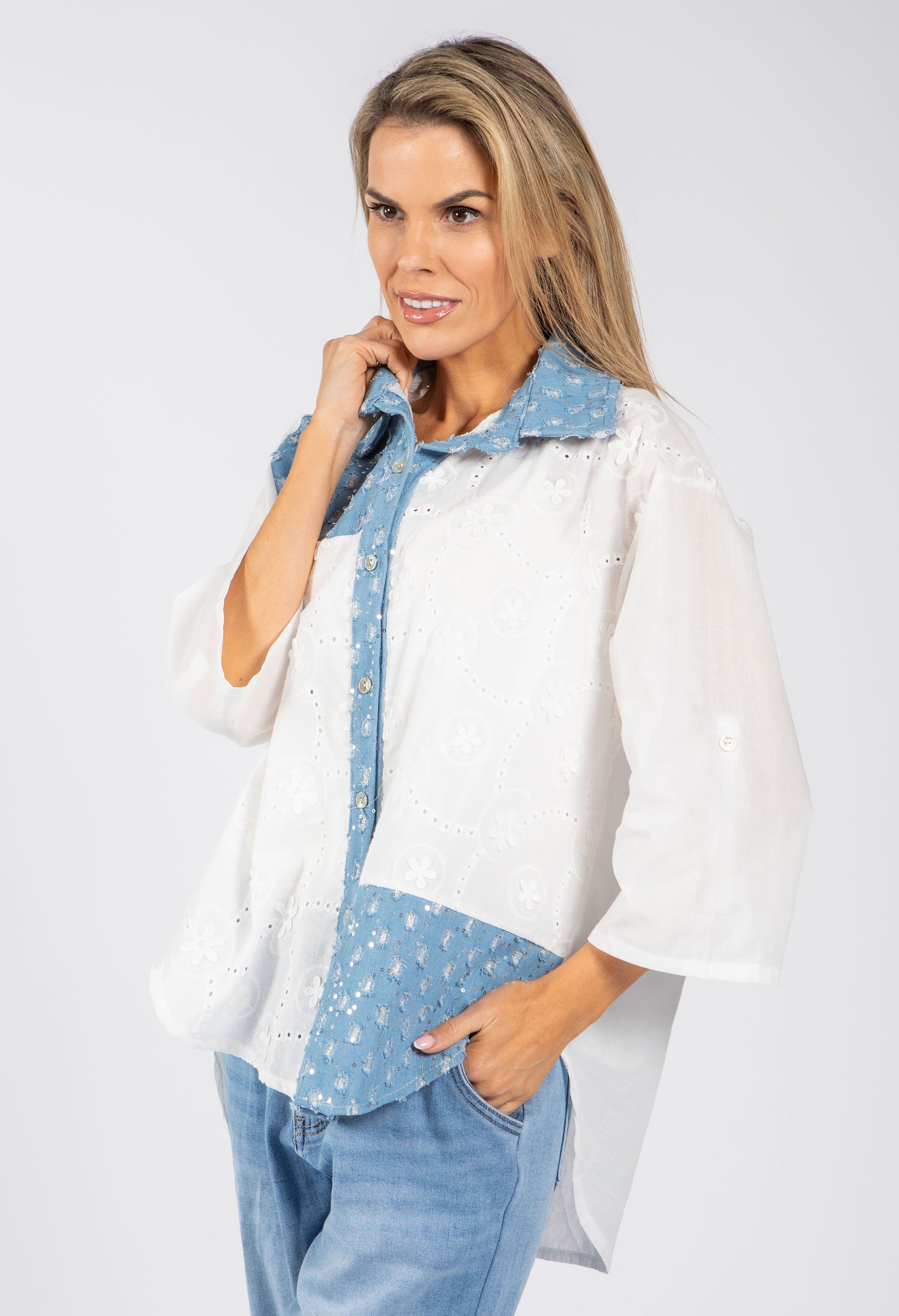Make a statement with this eye-catching shirt that blends casual and dressy elements effortlessly. Three-quarter sleeves can be rolled up for a relaxed vibe, while denim panels add textural interest and durability. Floral embroidery and subtle sequin accents bring sparkle and femininity, complemented by a structured back yoke. The rounded hemline and relaxed fit ensure comfort without sacrificing style, perfect for those who love mixing patterns and materials.