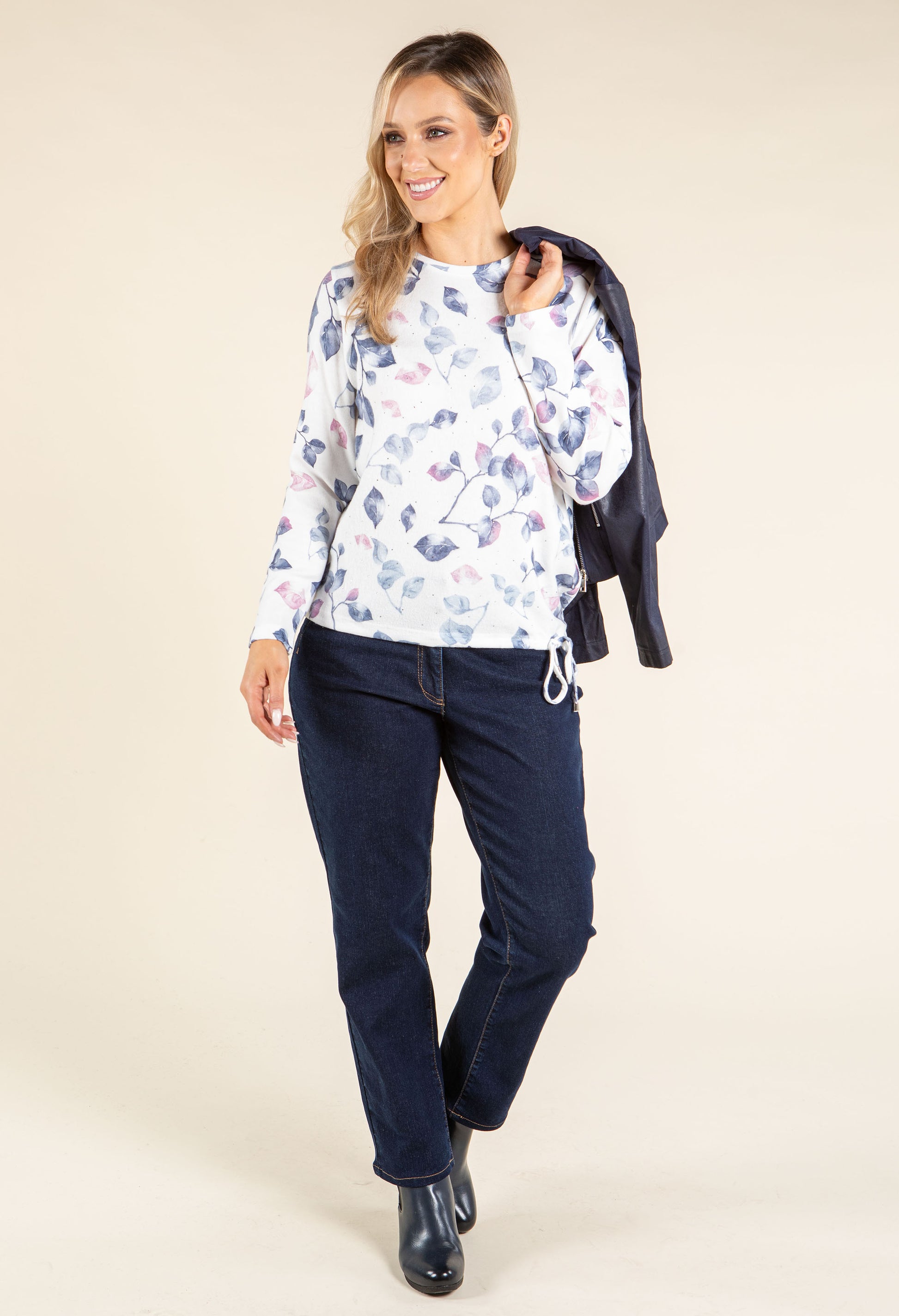 This long-sleeve knit top features a round neckline and drawstring hemline for a customizable fit. Crafted with a luxurious fabric, it is embellished with rhinestone details and a stylish leaf print.