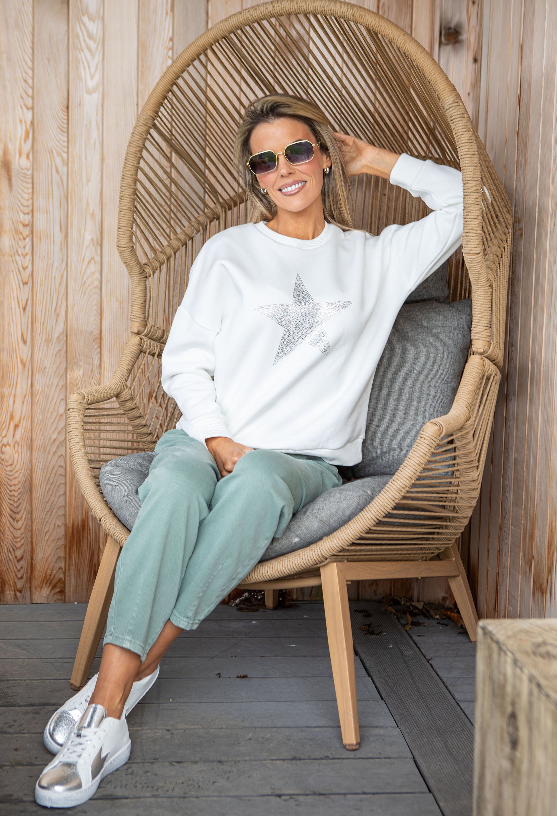 Make a statement with this cosy jumper, adorned with striking rhinestone stars that catch the light beautifully. Designed with a relaxed fit and lined with soft fleece for warmth, it features ribbed detailing at the neckline, cuffs, and hem for a polished finish. The perfect blend of comfort and sparkle for everyday wear.