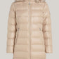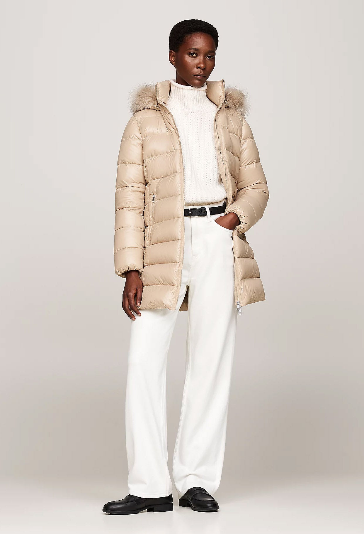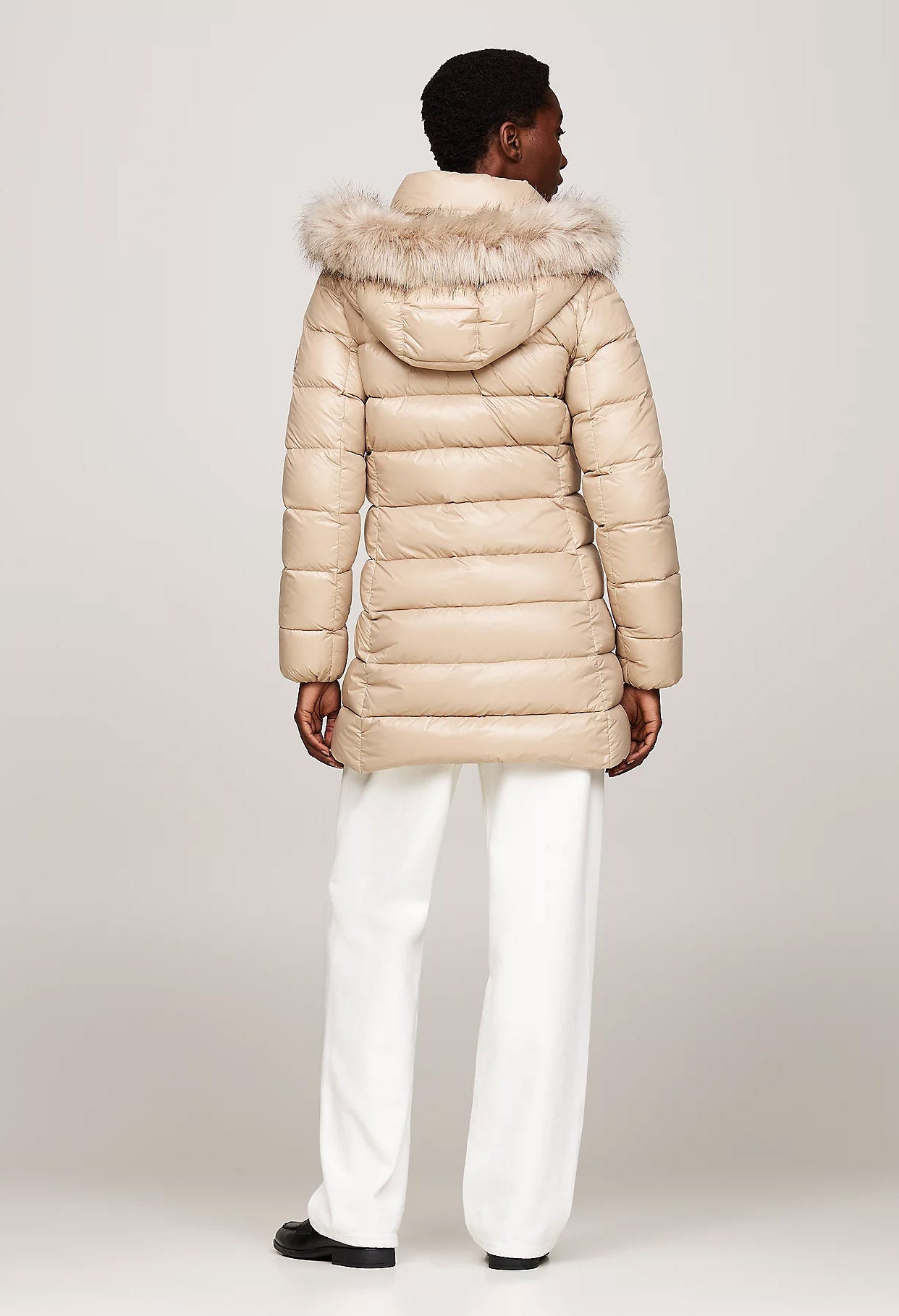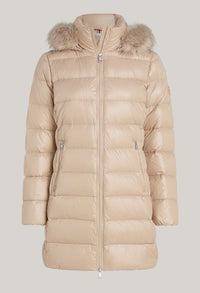 A glossy, water-repellent finish and a removable faux fur trim on the hood amps up the glamour of this practical down-filled coat.