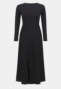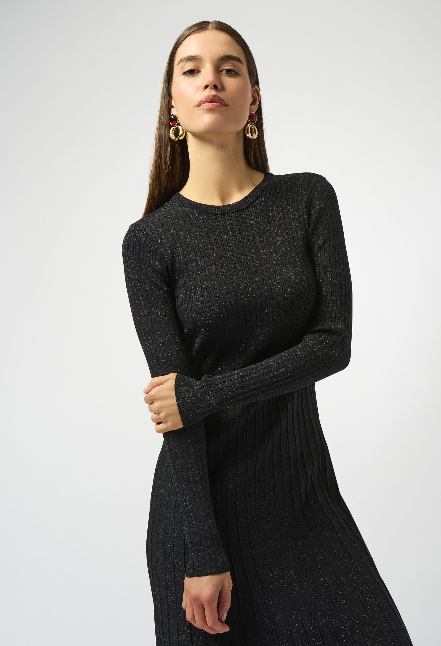 Introducing the Joseph Ribkoff A-line midi dress, a perfect blend of feminine elegance and sophisticated style. This dress features a round-neckline and long, straight sleeves, making it ideal for formal, casual, and semi-formal occasions. The pleated design with jewel accents adds a touch of luxury, while the plain pattern ensures timeless appeal. Embrace the perfect balance of comfort and chic with this exquisite piece.