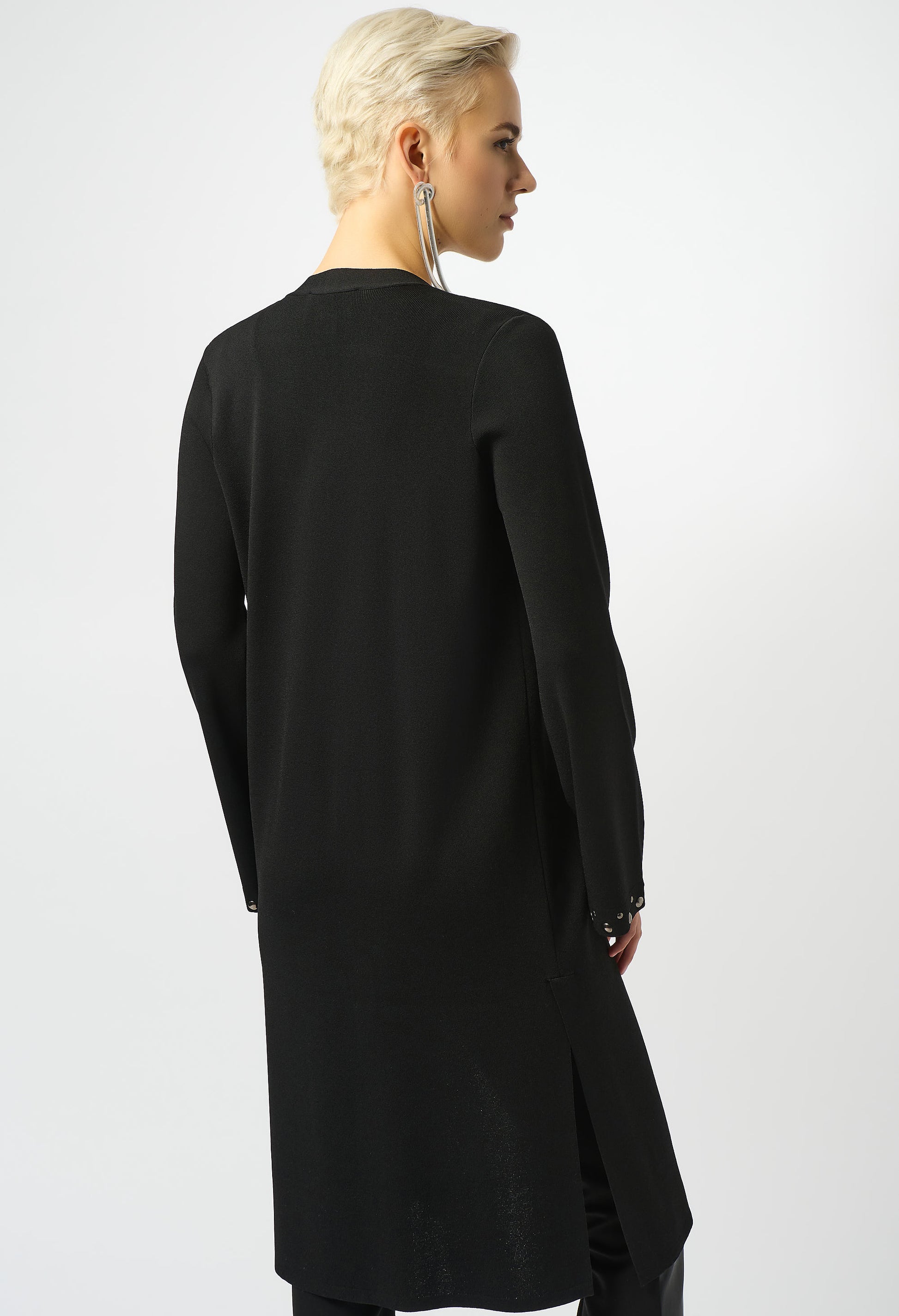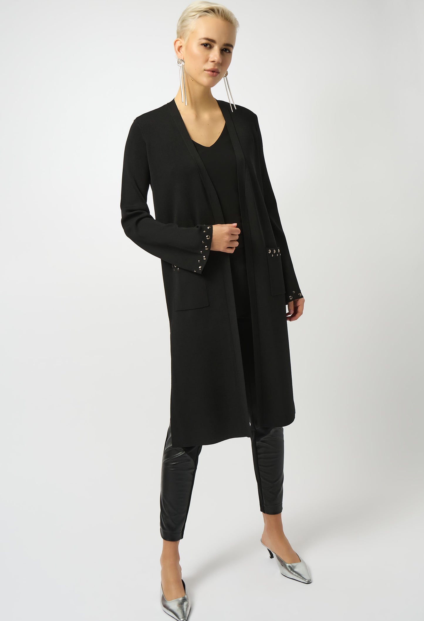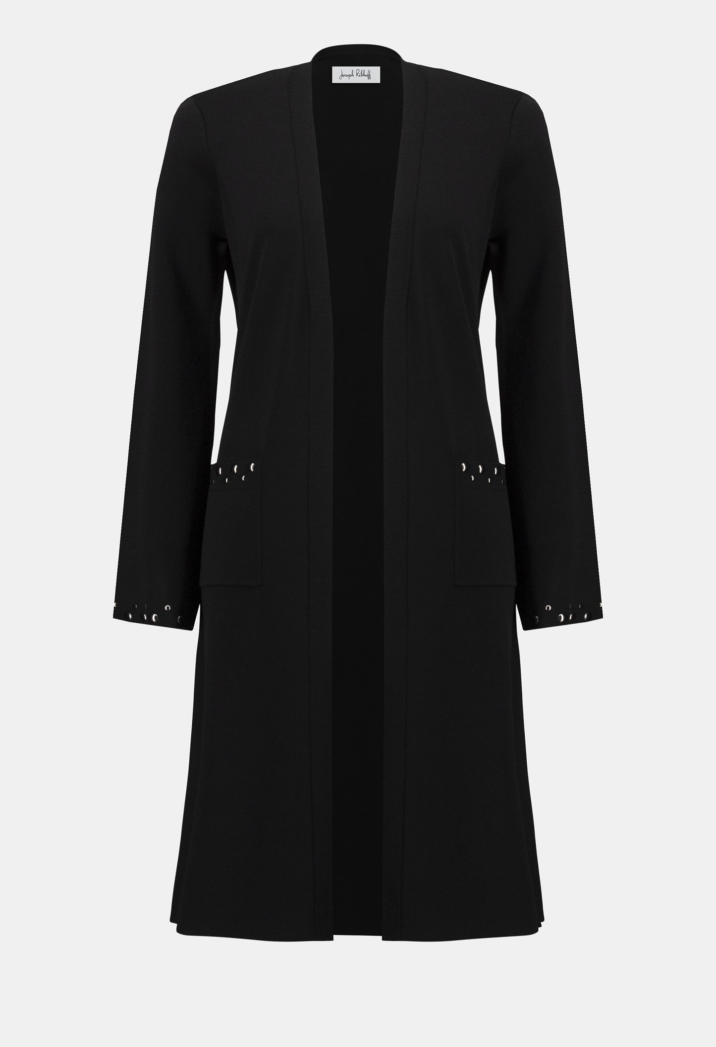 Introducing the Joseph Ribkoff Cardigan, a perfect blend of chic and minimalistic style. This hip-length, regular fit piece features a v-neck and jewel embellishment, adding a touch of elegance to your look. The long, flare sleeves and open front closure offer a sophisticated flair, ideal for casual outings, office wear, or night outs. Functional pockets complete this versatile, plain-patterned staple.
