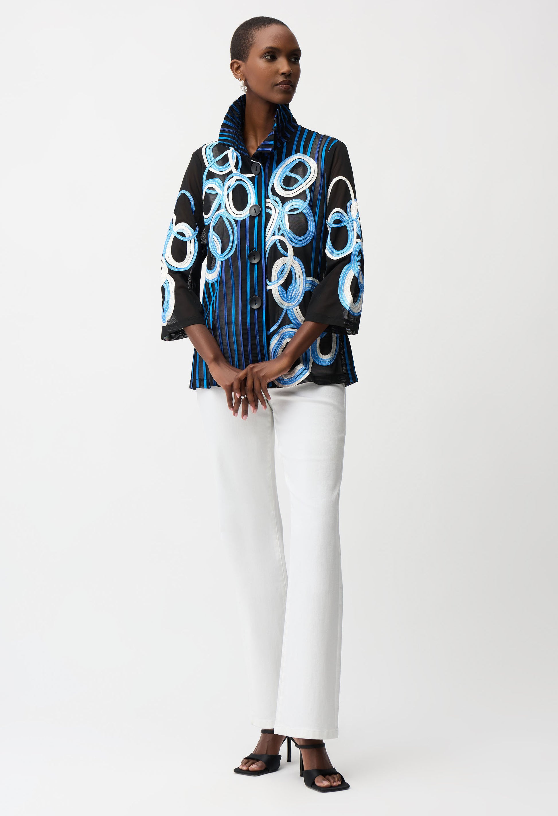 Experience sartorial elegance with this Joseph Ribkoff blazer, perfect for both casual and semi-formal occasions. The hip-length design features a collared neckline and 3/4 straight sleeves, offering a regular fit that ensures comfort. Adorned with buttons, embellishments, and embroidery, this blazer showcases an abstract and striped pattern, blending feminine and edgy styles effortlessly. Ideal for everyday wear, it promises to enhance your wardrobe with its unique flair.