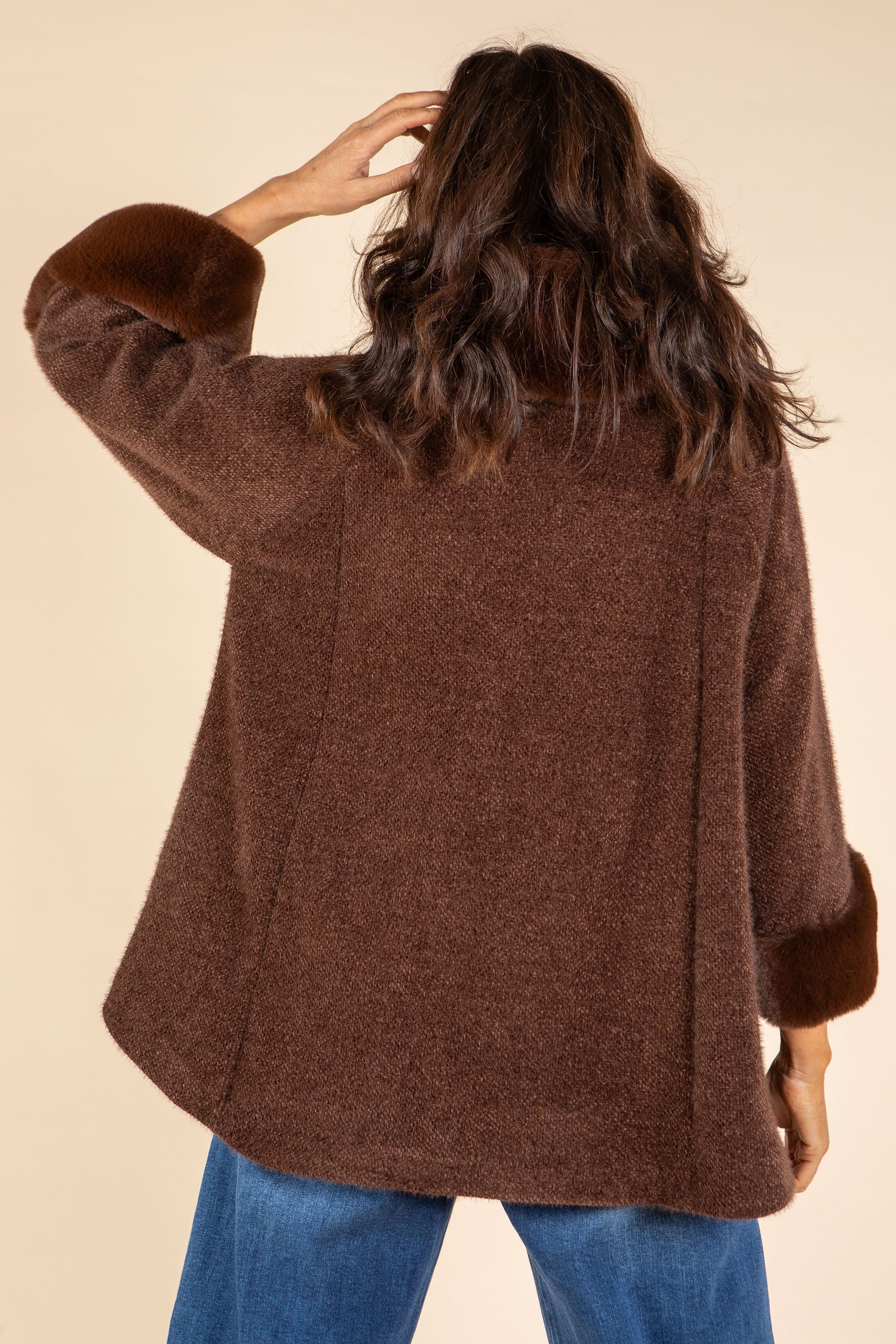 Featuring a button front, this coat is designed with 3/4 length sleeves and a tailored collar. It includes practical side pockets and is elegantly detailed with faux fur trim accents.