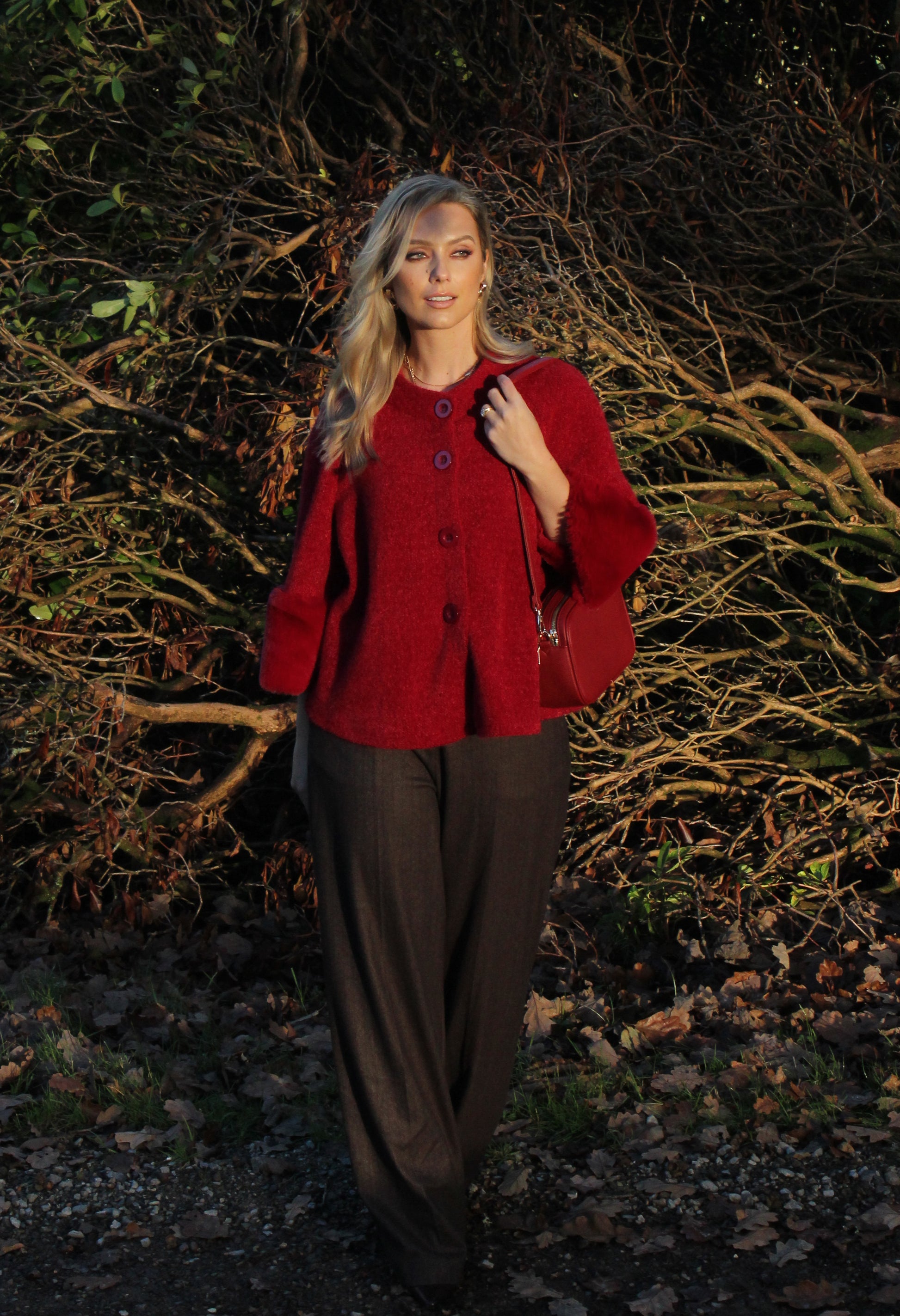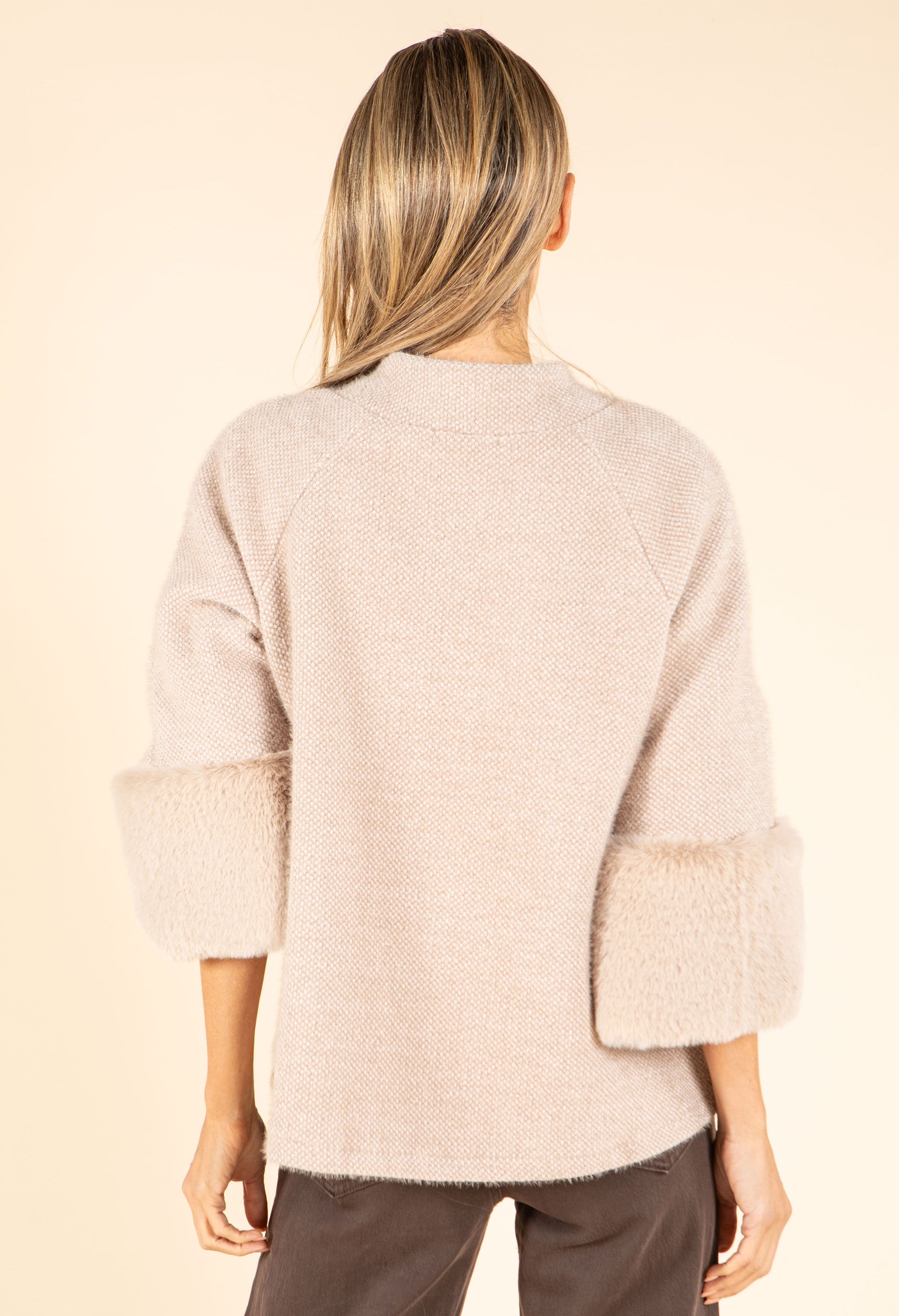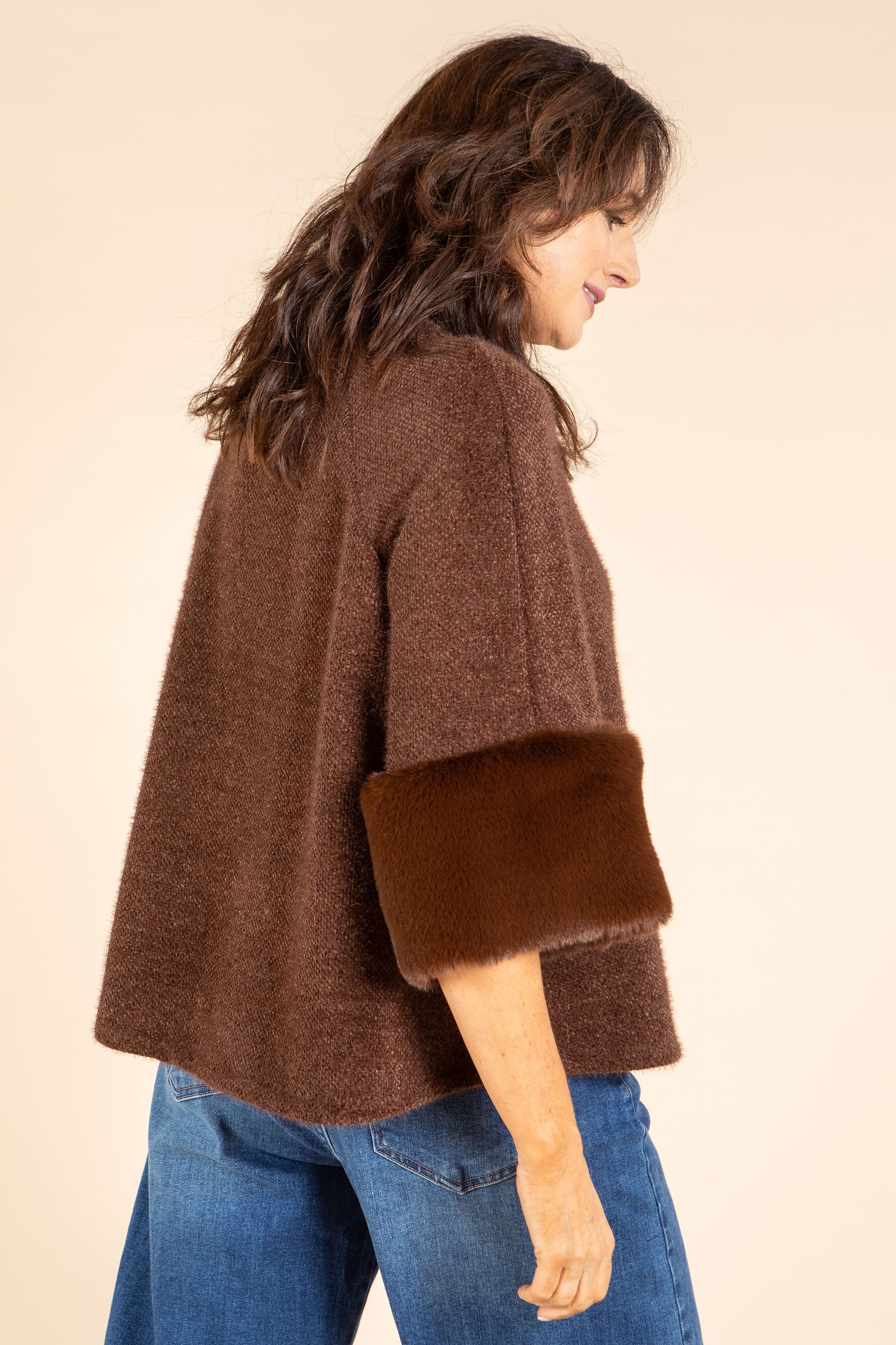 Designed with a round neckline and button closure, this jacket features 3/4 length sleeves and elegant faux fur trim accents for a chic, sophisticated look.