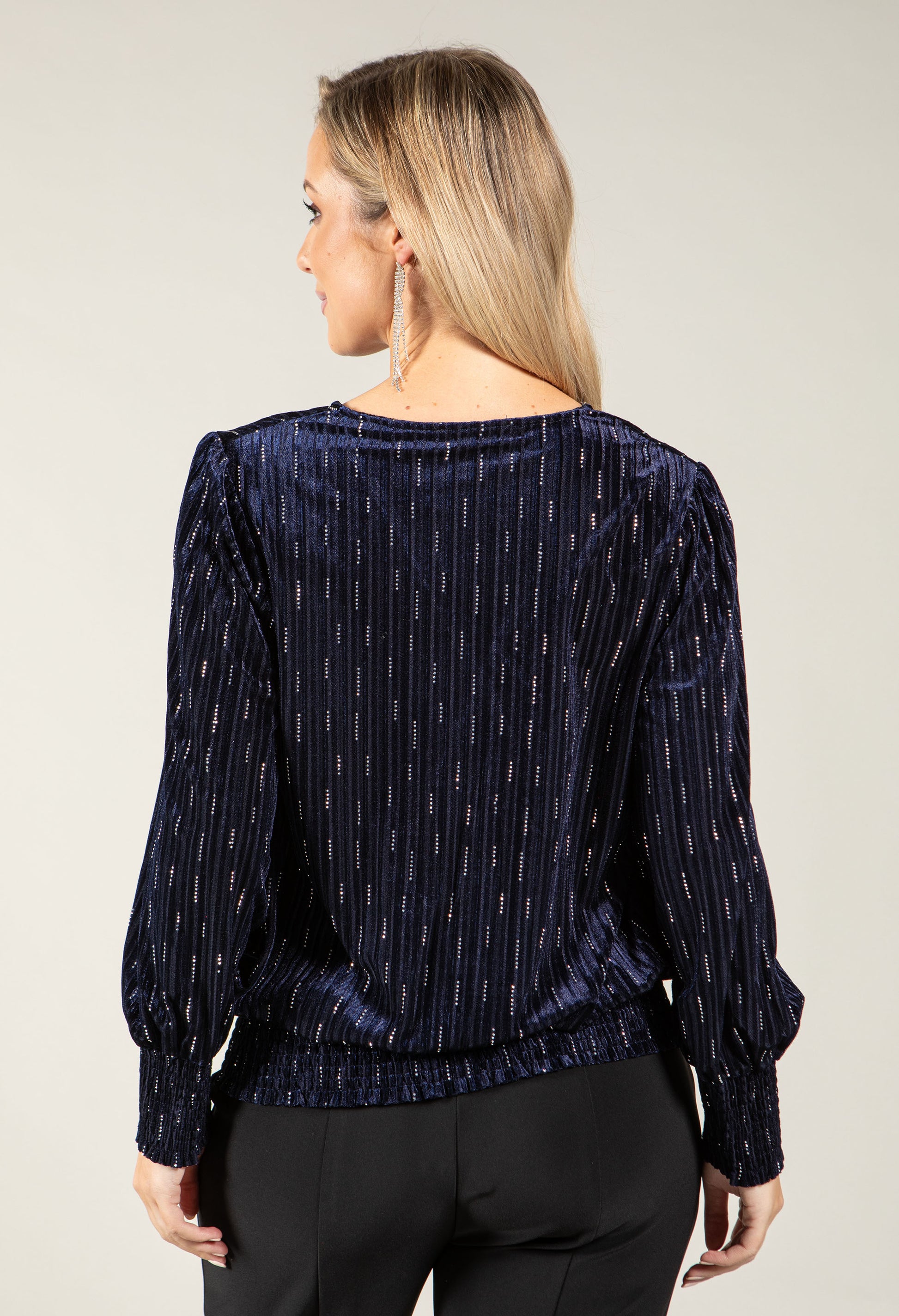 Elevate your wardrobe with this sophisticated velvet blouse featuring a flattering V-neckline and long sleeves. The stretch velvet fabric drapes beautifully while the elasticated waistband and cuffs provide a comfortable, tailored fit. Sparkling rhinestone accents add a glamorous finishing touch, making this piece perfect for special occasions.