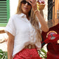 Lifestyle Image- White: Skirt, Sunglasses, Bracelet, Necklace
