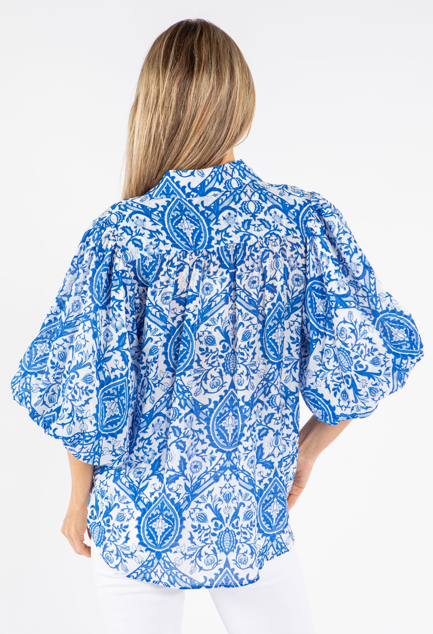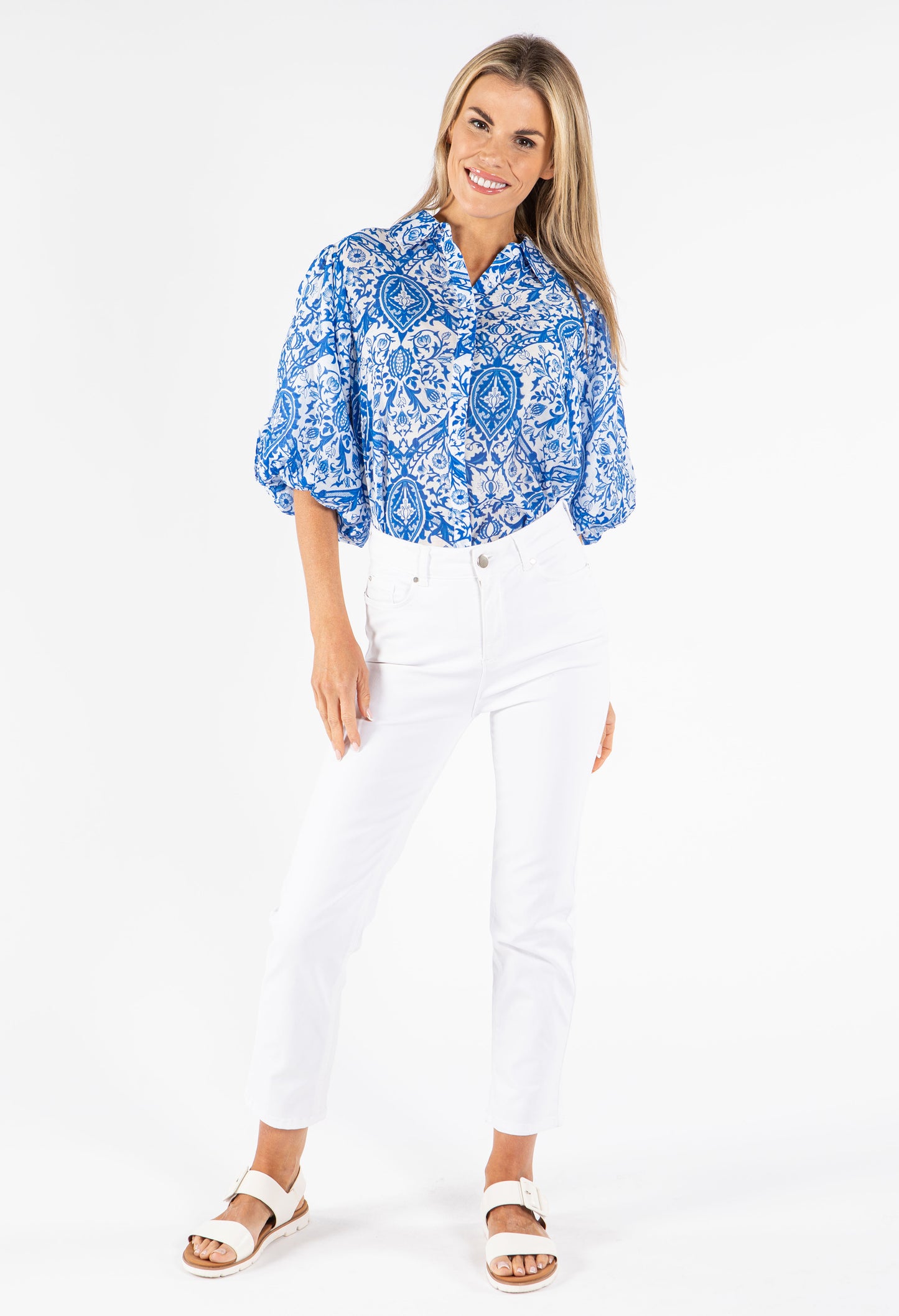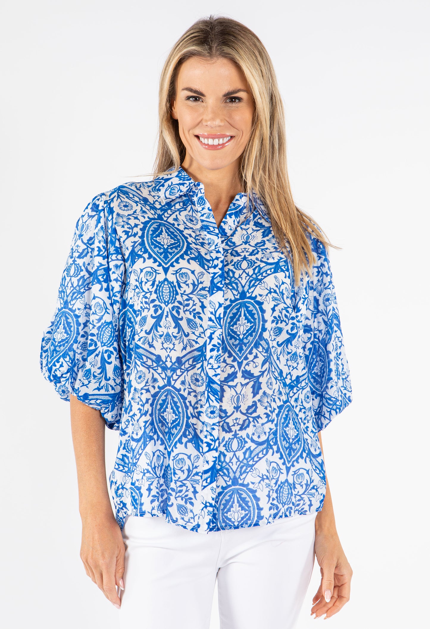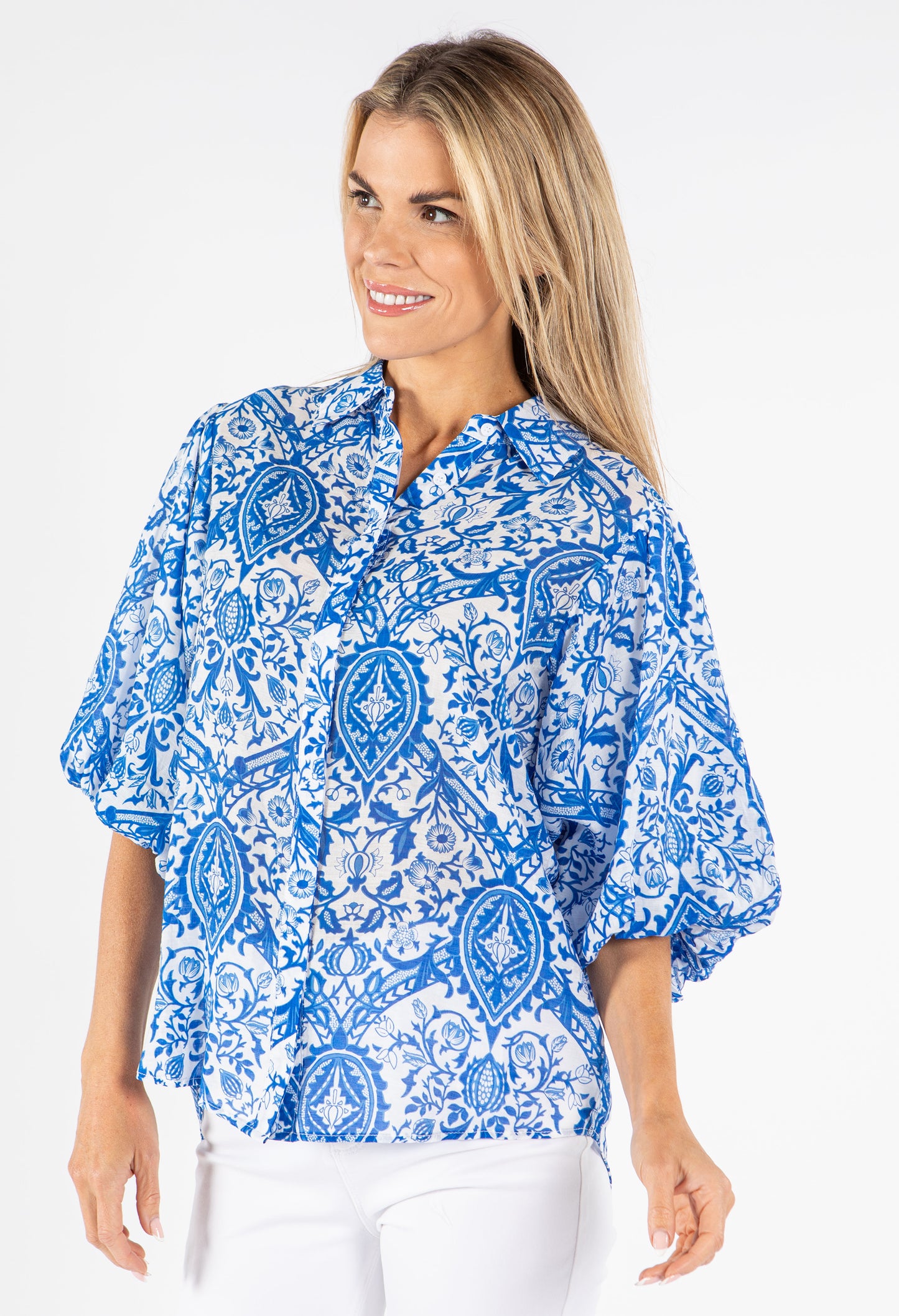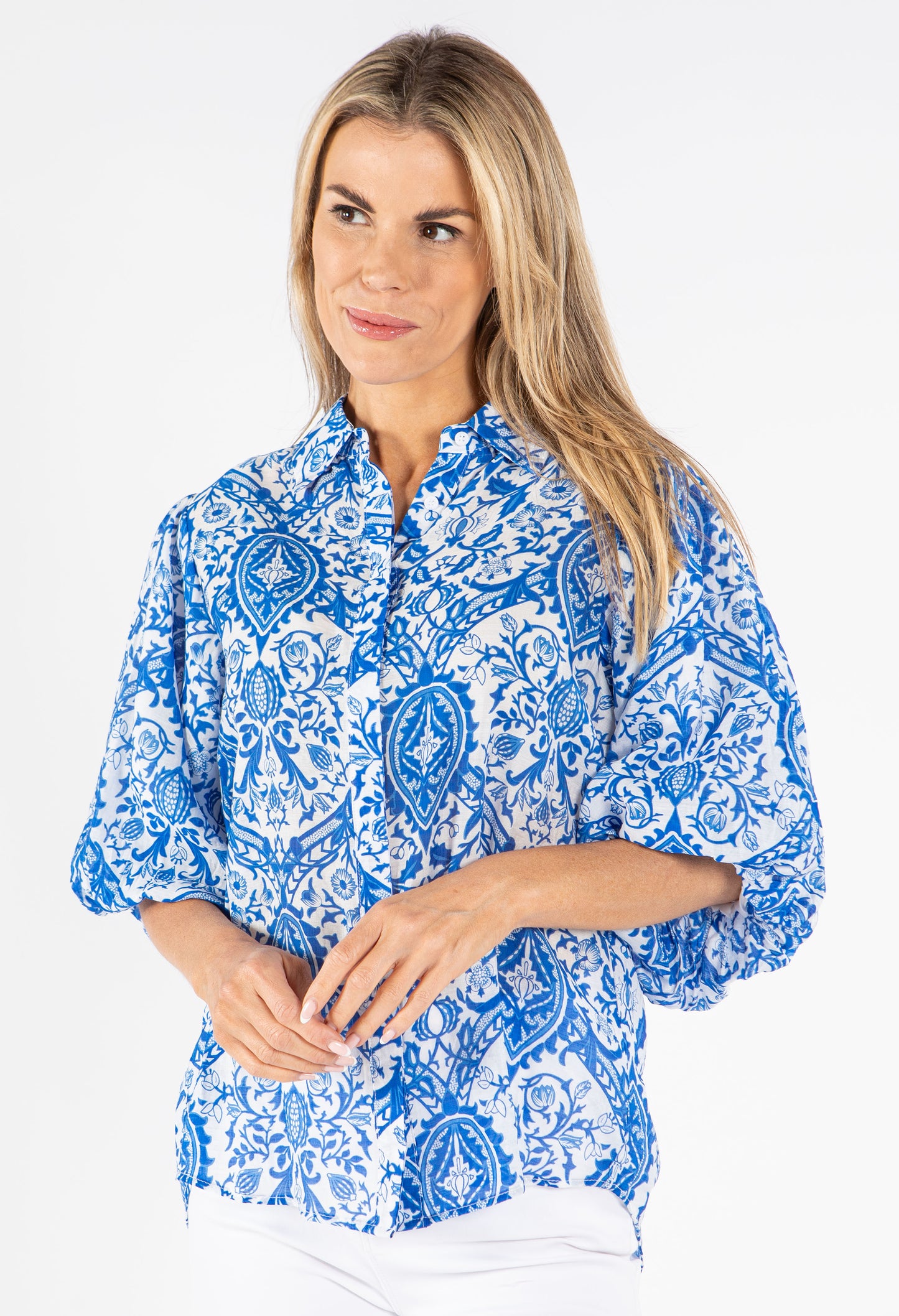 Add some flair to your wardrobe with this stylish Floral Balloon Sleeve Blouse. Featuring 3/4 length elasticated cuffs, a button closure, and a vibrant floral print, this top is the perfect addition to any outfit.