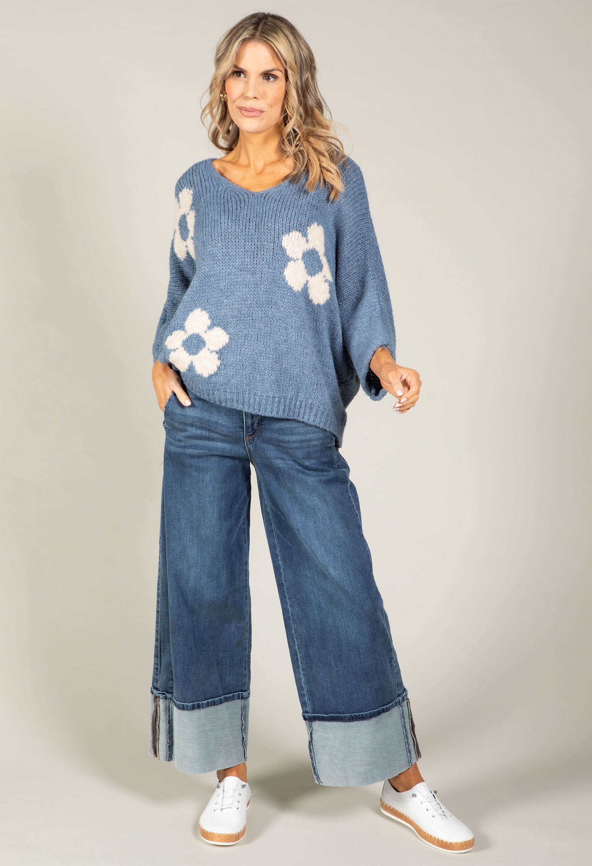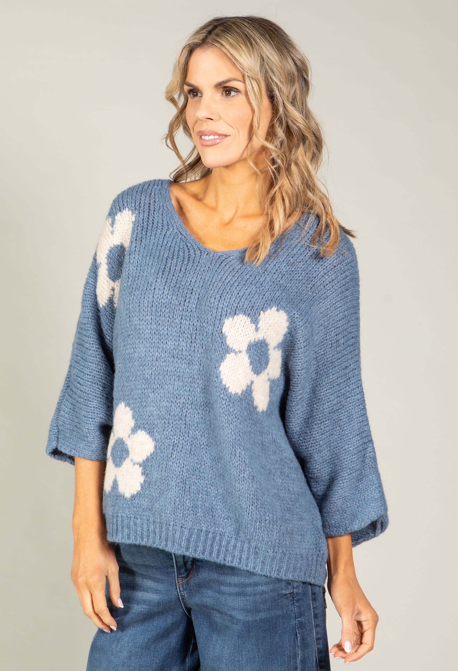 Embrace understated elegance with this beautiful floral knit jumper. Crafted from a luxurious wool blend, it features a flattering V-neckline and distinctive batwing sleeves that add contemporary flair. The soft, touchable fabric feels wonderful against the skin, while the relaxed fit provides effortless comfort. A delicate floral pattern brings visual interest to this versatile piece that pairs beautifully with your favourite bottoms.
