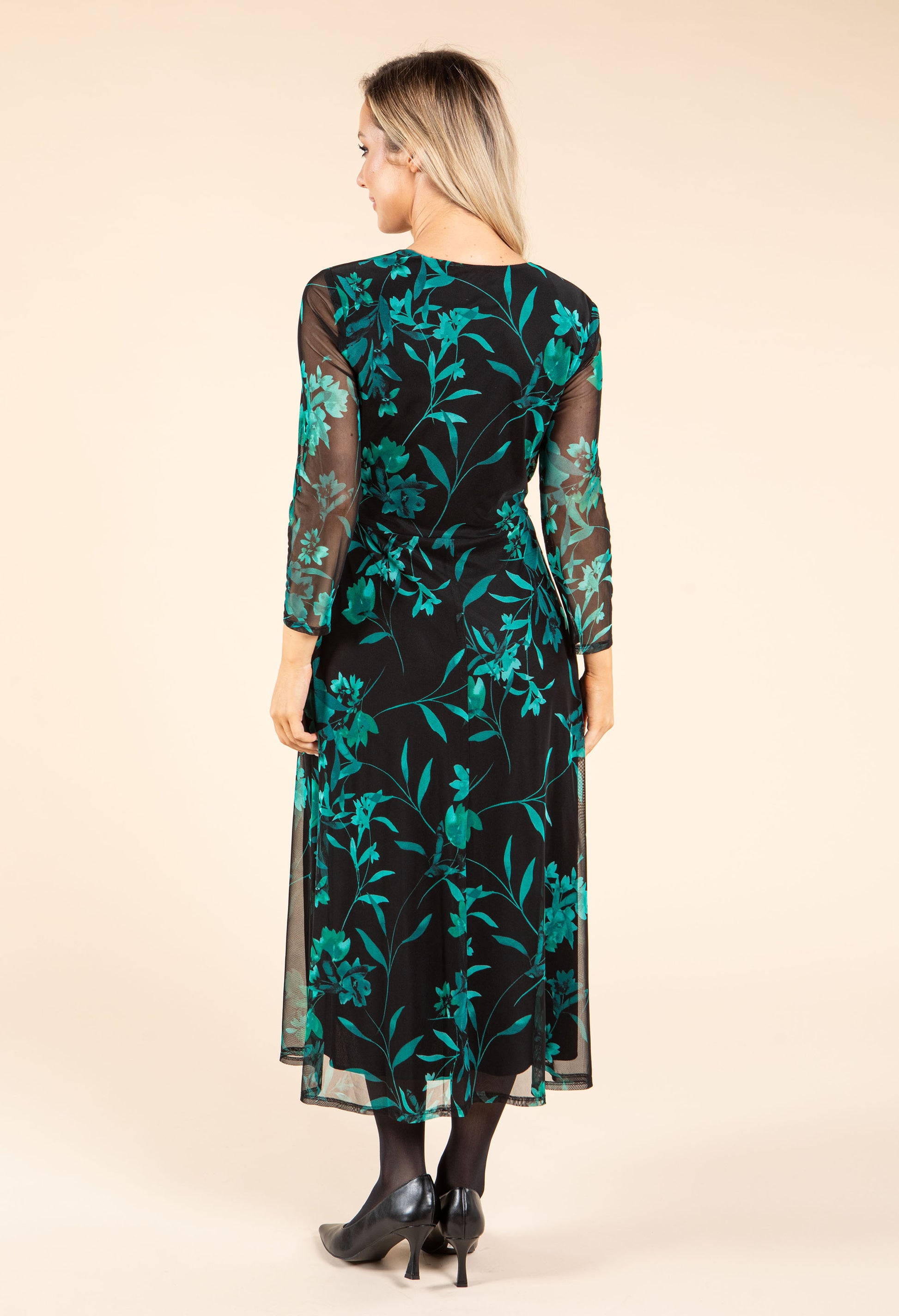 Stay on trend with this floral printed mesh dress. Faux-wrap style offers a flattering shape.