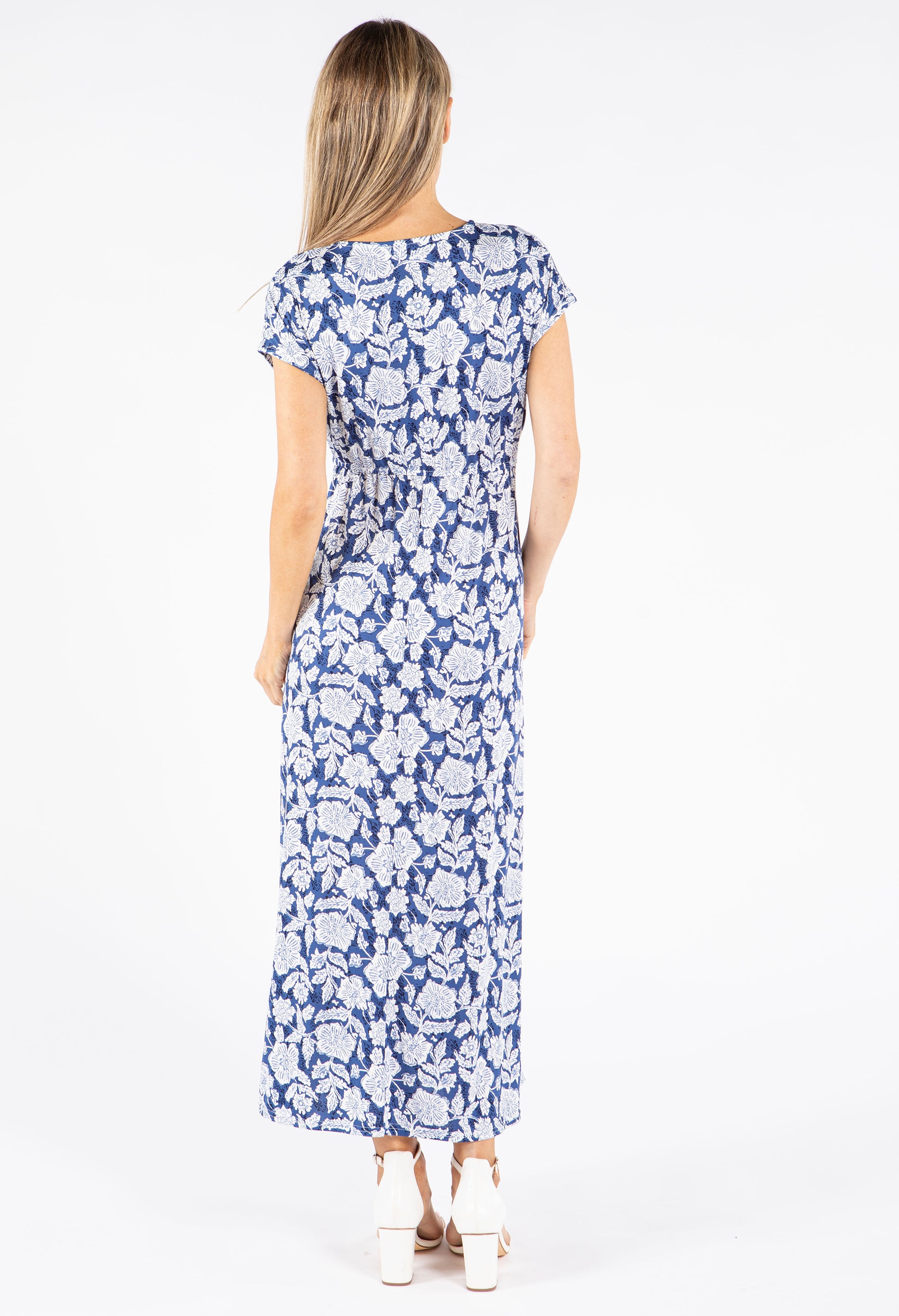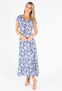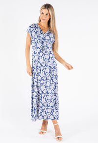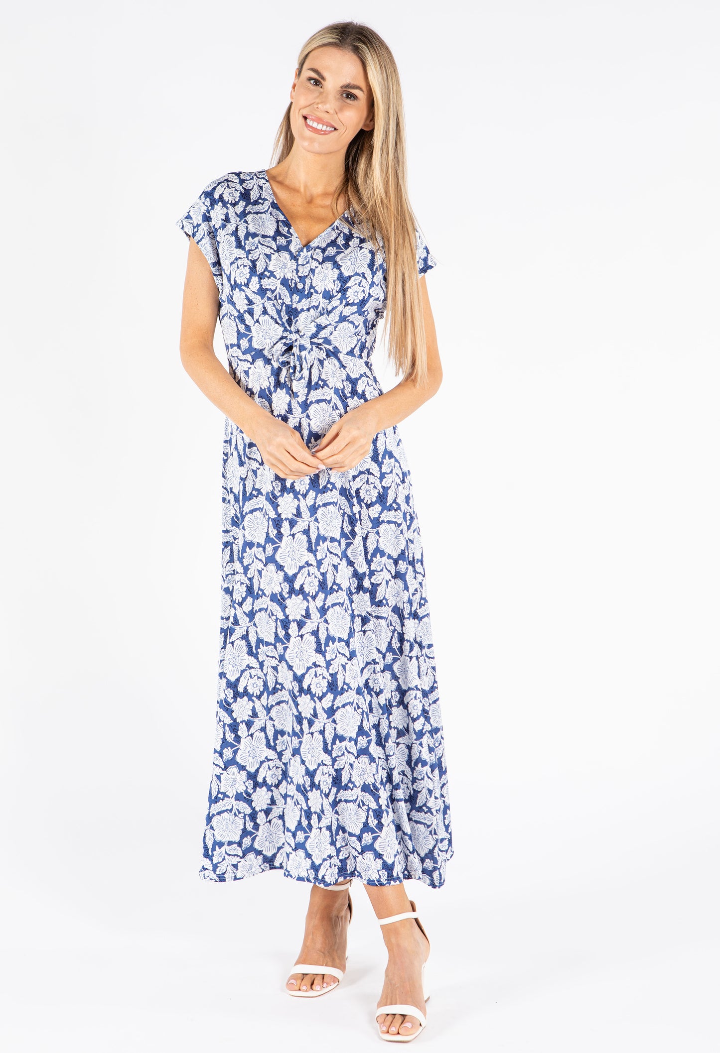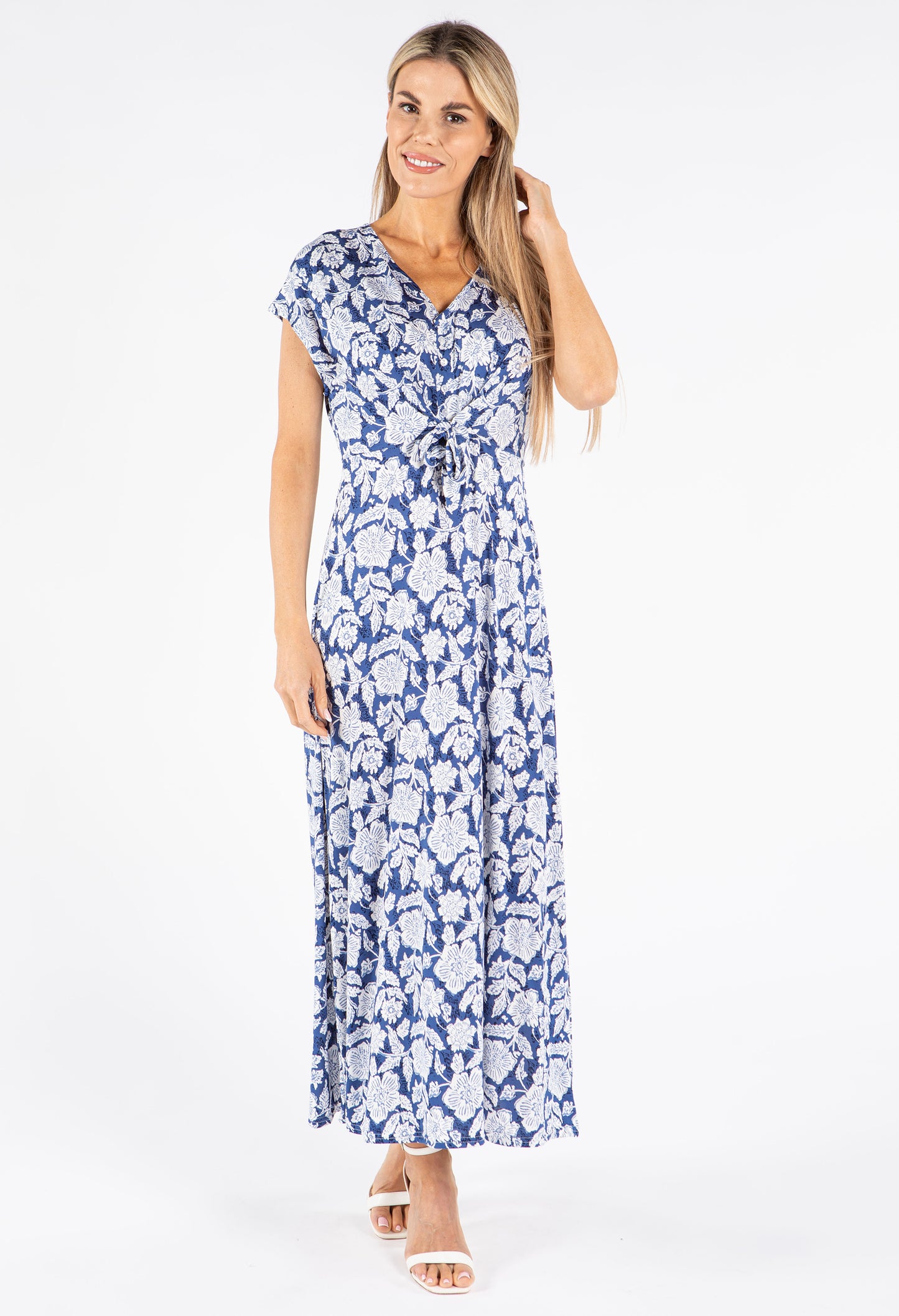 Embrace effortless style with this delightful floral midi dress crafted from comfortable stretch fabric that follows your movements naturally. The elegant V-neckline is beautifully complemented by decorative faux buttons, while the flattering front tie detail defines your waist. Perfect for both casual and dressier events, this versatile piece features practical short sleeves and a timeless silhouette that suits any season.