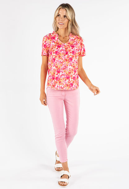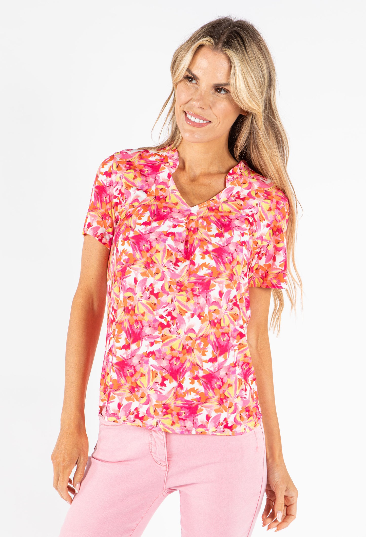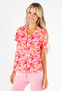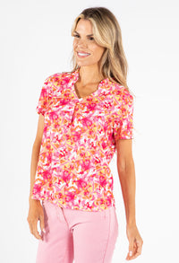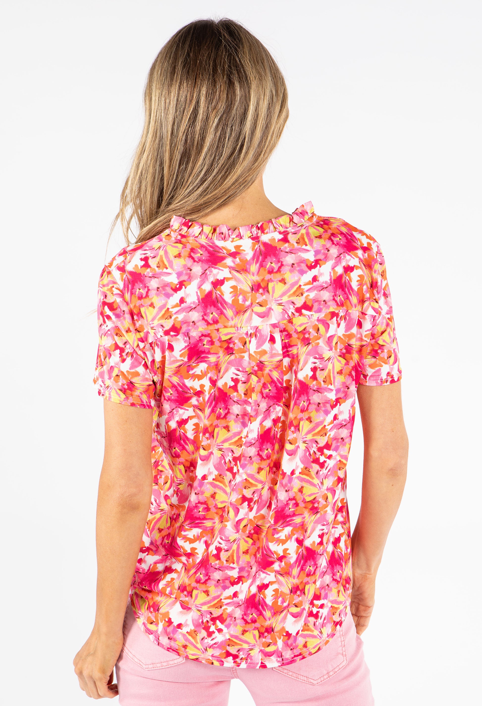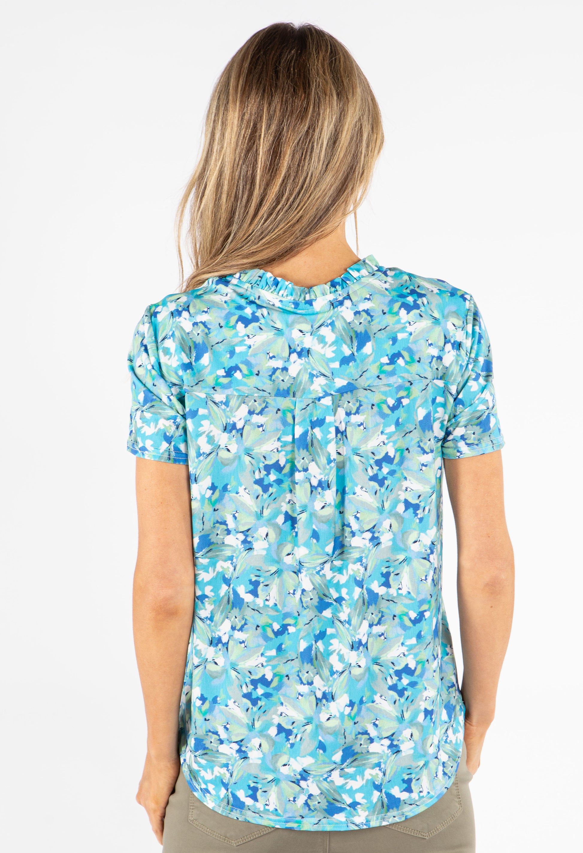 This floral print top features a V-neckline with ruffle accents and is crafted from stretchy material for a comfortable fit. It includes short sleeves, making it a perfect blend of style and comfort.