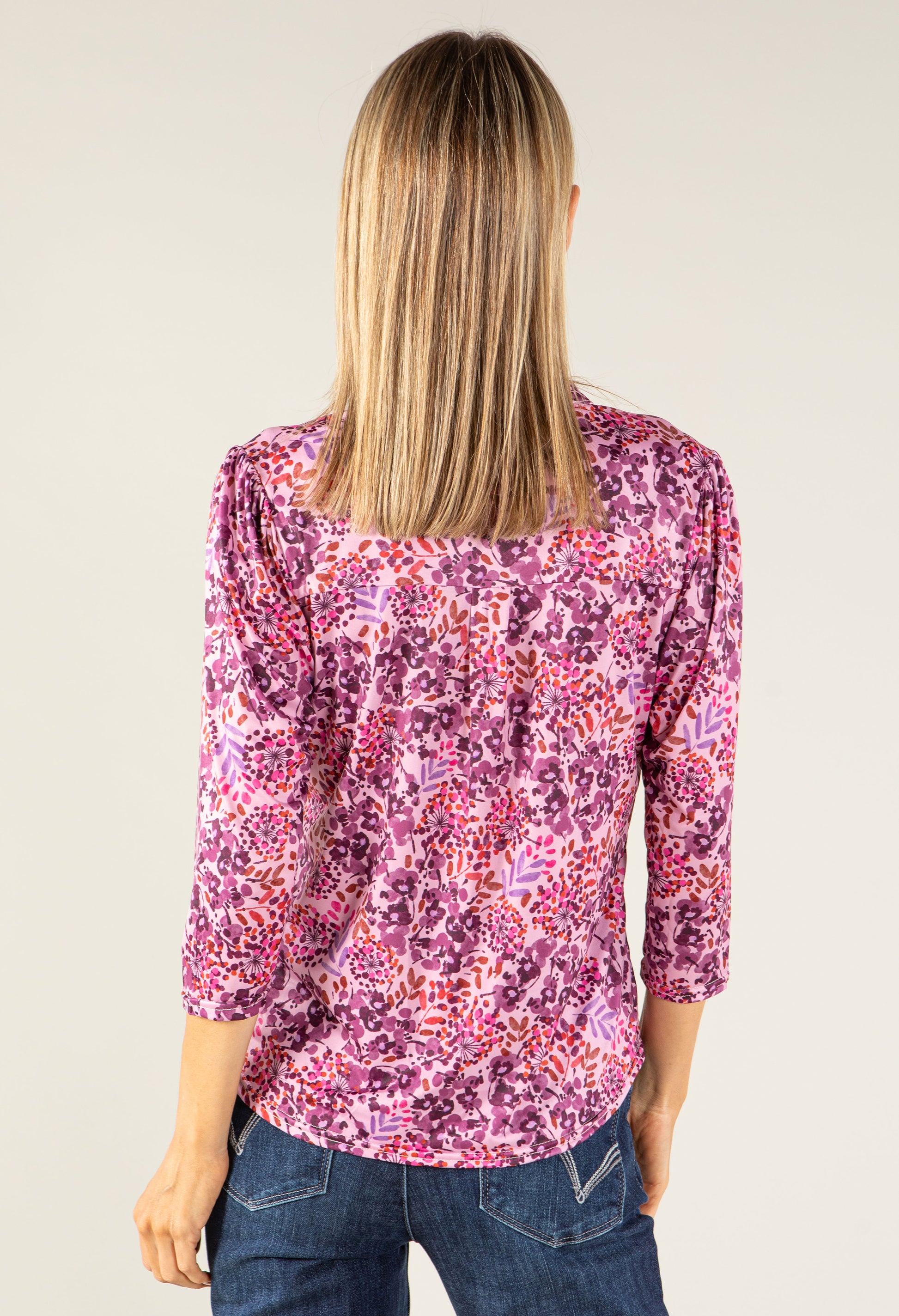 This Floral Print V-Neck Top features a flattering V-neckline and 3/4 length sleeves for a comfortable fit. Made from a stretch fabric, it includes a back yoke detail and is adorned with a beautiful floral print for a fresh, feminine look.