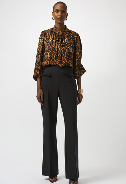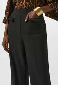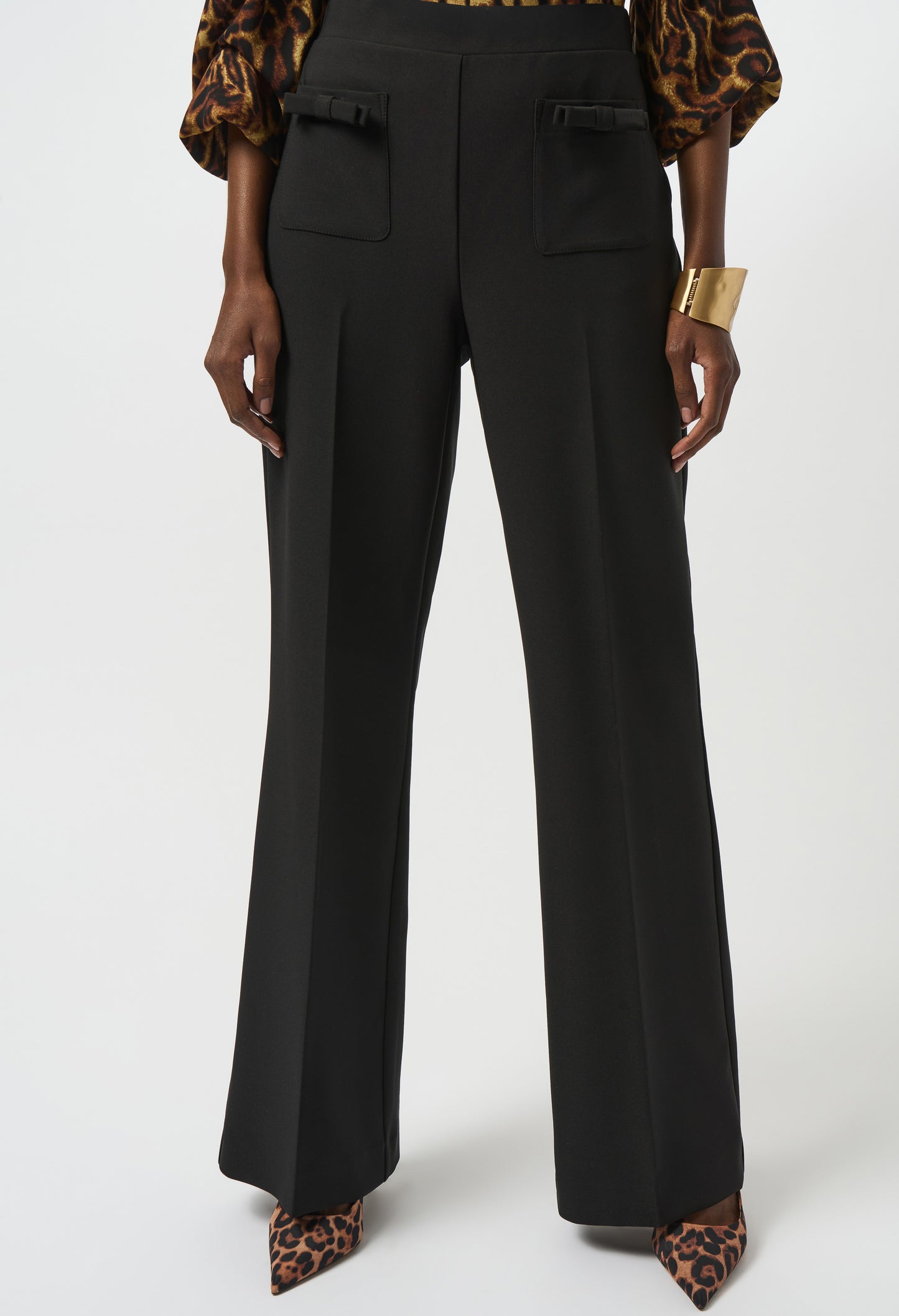Experience the perfect blend of sophistication and comfort with Joseph Ribkoff's wide-leg, full-length trousers. Designed for formal office settings, these mid-rise trousers feature practical pockets and a chic bow detail. The plain pattern and versatile business-casual style make them a wardrobe essential, seamlessly transitioning from professional meetings to casual outings. Elevate your fashion game with these must-have trousers.