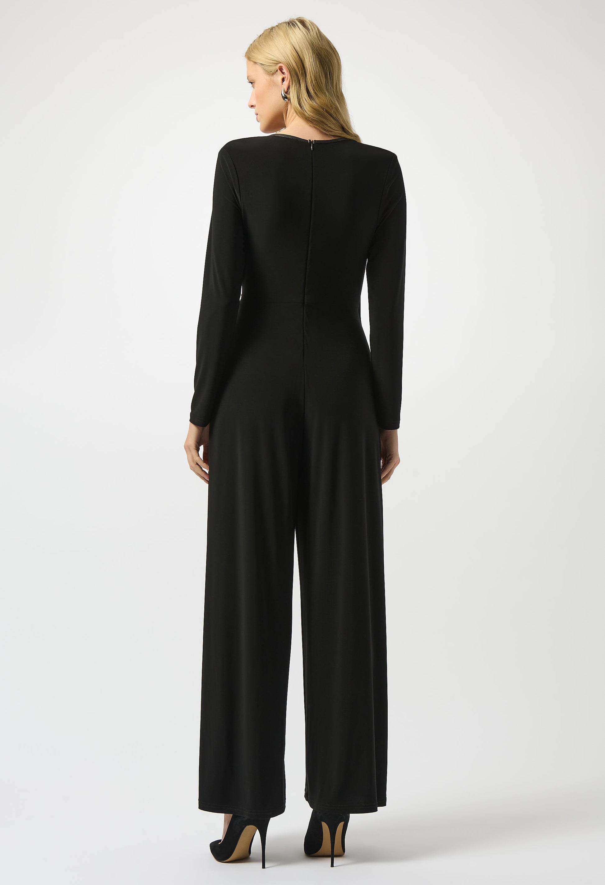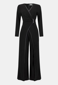 Step into sophistication with this full-length jumpsuit from Joseph Ribkoff. Designed with a flattering V-neck and long, straight sleeves, it exudes an elegant, sexy, and feminine style. Perfect for formal events or a night out, its belted waist and convenient zipper add both functionality and flair. Make a statement with this exquisite piece that seamlessly combines comfort and glamour.