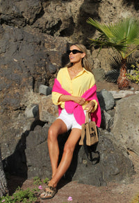 Lifestyle Image - Lemon: Knit, Sunglasses, Earrings, Shorts, Bag,