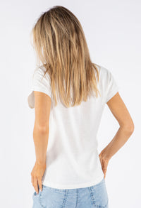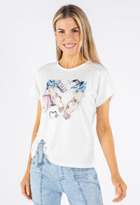 Stylish fine knit top with a flattering round neckline and trendy drop shoulder short sleeves. Features eye-catching graphic design enhanced with sparkling rhinestone accents. The distinctive front knot detail adds a fashionable twist to this versatile piece.
