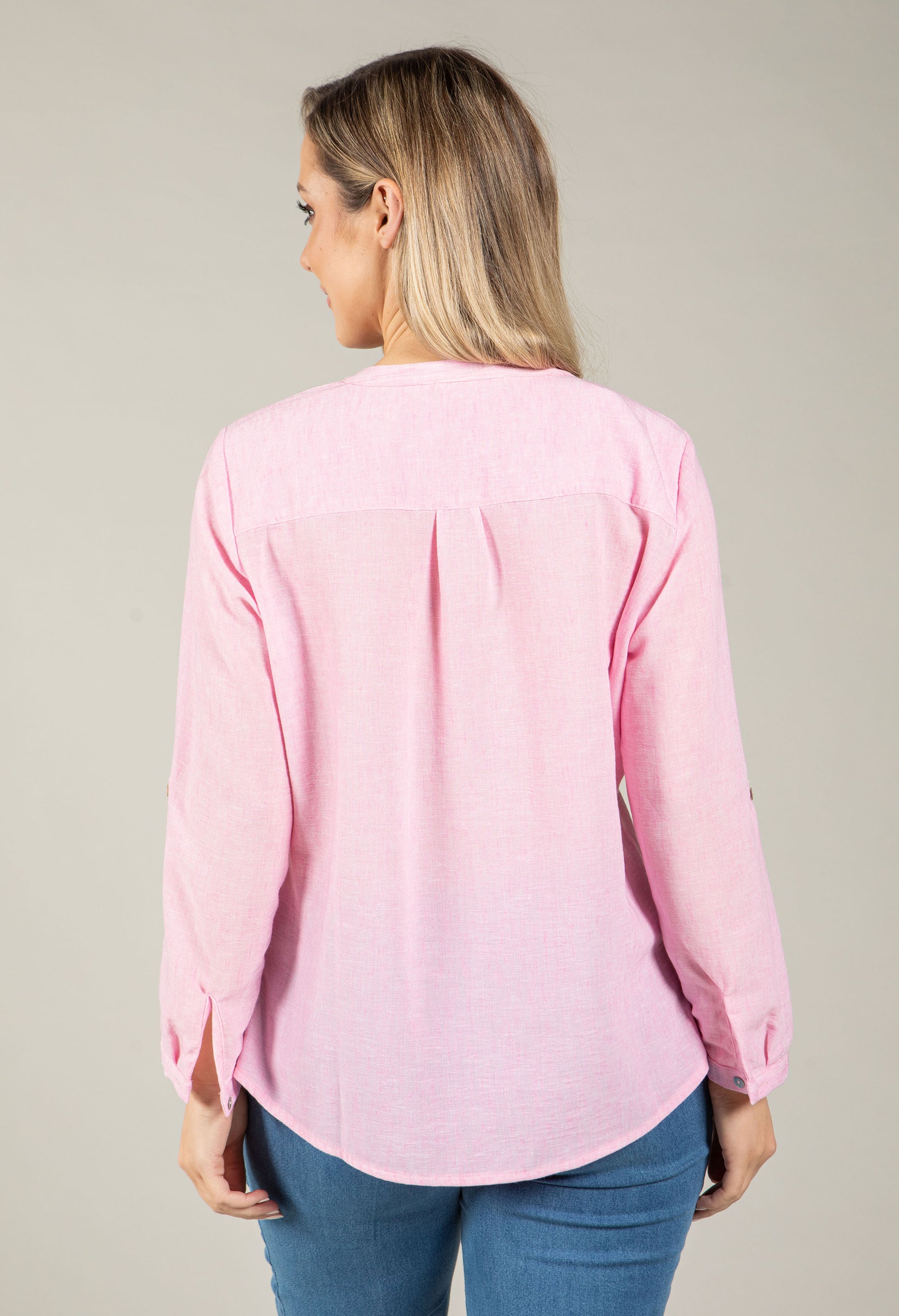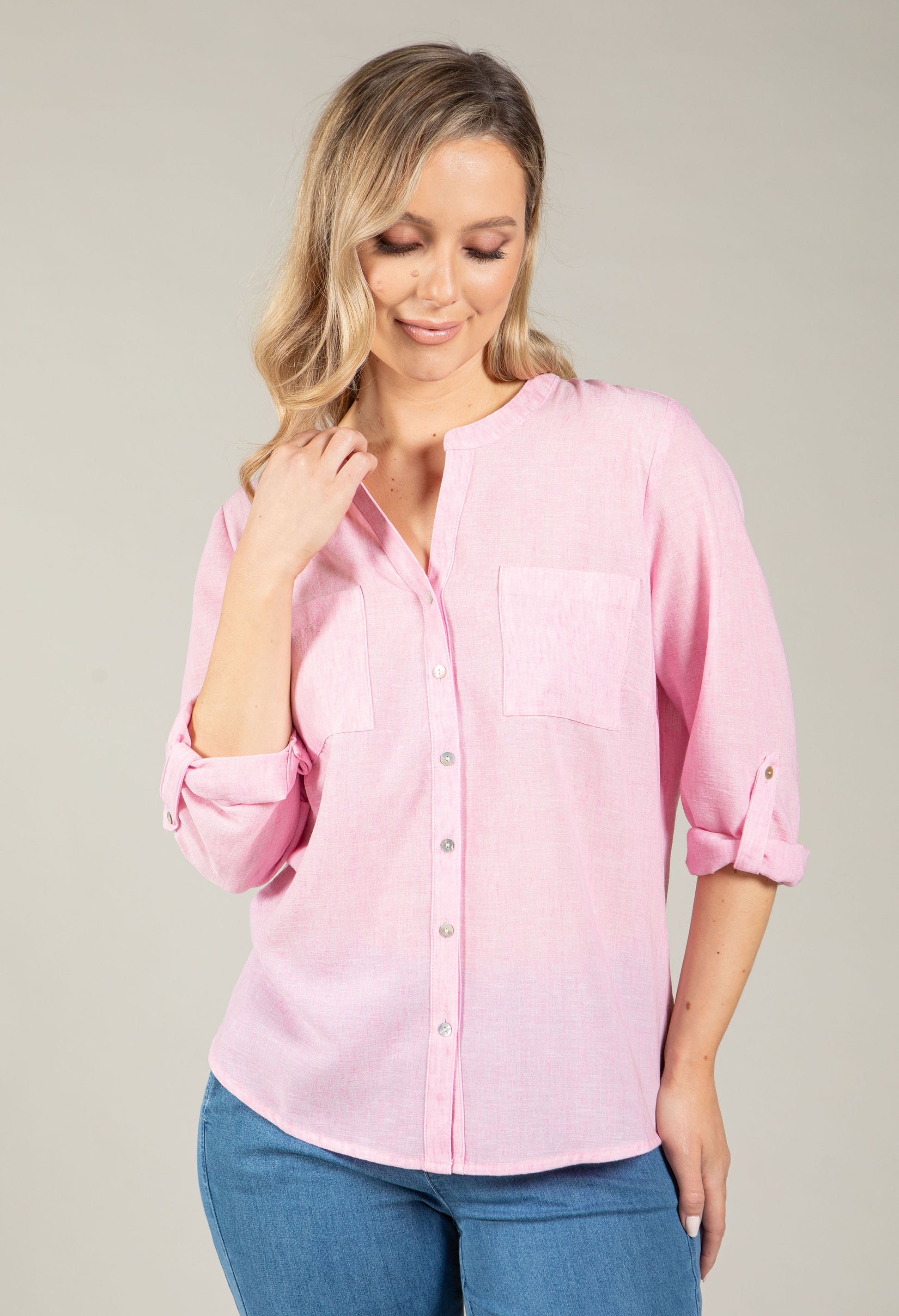 This linen-look blouse is your go-to for effortless style. Featuring a flattering V-neckline, three-quarter sleeves with buttoned cuffs, and handy front patch pockets, it's both practical and chic. The button closure and softly rounded hemline complete the relaxed, polished look you'll love wearing again and again.