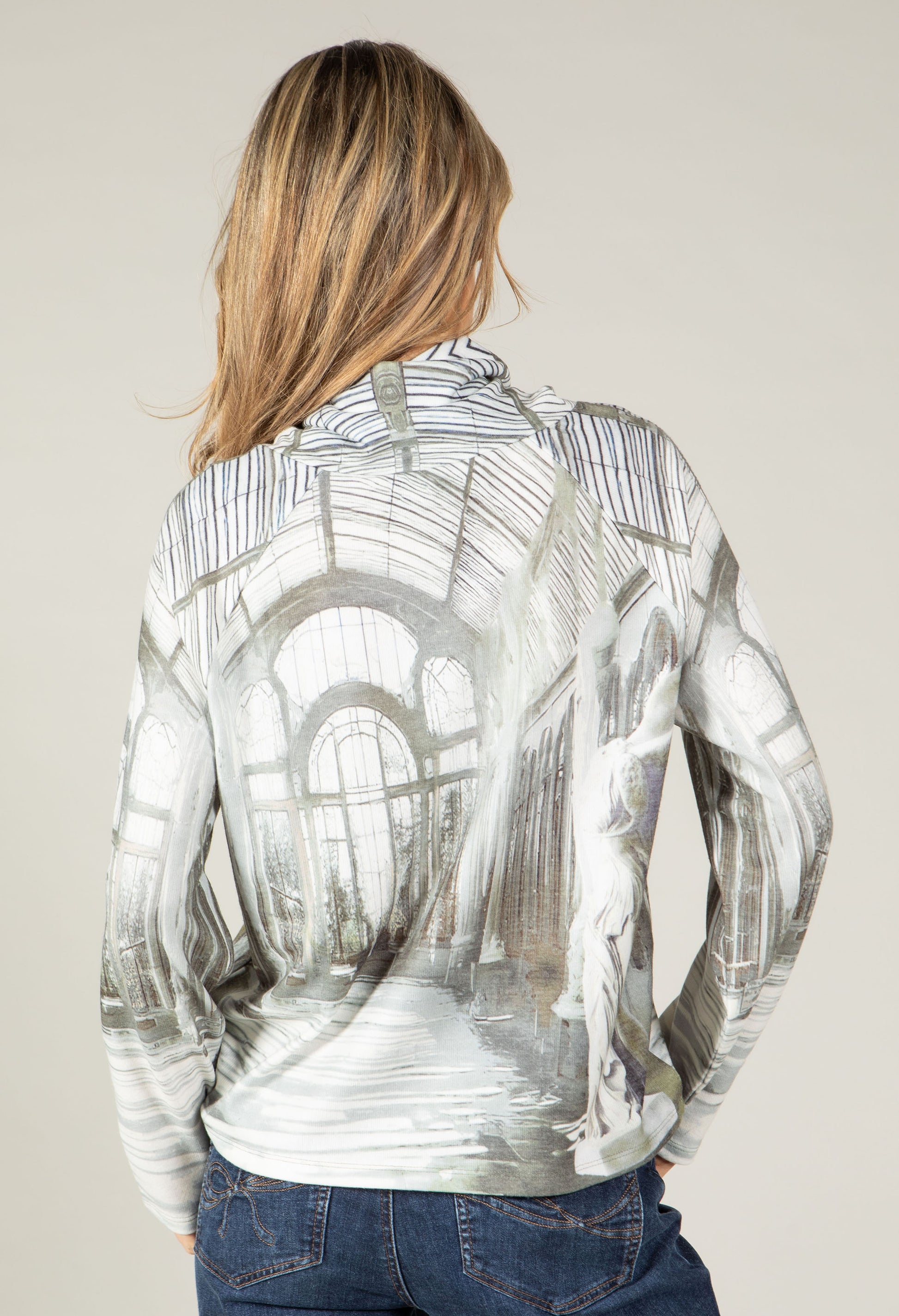 Elegant turtleneck sweatshirt made from flowing viscose with shiny rhinestones and a modern gallery print – for style-conscious trendsetters.