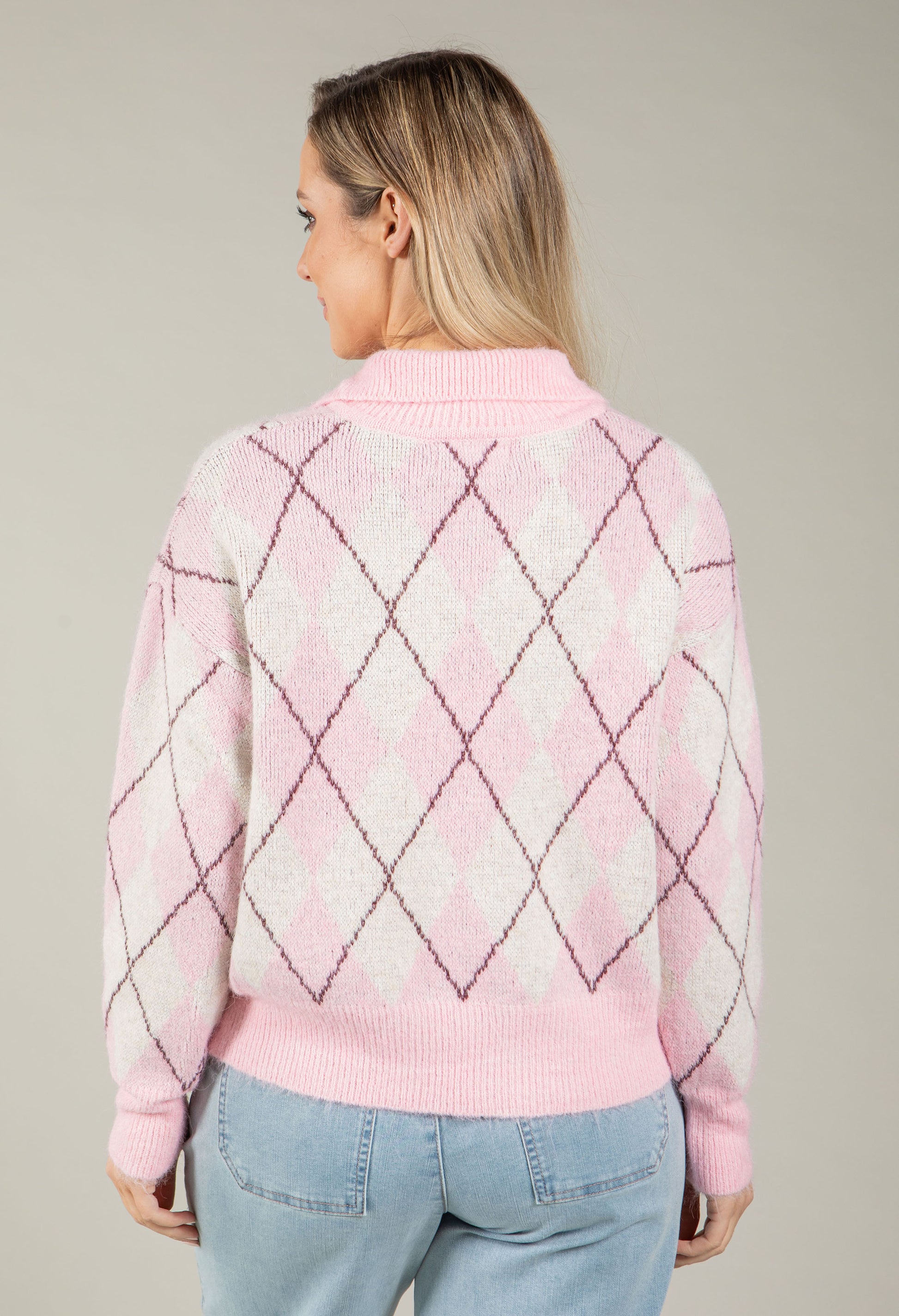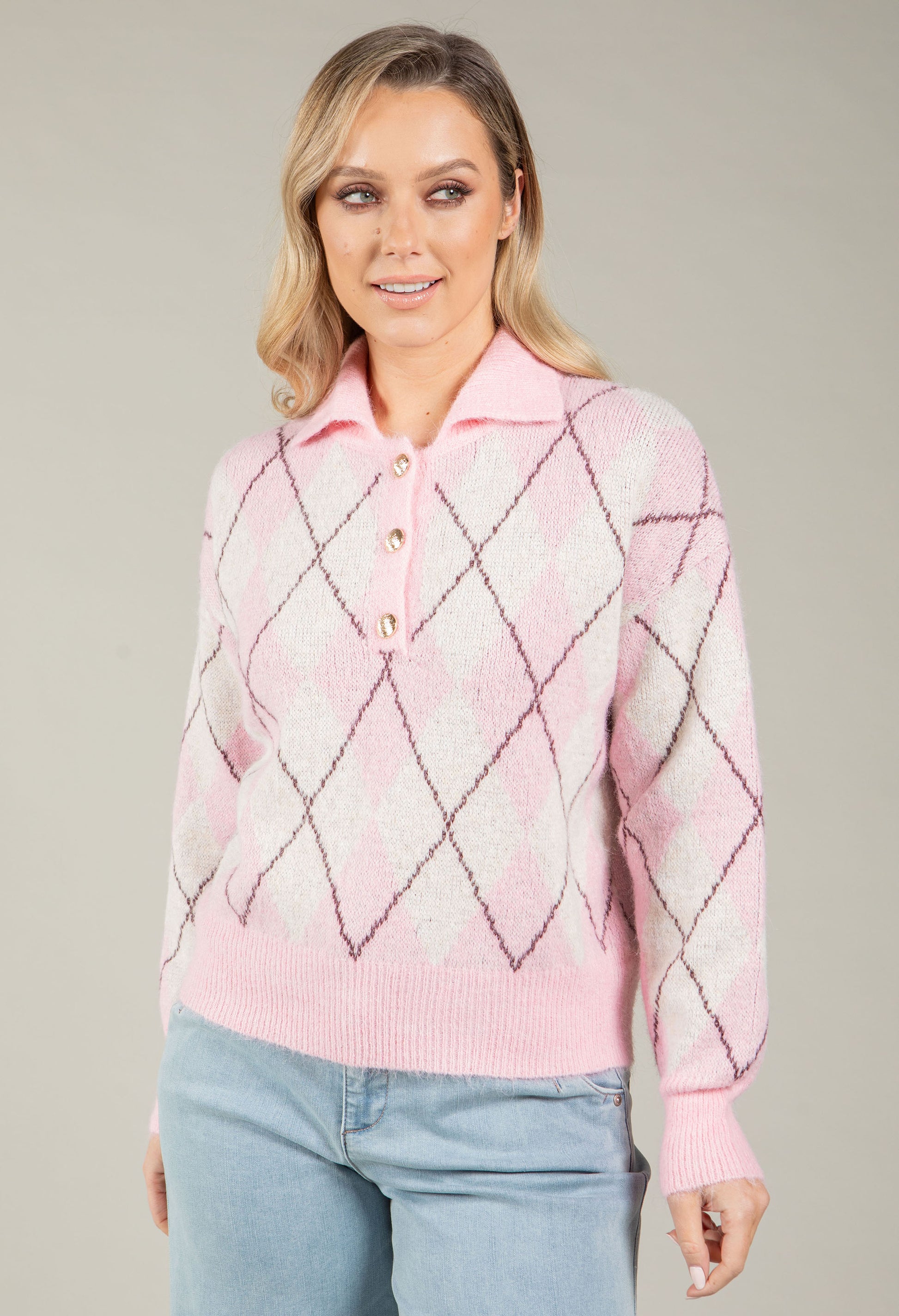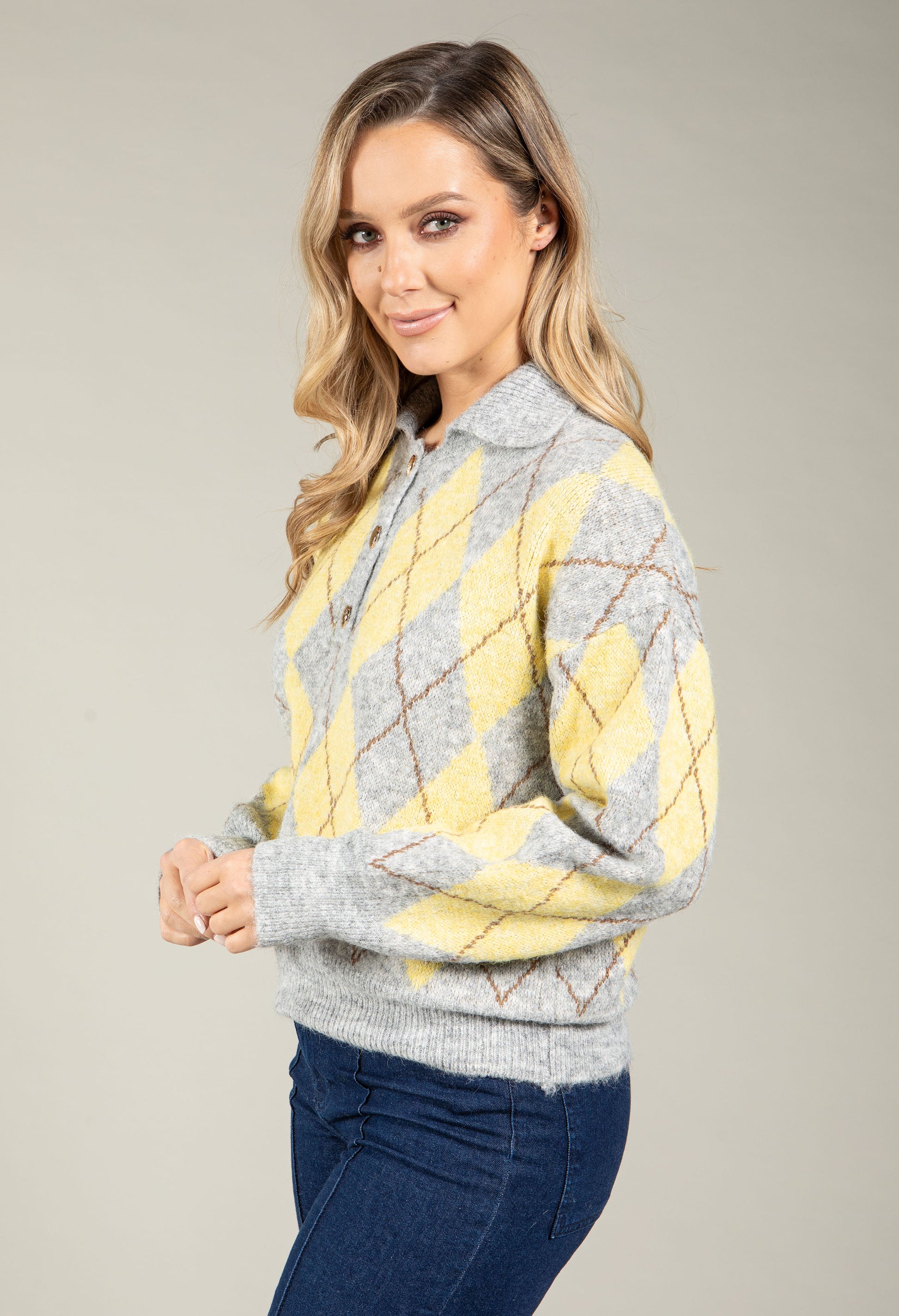 This sophisticated argyle jumper features long sleeves, a collared neckline, and striking gold button detailing for added elegance. The soft-touch fabric drapes beautifully while ribbed collar, hem, and cuffs keep everything in place. A timeless piece that elevates any casual or smart-casual look.