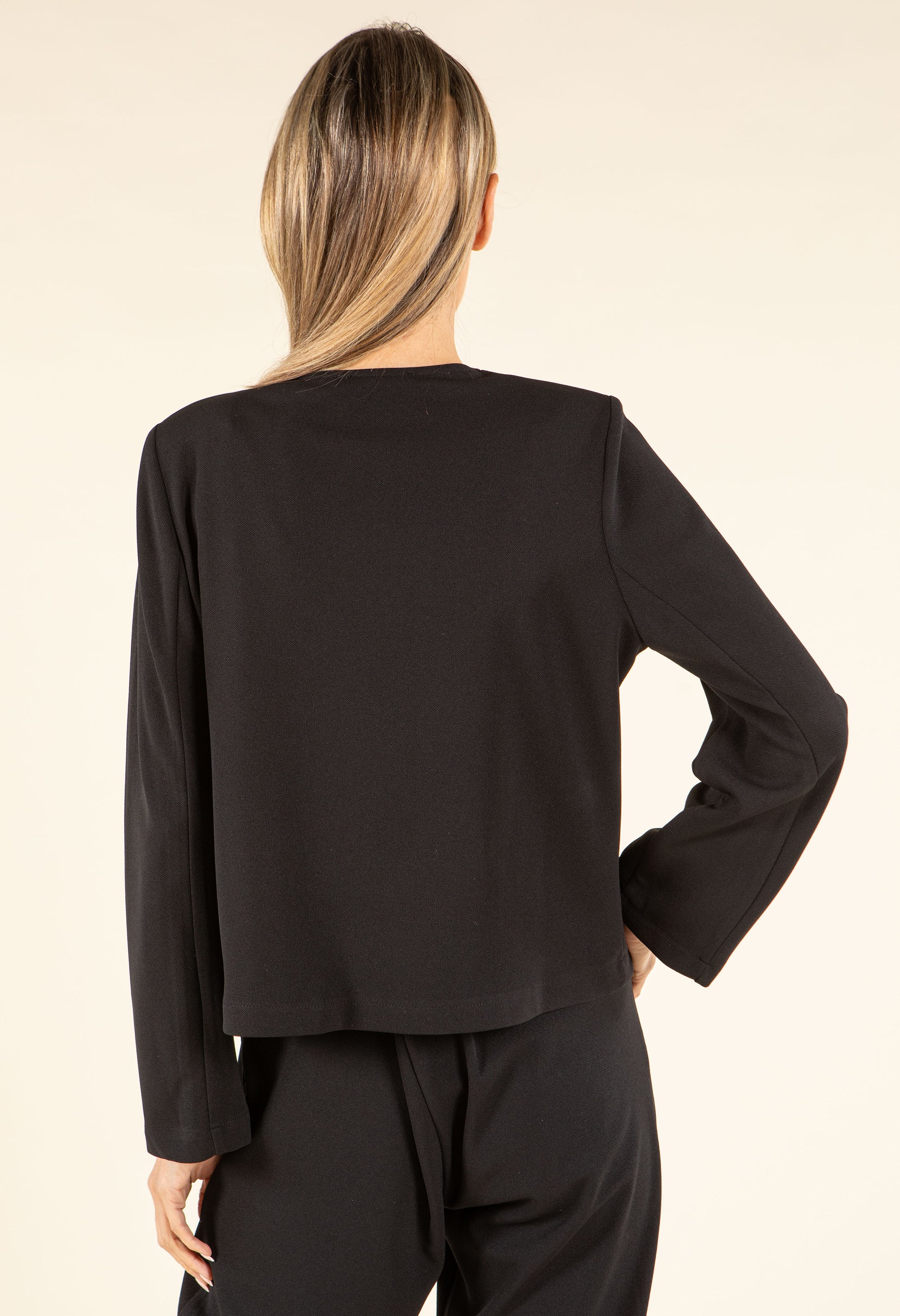 This gold detail jacket offers a round neckline, structured shoulder pads, and long sleeves made from stretch fabric, featuring a clasp closure for a sleek, refined finish.