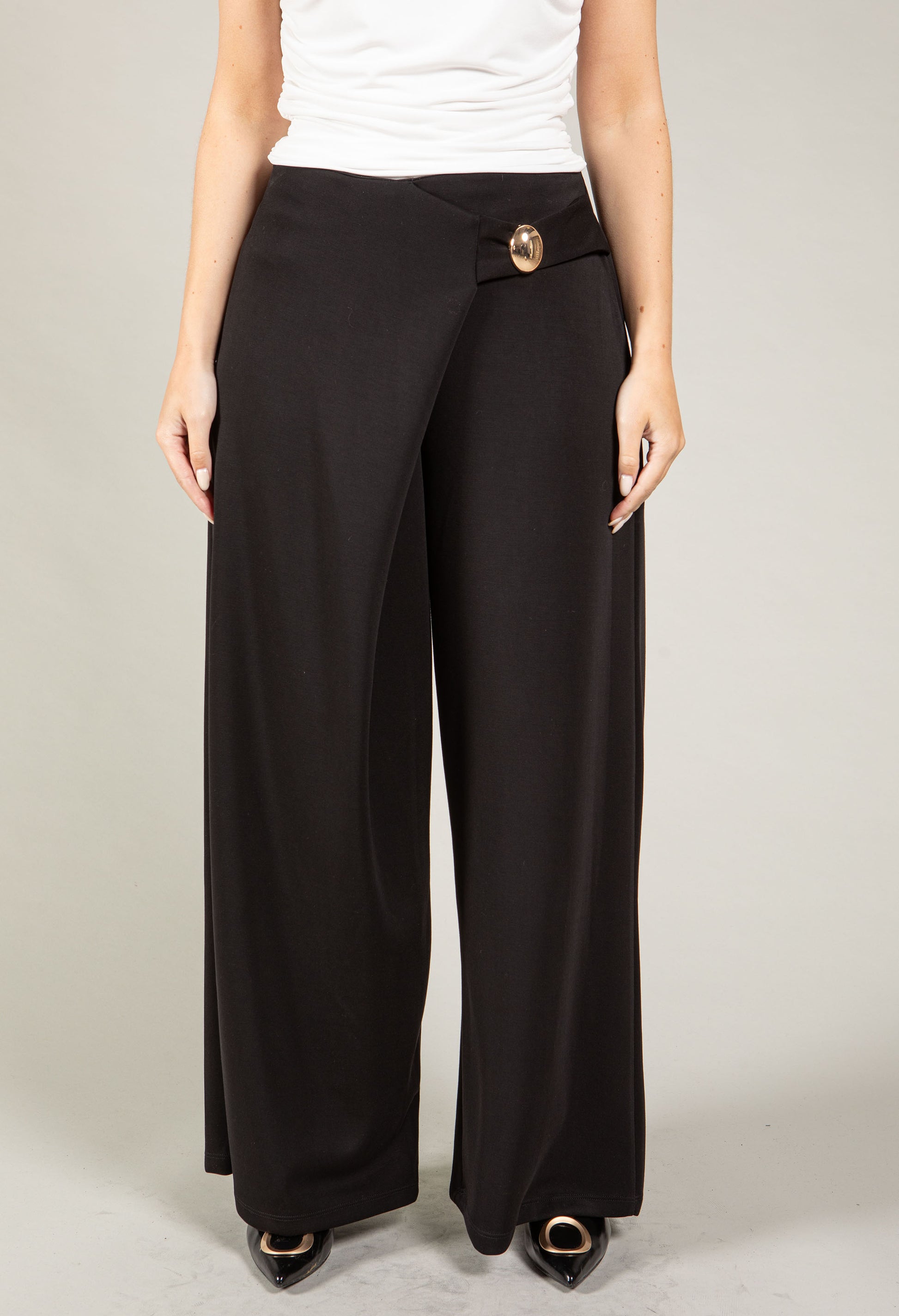 These wrap-style trousers feature a wide-leg silhouette and an elasticated waistband for comfort. Crafted from stretch material, they are finished with elegant gold detailing and designed as a free size for versatile wear.