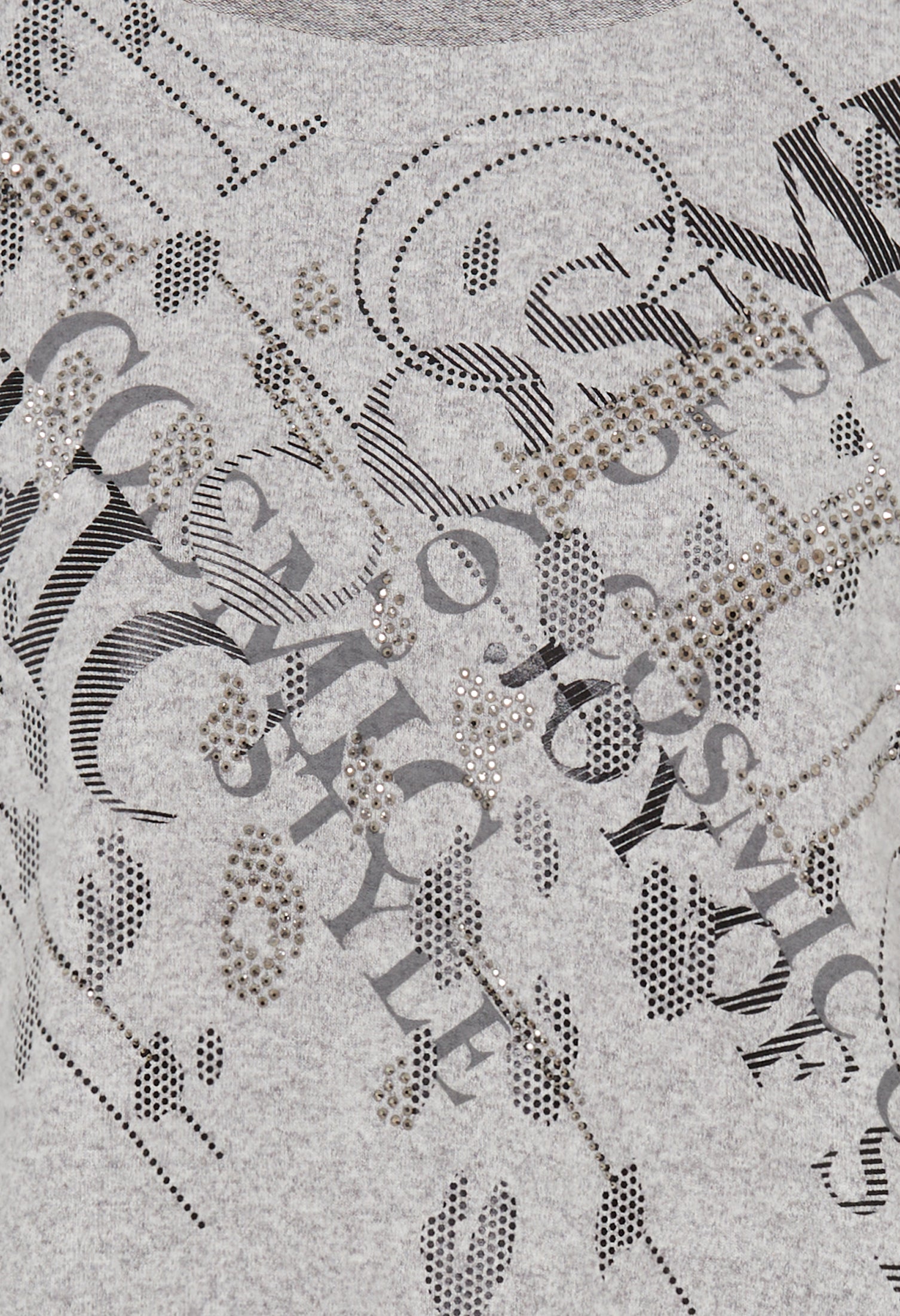 Stay effortlessly chic with this grey long sleeve top featuring a bold text-inspired graphic design across the front. The relaxed fit and soft round neckline make it perfect for everyday wear, while the subtle shimmer detailing in the print adds a touch of modern edge. Whether paired with jeans for casual days or dressed up with tailored trousers, this versatile top strikes the perfect balance between comfort and style.