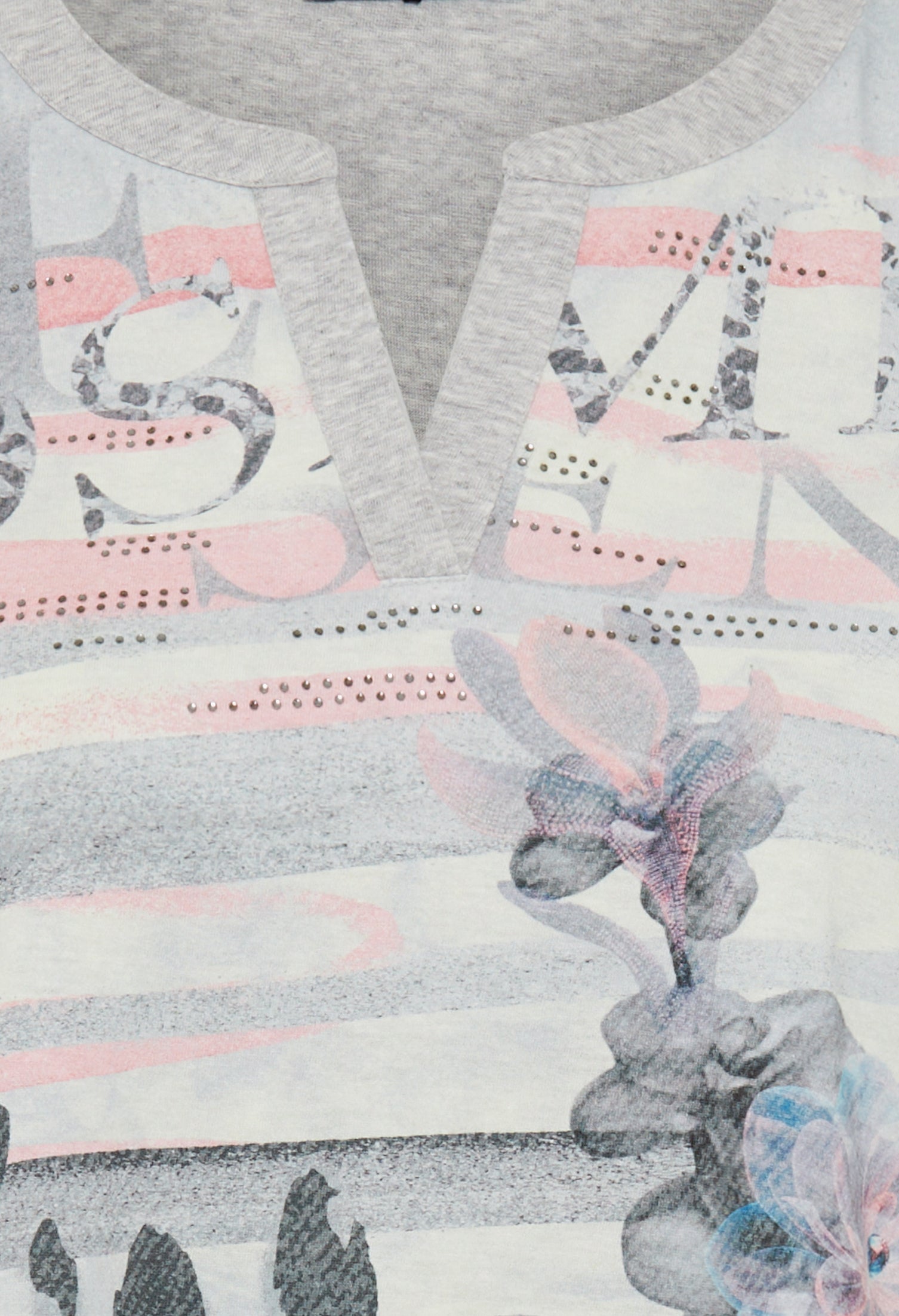 Elevate your casual wardrobe with this stylish grey long sleeve top, featuring a unique blend of prints and textures. The design combines soft floral accents, subtle text details, and a bold leopard-inspired pattern for a modern, artistic look. Crafted from a comfortable lightweight fabric, it’s finished with a chic notched V-neckline that adds a touch of sophistication. Perfect for pairing with jeans, trousers, or layering under a jacket, this versatile top effortlessly balances comfort and style.