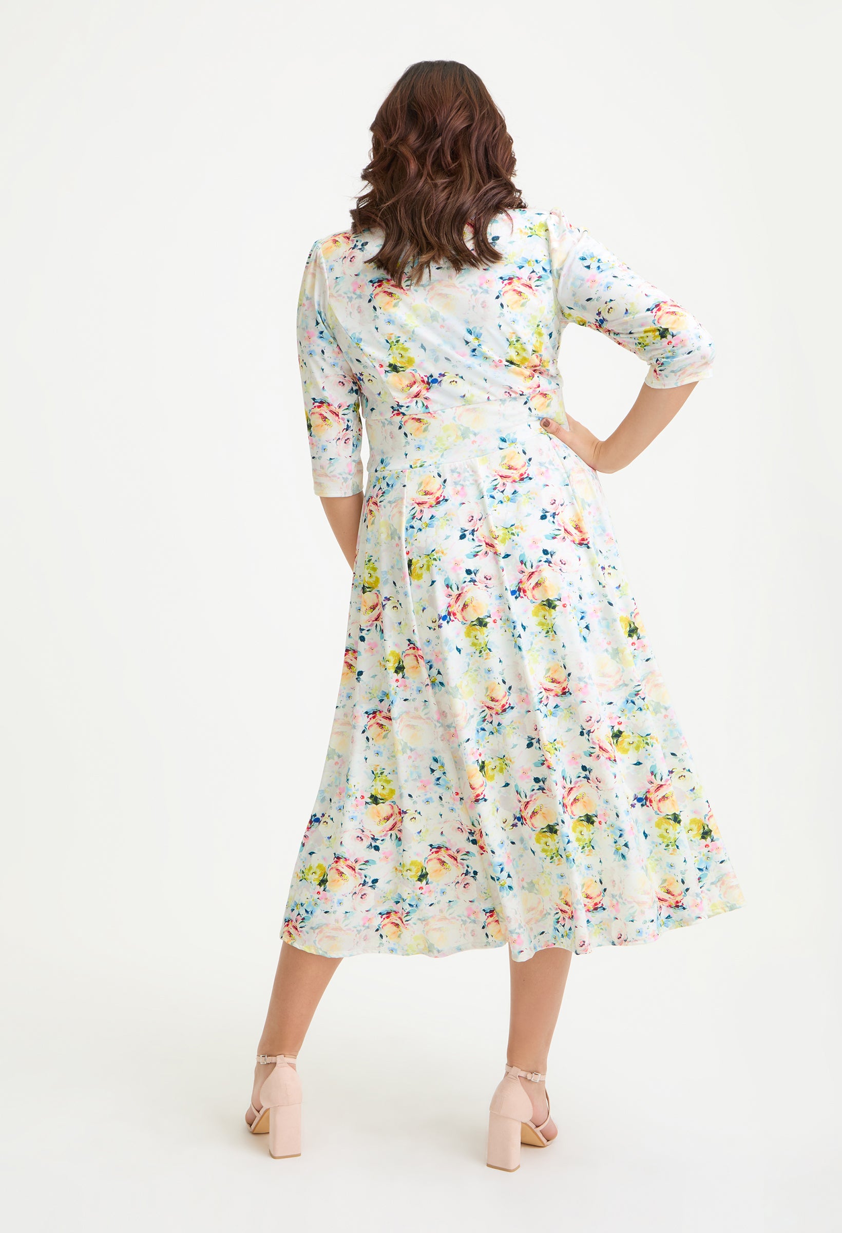 Enhance your shape with our Helena Curve+ Midi Dress. The flattering wrap v neck bodice is supported by our signature MagicBand® inbuilt waist corset for maximum comfort. The fully flowing skirt has pockets and a tapered, swishy design, while the 3/4 sleeves and detachable shoulder pads add a touch of elegance. Made with "Silk Touch Crepe By Scarlett & Jo" ®, this dress is truly breath taking to wear.