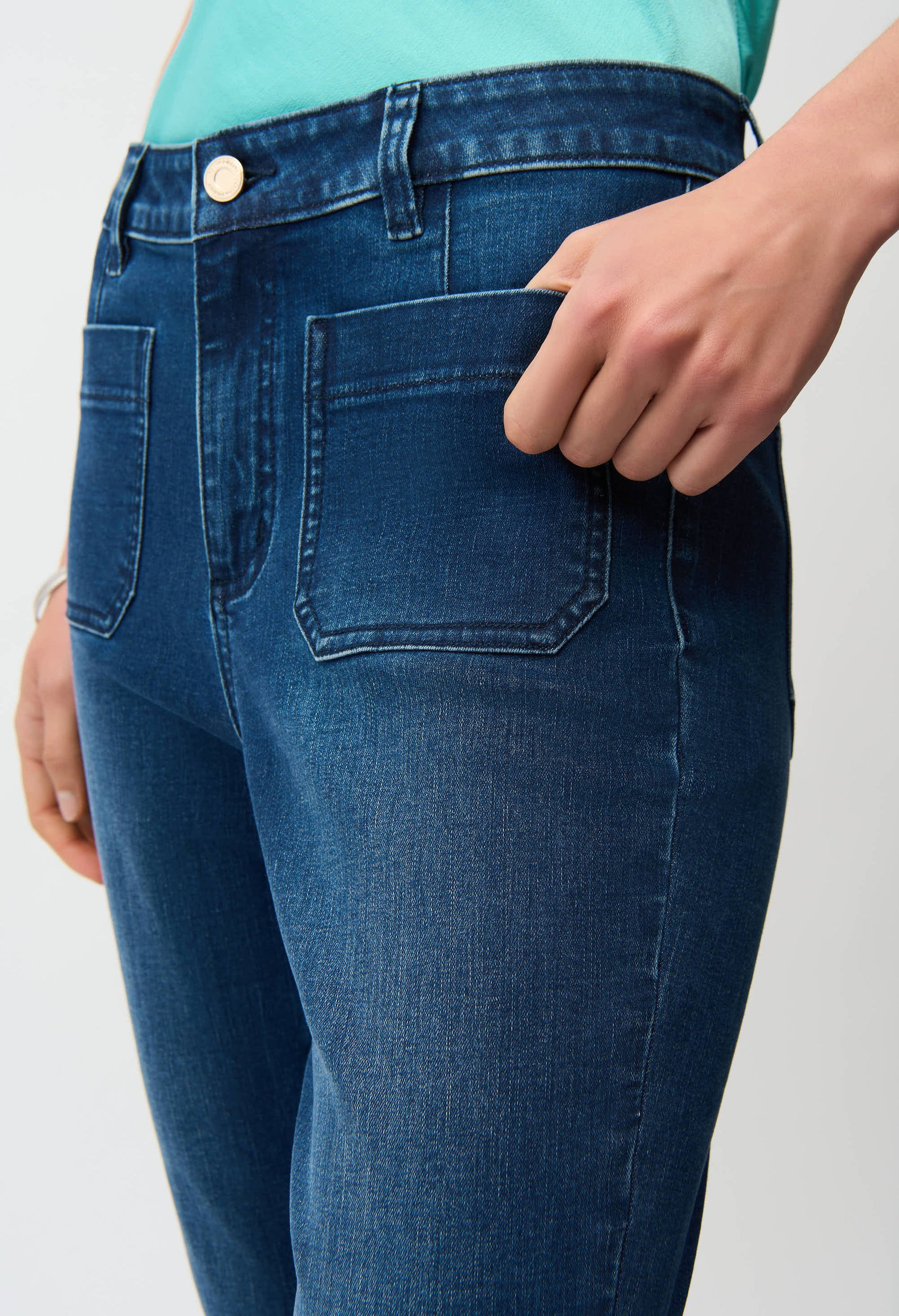 Experience the perfect blend of comfort and style with Joseph Ribkoff's high-waisted flare jeans. These full-length bottoms feature a sleek, plain design that's ideal for both casual and office settings. Crafted with buttoned details and practical pockets, these jeans offer a versatile addition to your wardrobe, seamlessly transitioning from business casual to everyday wear.