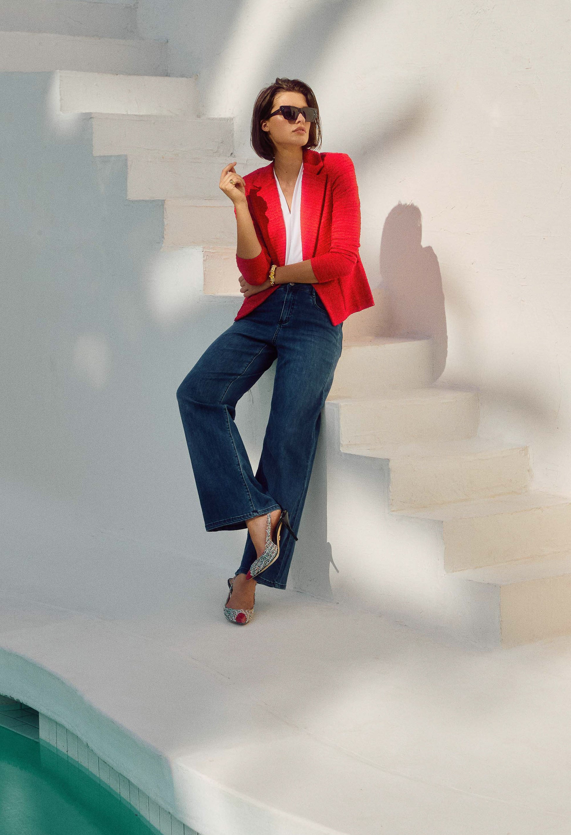 Discover the ultimate blend of comfort and style with these Joseph Ribkoff wide-leg jeans. Designed with a flattering high-waisted fit, these full-length bottoms are perfect for both casual and semi-formal occasions. Featuring convenient pockets, a secure buttoned and zipper closure, these jeans effortlessly combine practicality with a chic, business-casual aesthetic. Upgrade your wardrobe with a versatile piece that promises both elegance and ease.