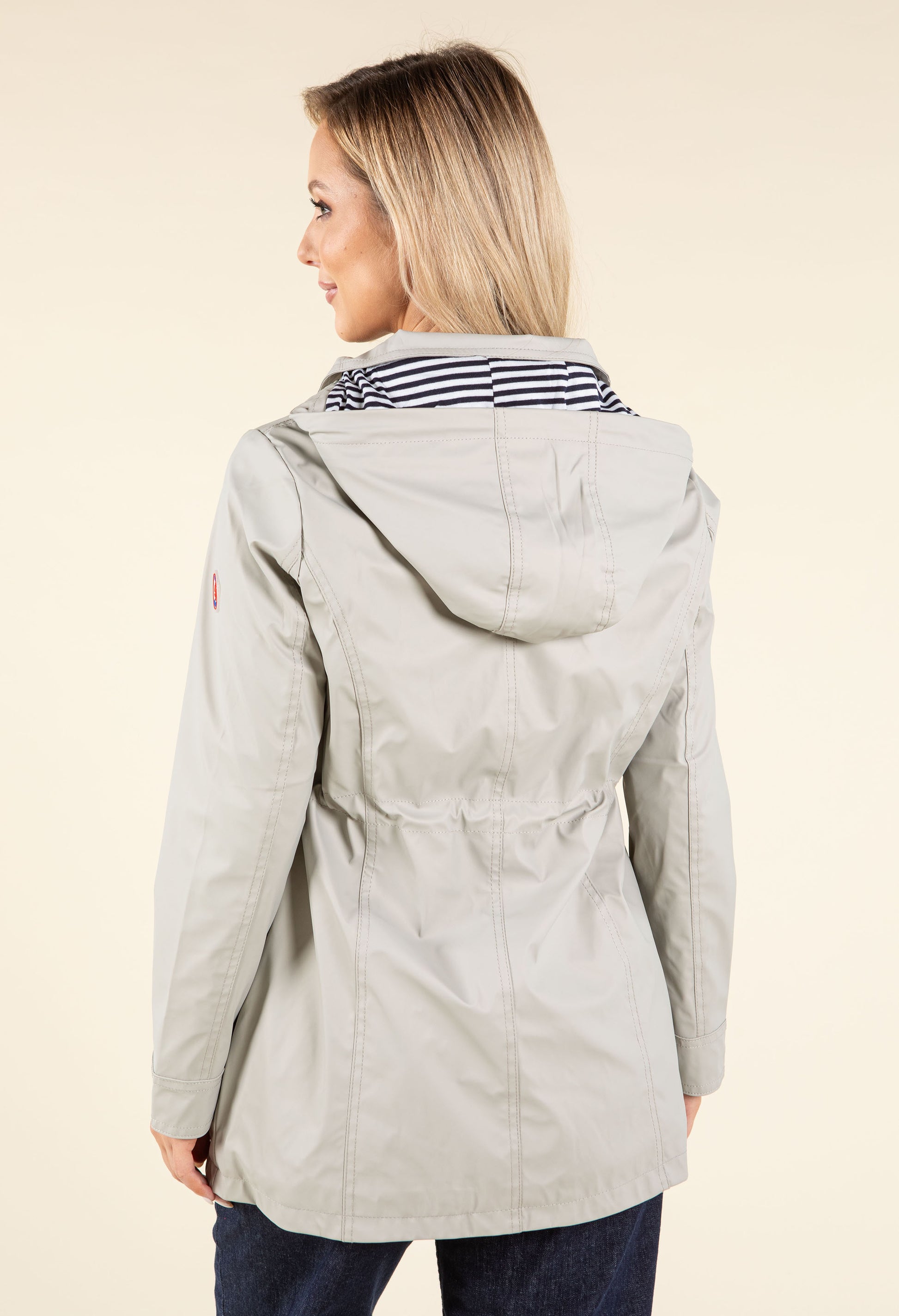 This Rain Jacket features a button and zip front, a removable hood, convenient side pockets, and an inside pocket. The waist and hood have adjustable drawstrings, and the coat is fully lined for added comfort.